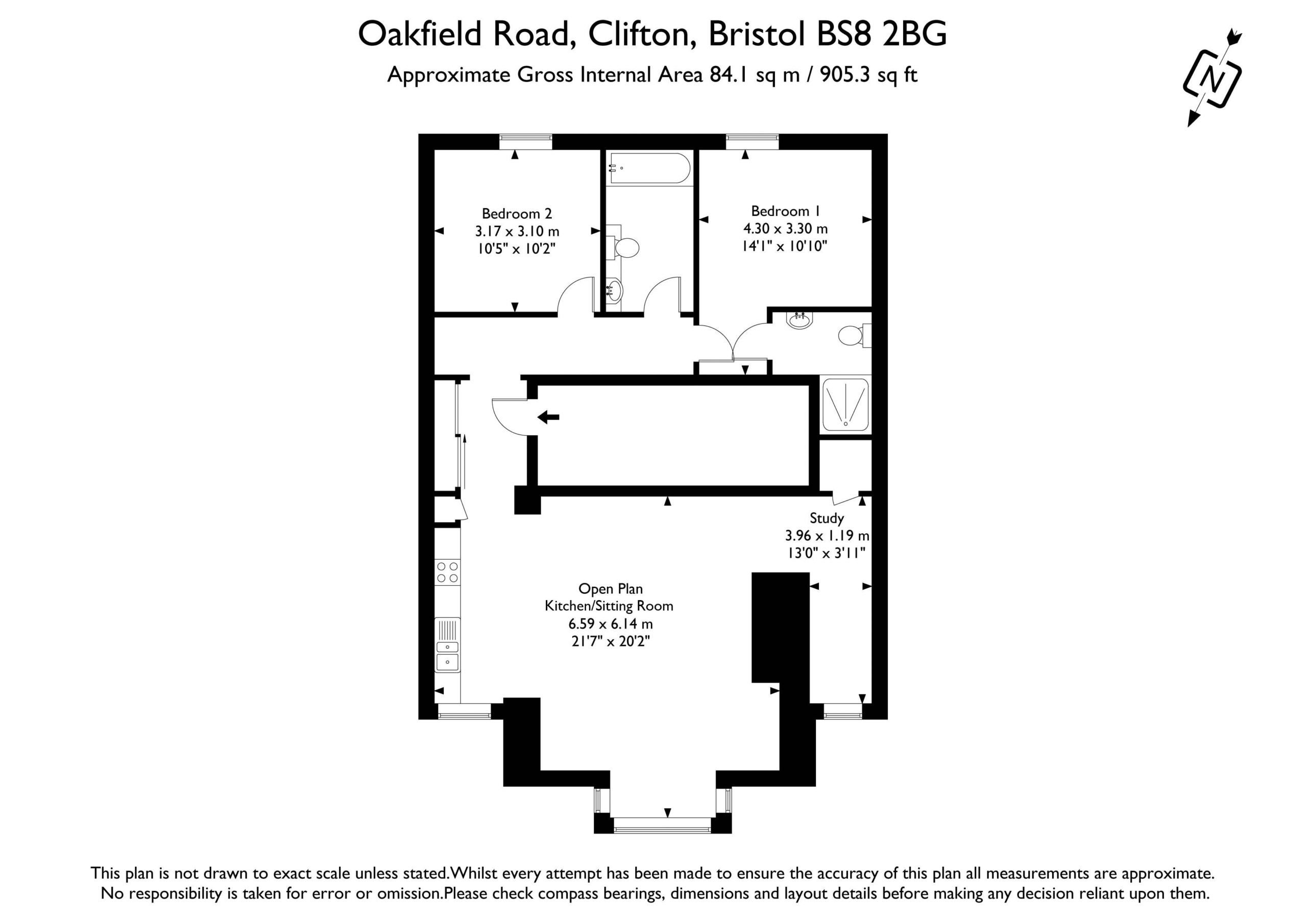 A beautifully converted mid-Victorian, 2 double bedroom, 2 bath/shower room, with study, first floor apartment. Converted in 2017 with attractive ashlar stone and square bay windows to front. Enjoying a quiet position yet within easy access of Whiteladies Road. No onward chain. A pair of substantial Victorian houses which were converted to a high standard in 2017 forming the end of a terrace of houses historically known as ‘Brighton Park’. There are 8 flats across the two buildings with 4 on each side. High ceilings throughout with wooden floors in the kitchen, sitting room and hallways. Spacious principal reception room open plan to a modern fitted kitchen. Excellent access from the road with just two steps from the pavement up to the ramped entrance with wider than average hallway, doors and lower level lighting improving accessibility. Notable for offering period charm but with a contemporary finish inside with above average levels of efficiency via the use of secondary glazed panels on the windows, thermal and acoustic insulation to satisfy building regulations and a modern gas fired central heating system. Communal bike and bin store. A highly usable study area adjacent to the sitting room. No onward chain making a prompt move possible.