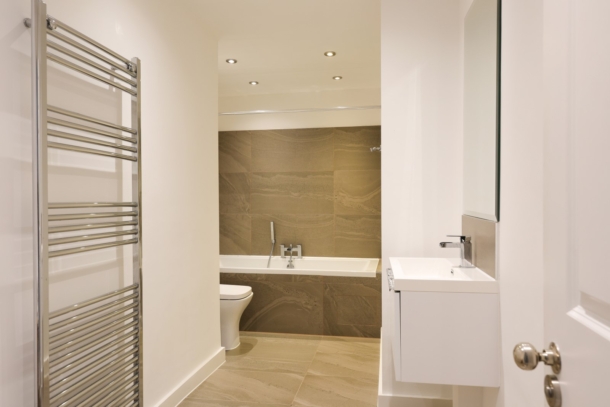 stylish tiled flooring, wall mounted wash hand basin with stainless steel tap over, stainless steel towel/ radiator, low level wc with dual flush, bath cubicle with stainless steel taps and wall mounted shower head over, extractor fan, inset ceiling downlights, cupboard housing the Worcester combination boiler thus providing the entire apartment with gas central heating.