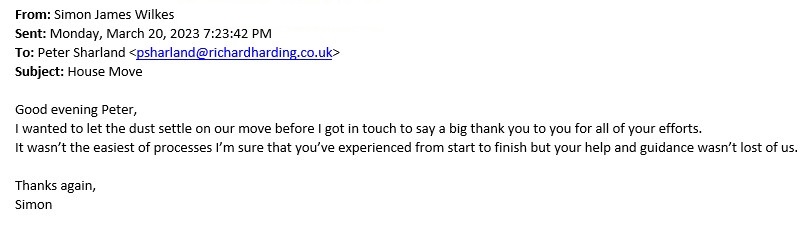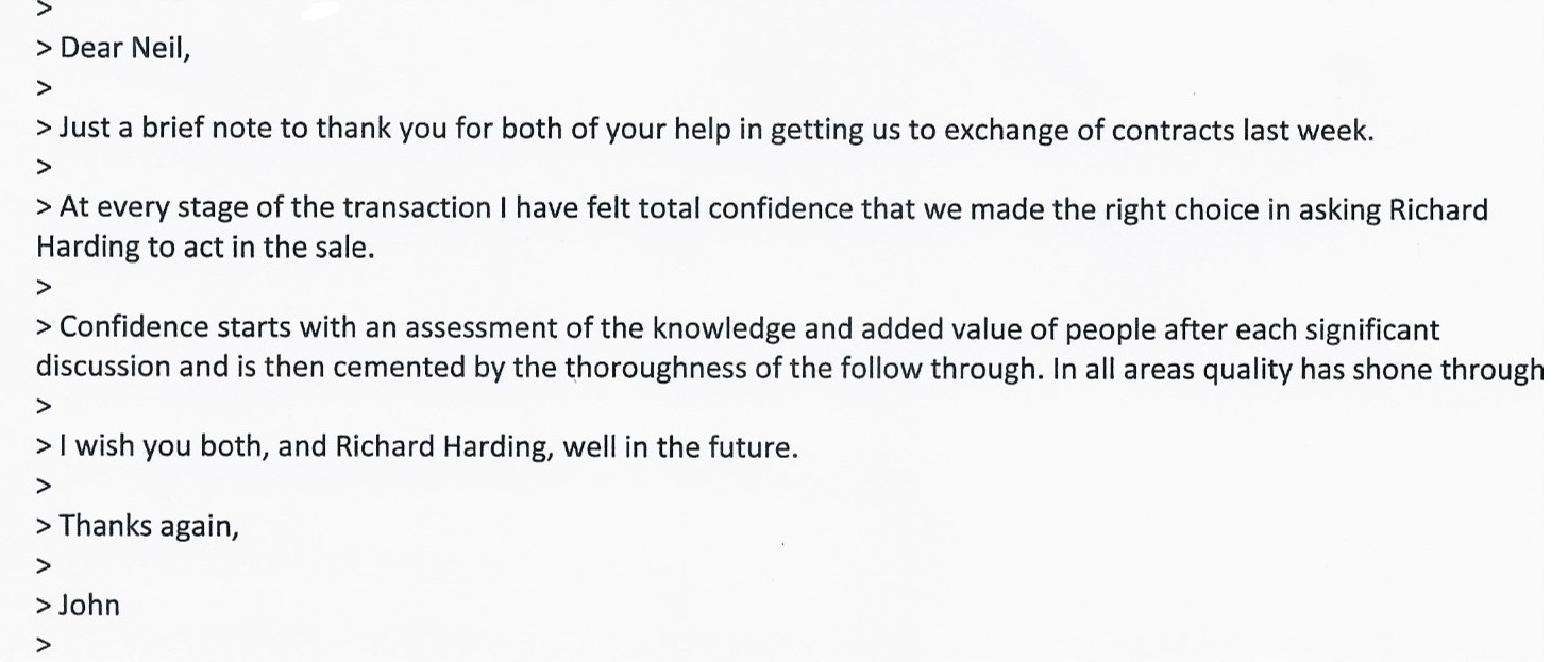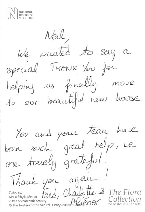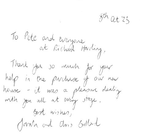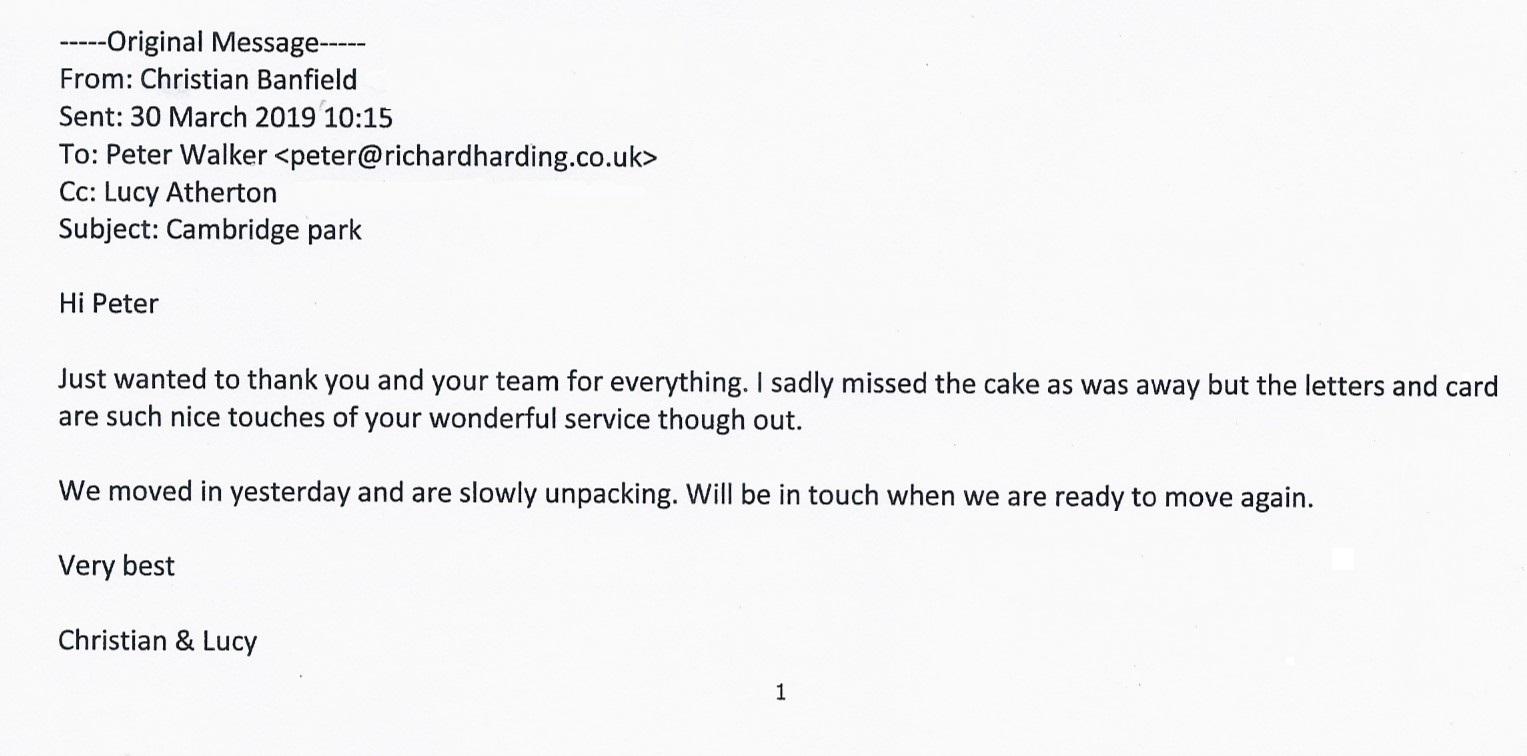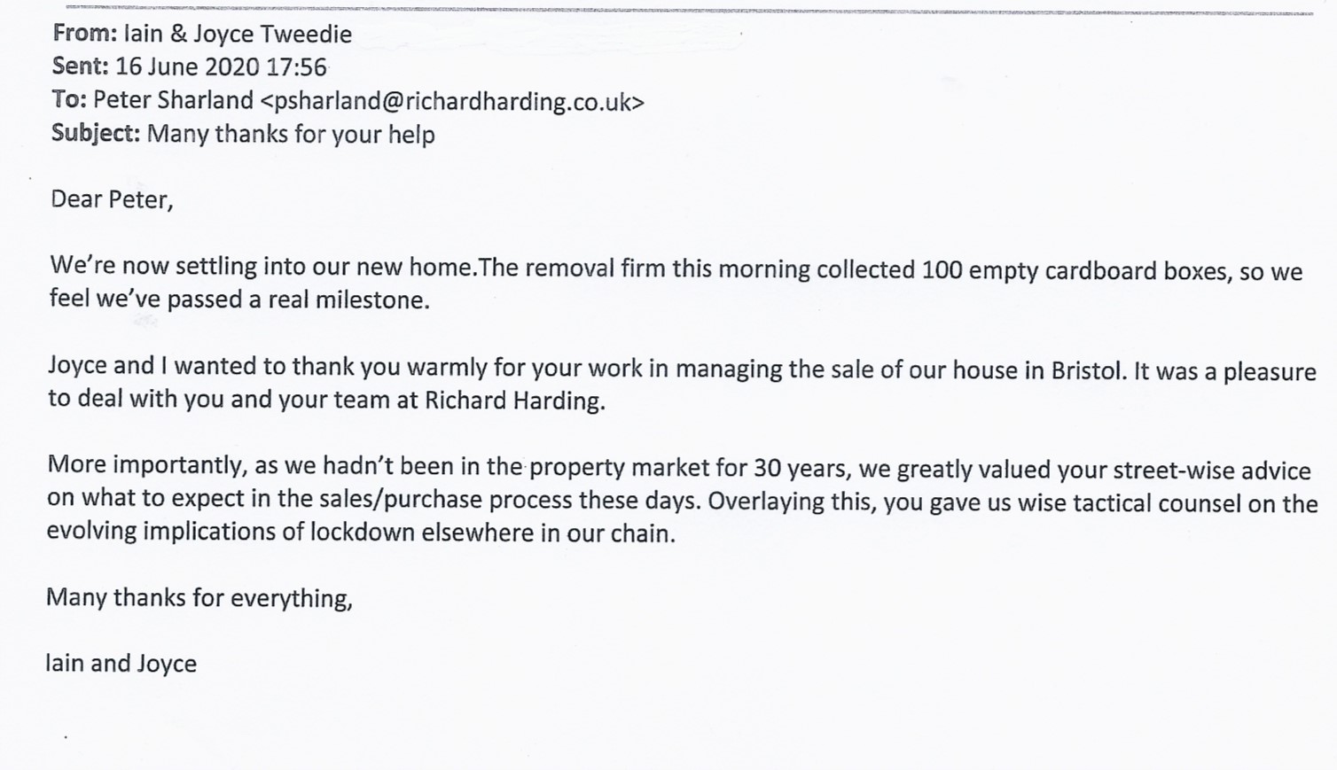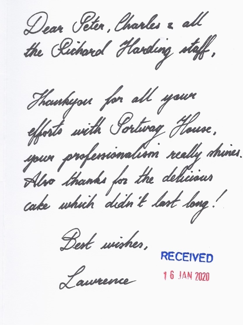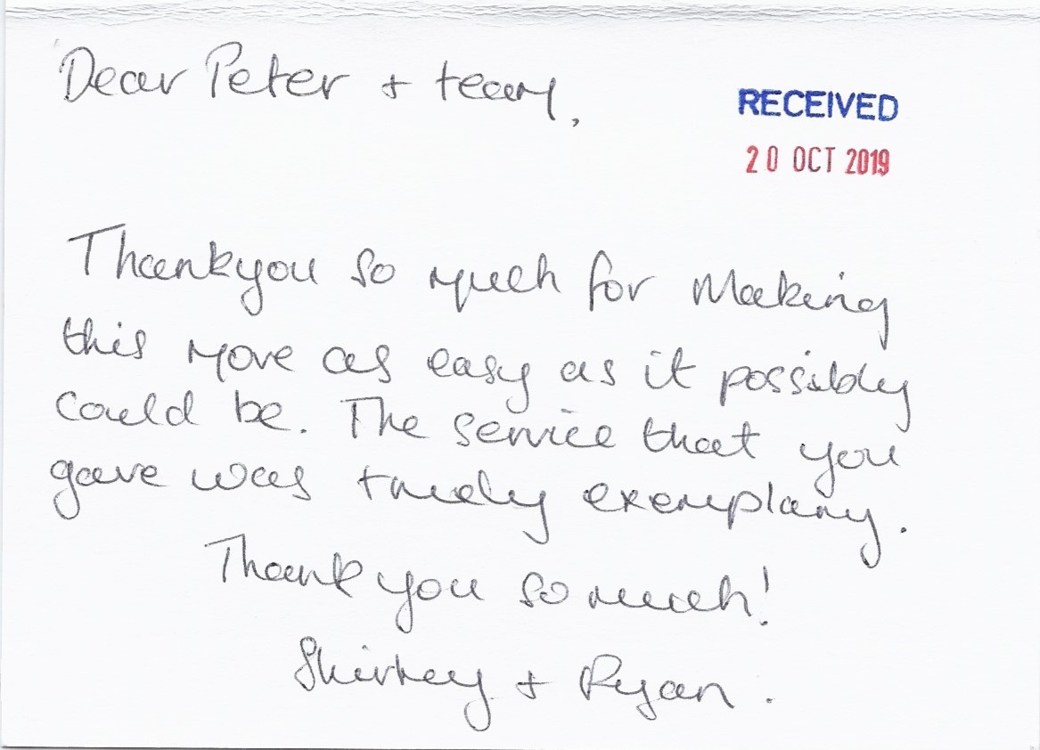 You are welcome to inspect any of the original letters, cards and emails which are held on file in our office or speak to any one of our clients – with their permission – regarding their personal experience of moving with Richard Harding. These testimonials date from the present back to our early years so that you can see we have consistently maintained high standards.