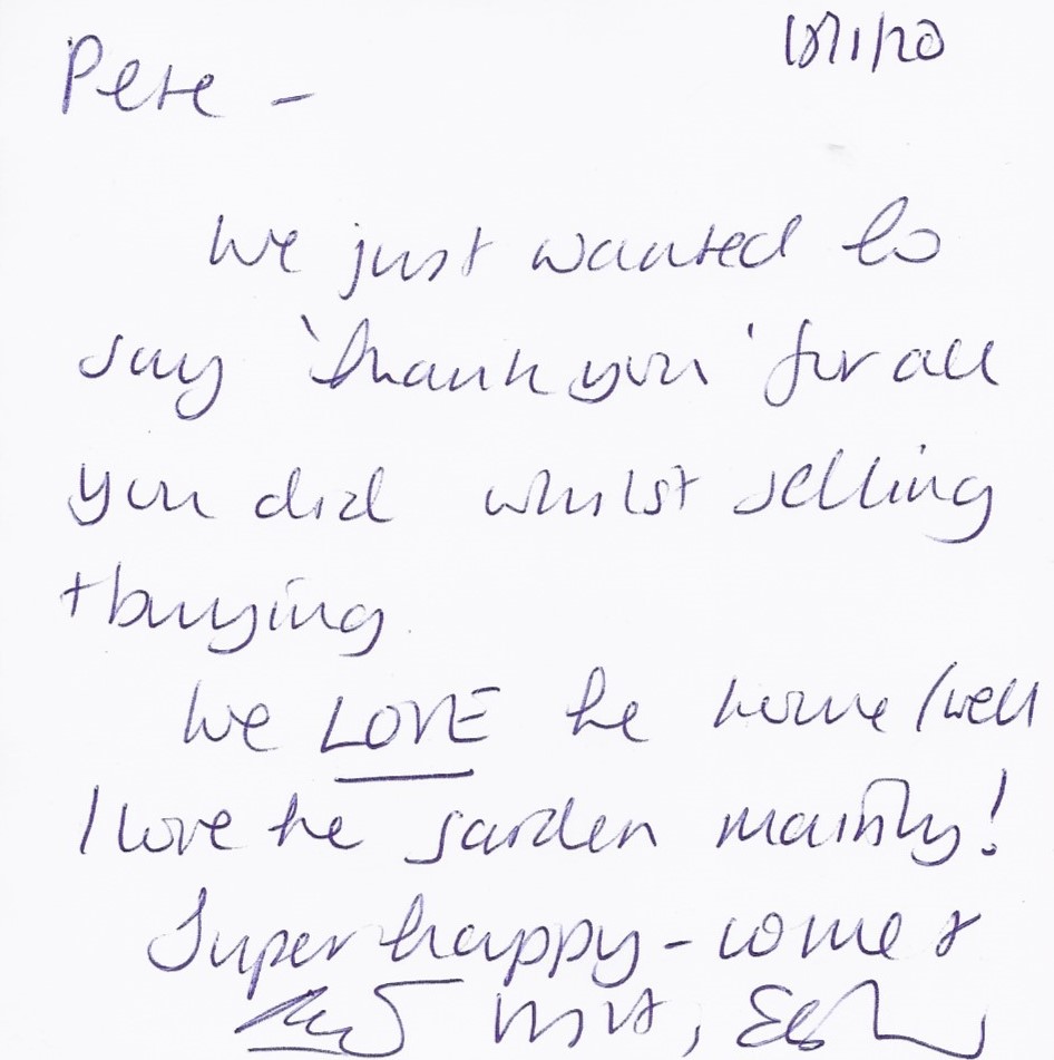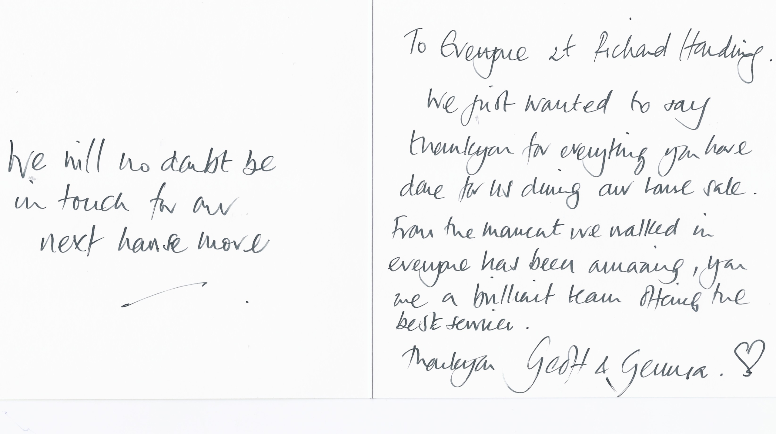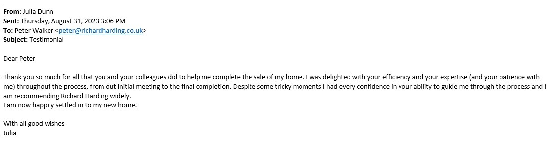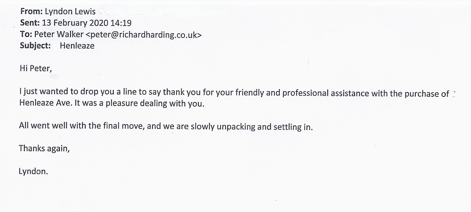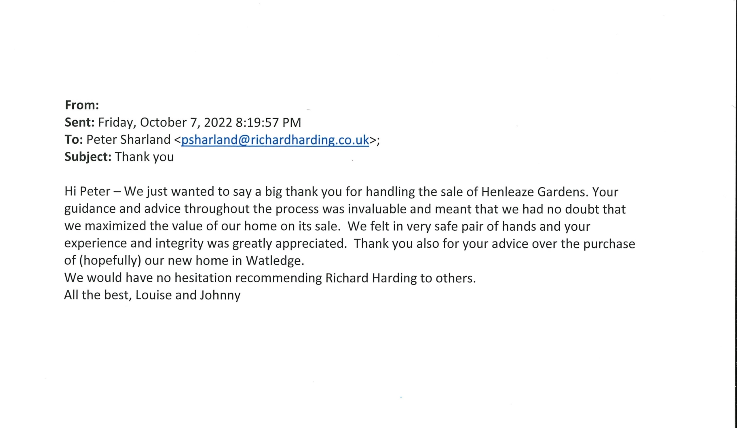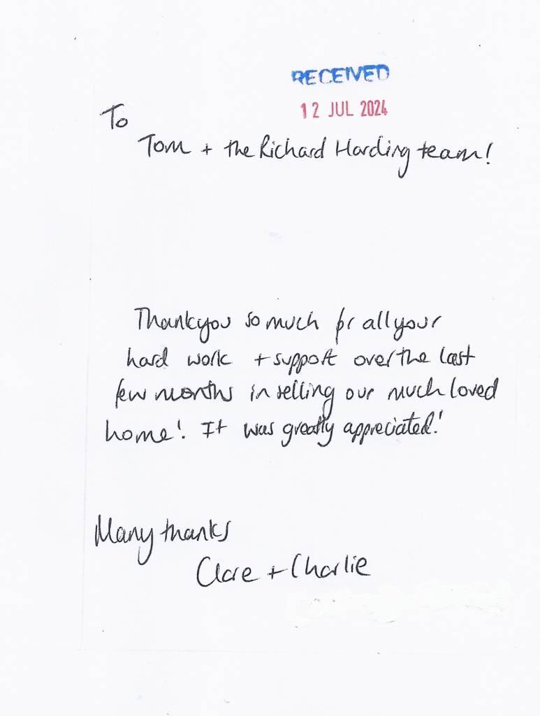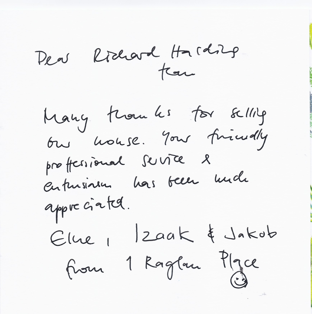 You are welcome to inspect any of the original letters, cards and emails which are held on file in our office or speak to any one of our clients – with their permission – regarding their personal experience of moving with Richard Harding. These testimonials date from the present back to our early years so that you can see we have consistently maintained high standards.
