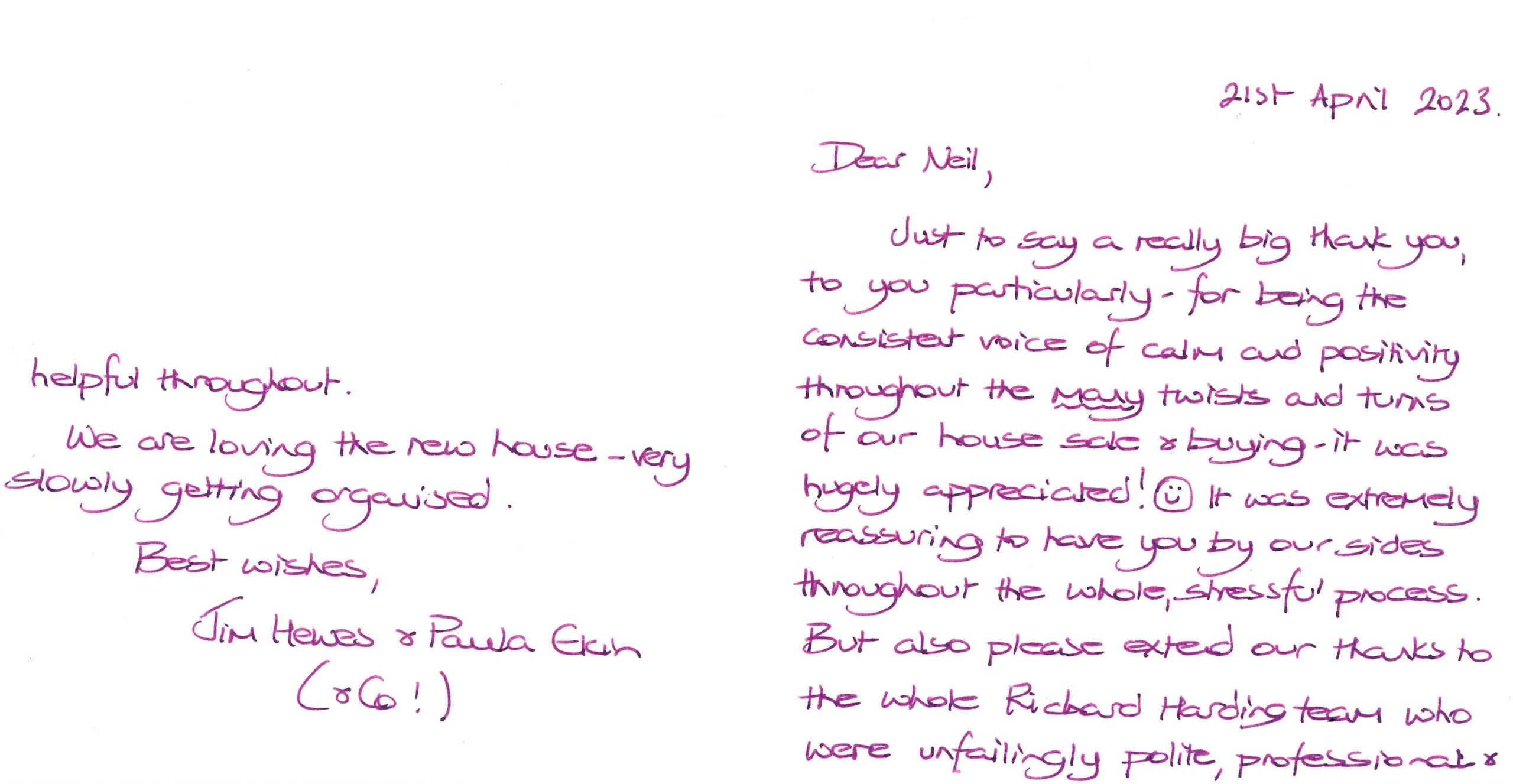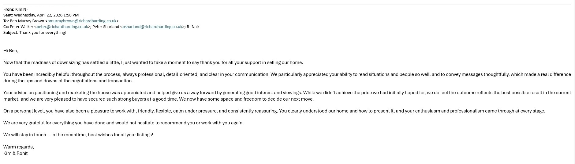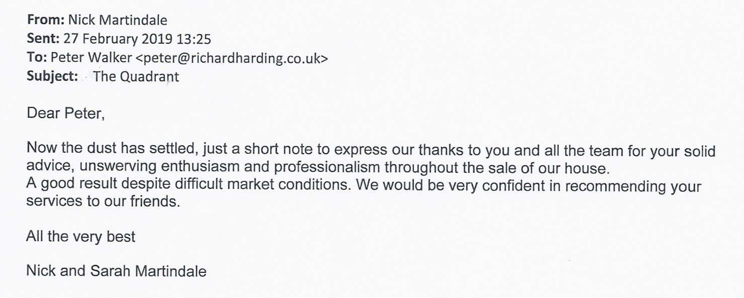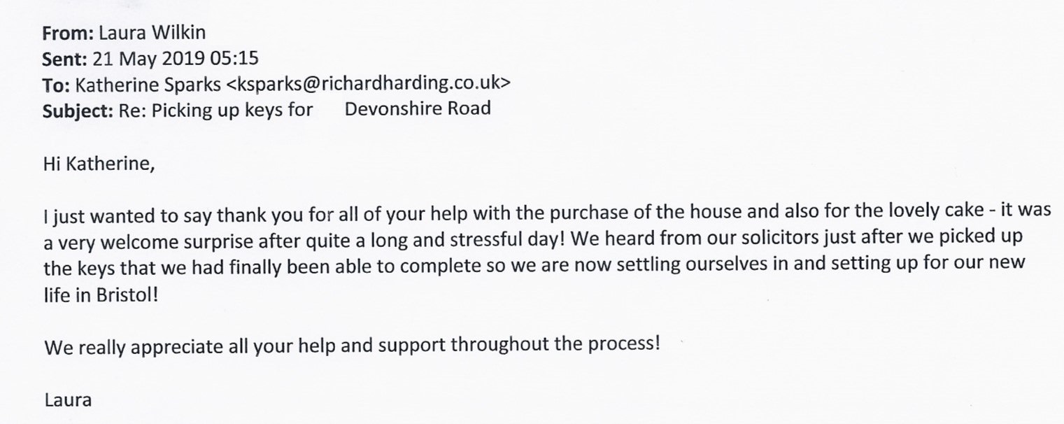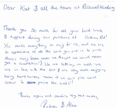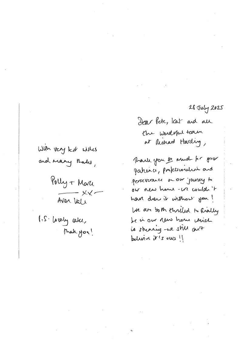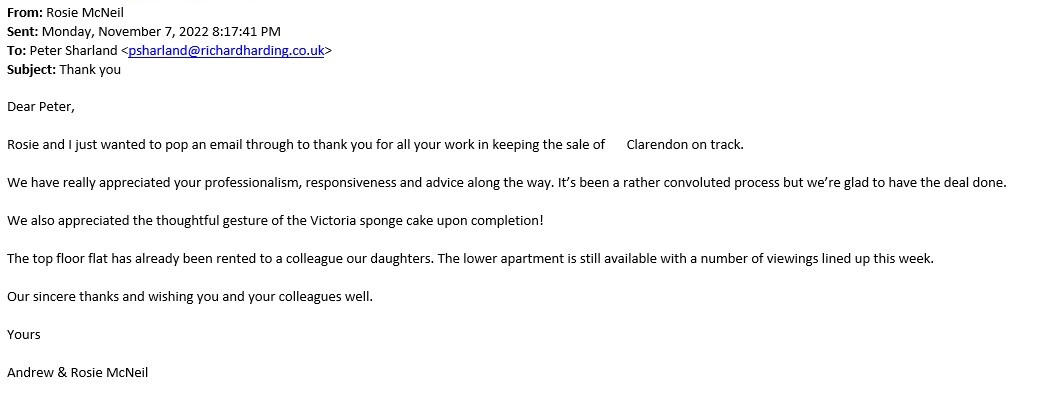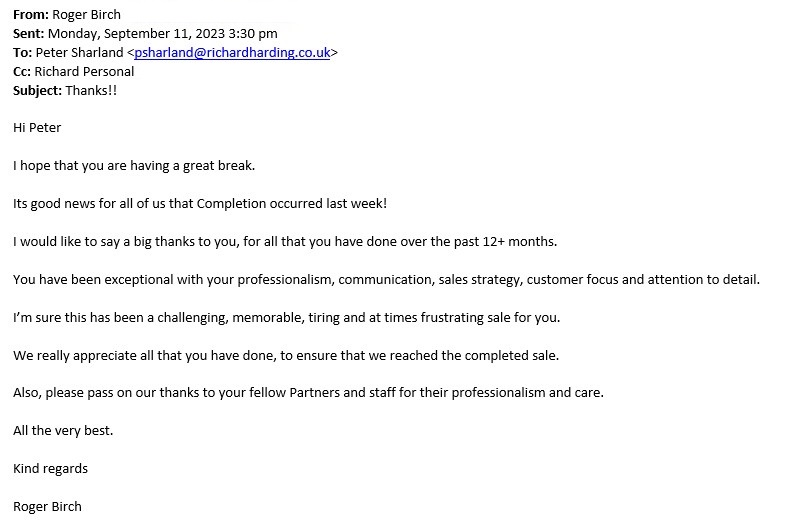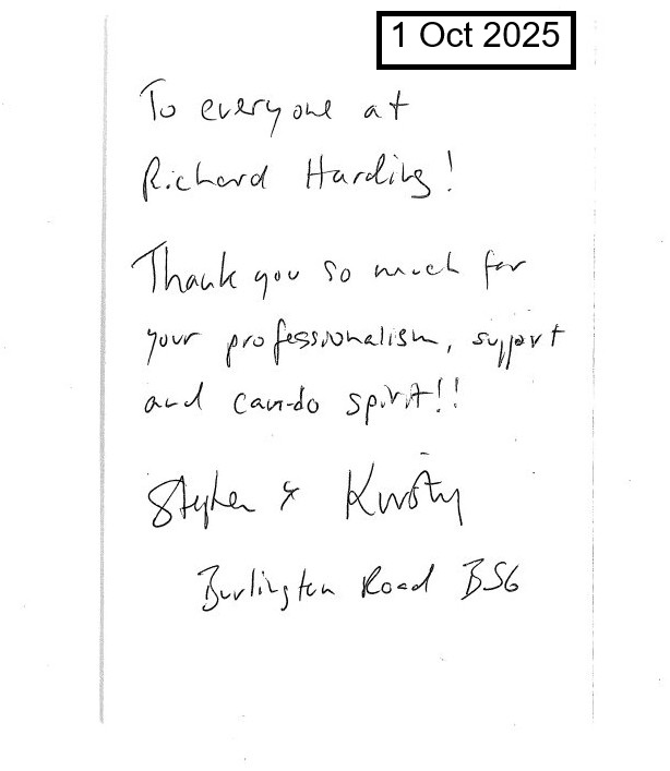 You are welcome to inspect any of the original letters, cards and emails which are held on file in our office or speak to any one of our clients – with their permission – regarding their personal experience of moving with Richard Harding. These testimonials date from the present back to our early years so that you can see we have consistently maintained high standards.