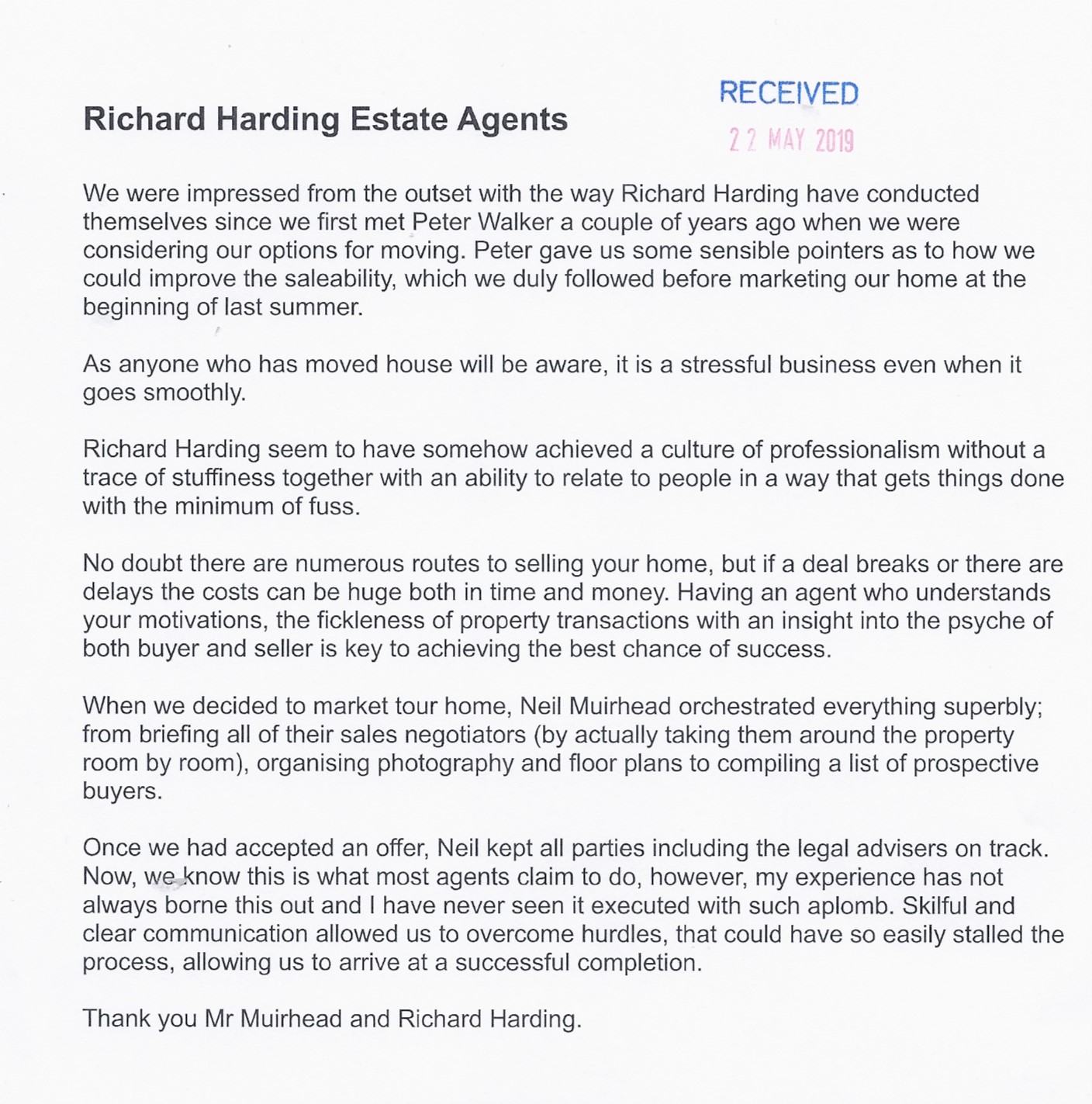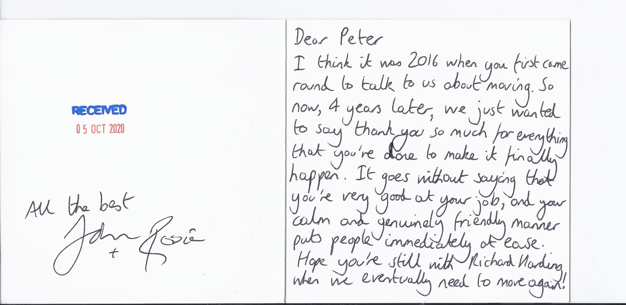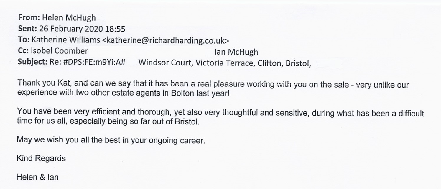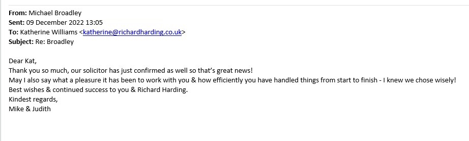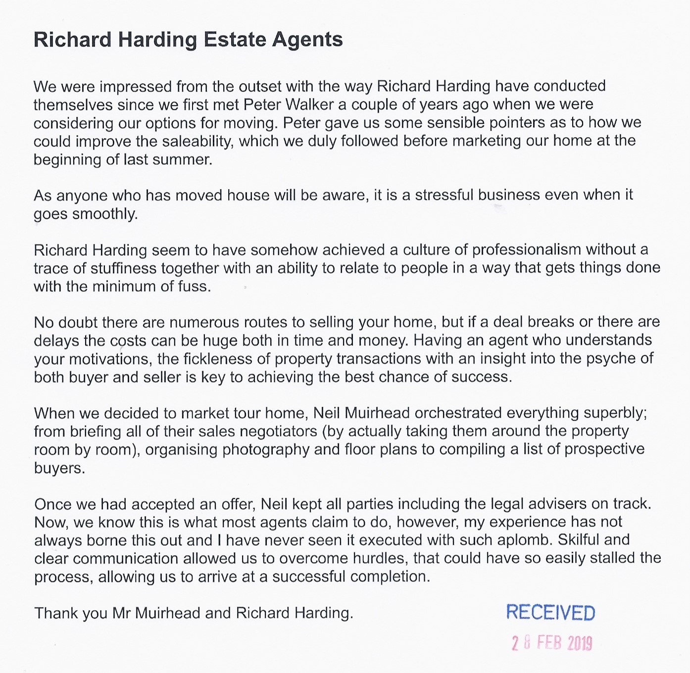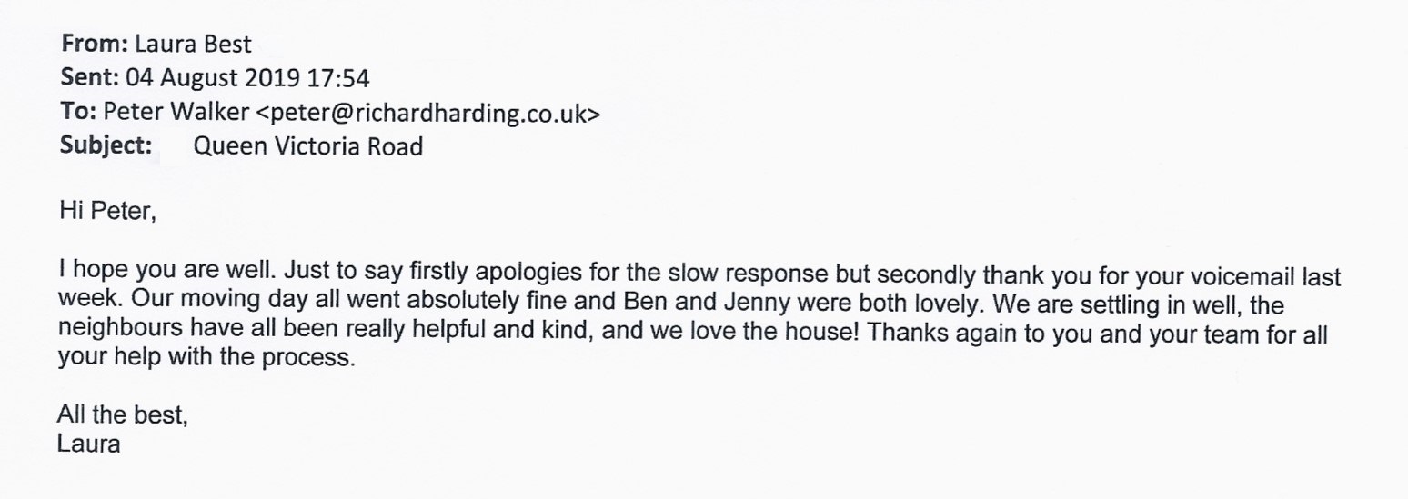 You are welcome to inspect any of the original letters, cards and emails which are held on file in our office or speak to any one of our clients – with their permission – regarding their personal experience of moving with Richard Harding. These testimonials date from the present back to our early years so that you can see we have consistently maintained high standards.