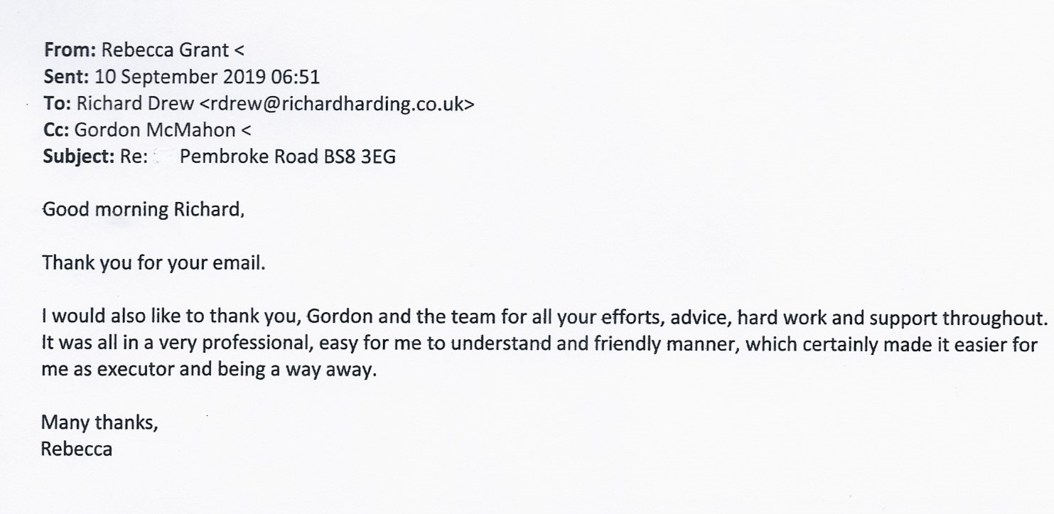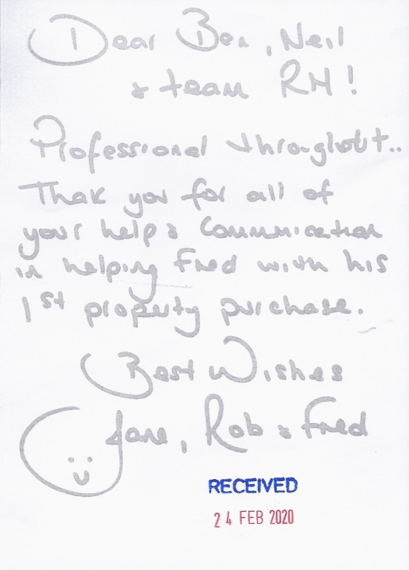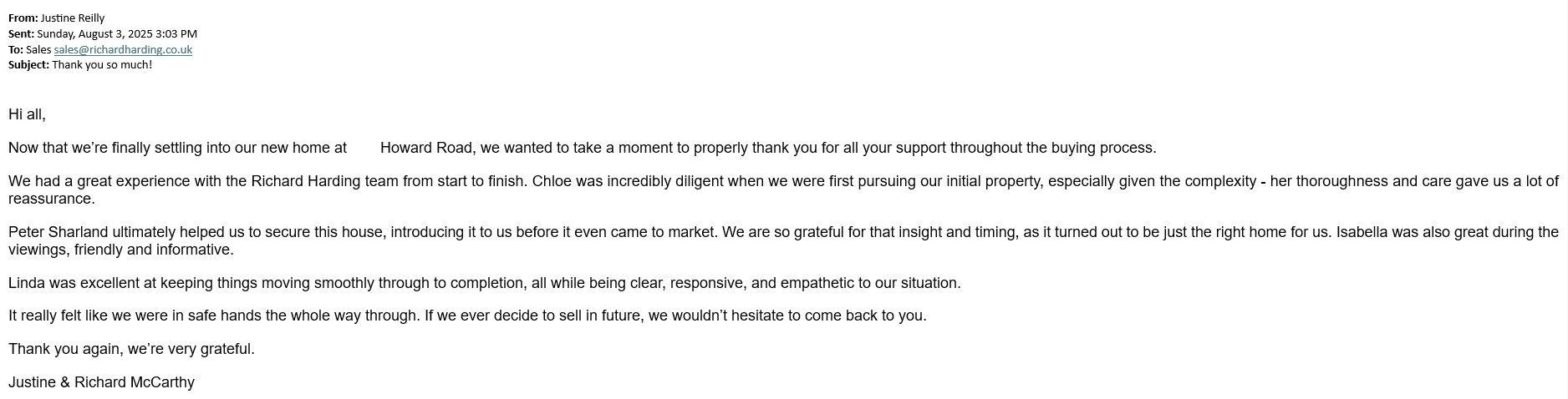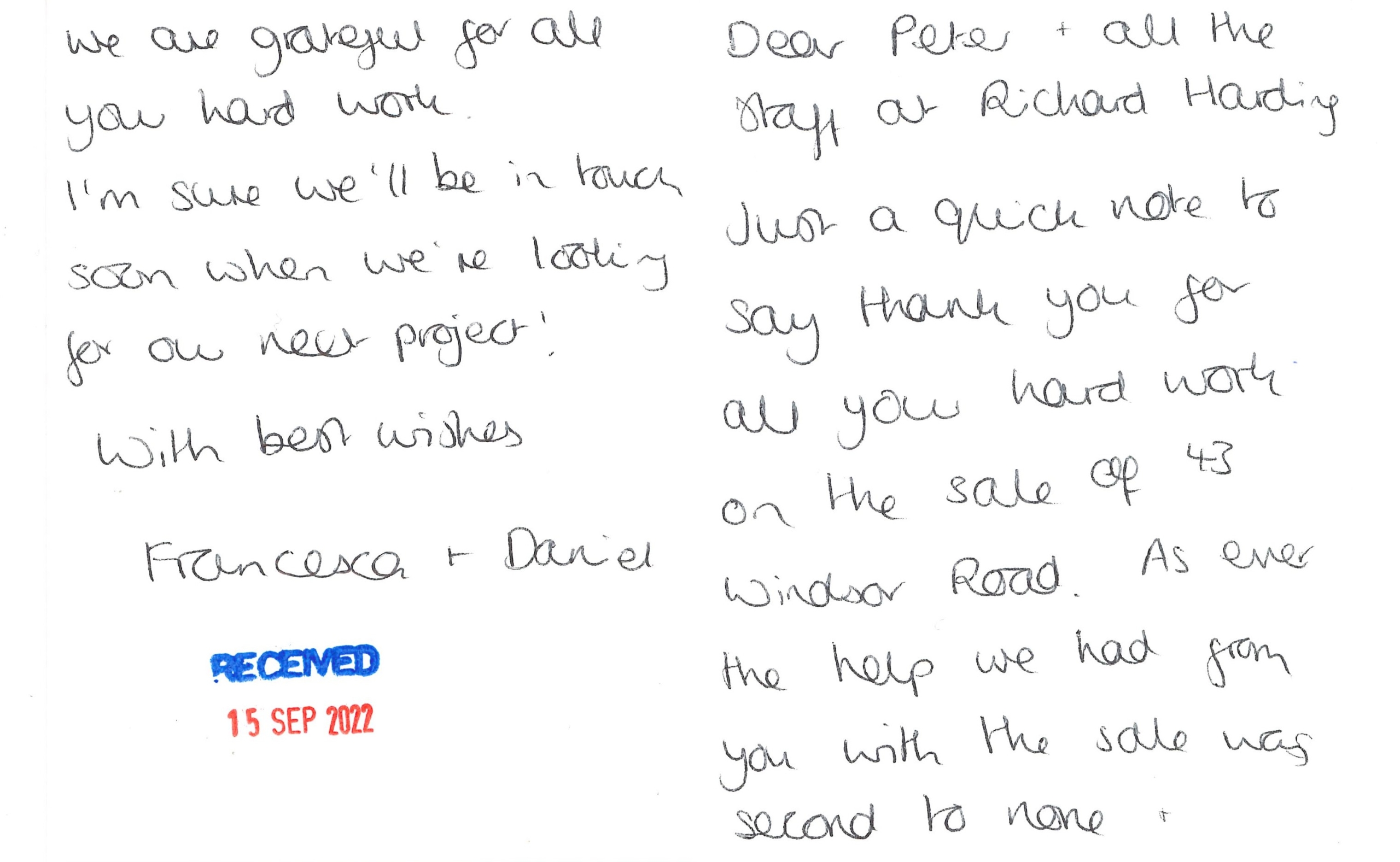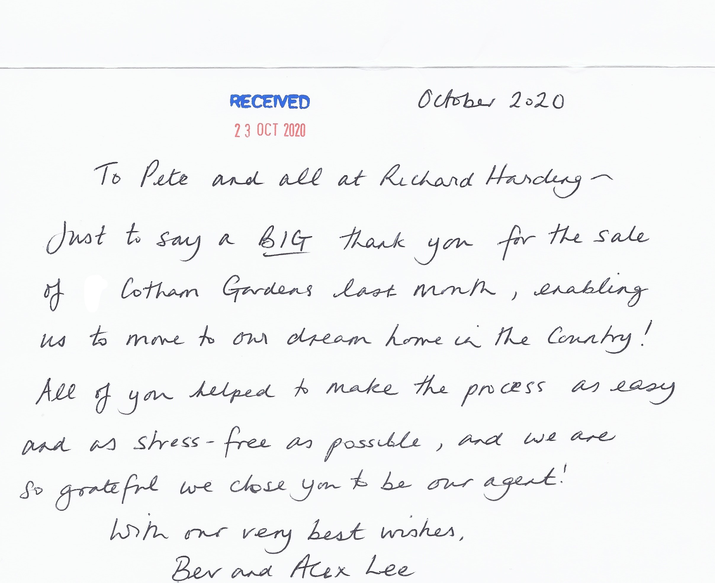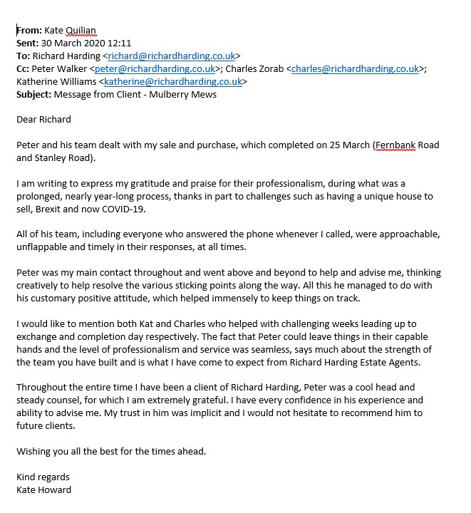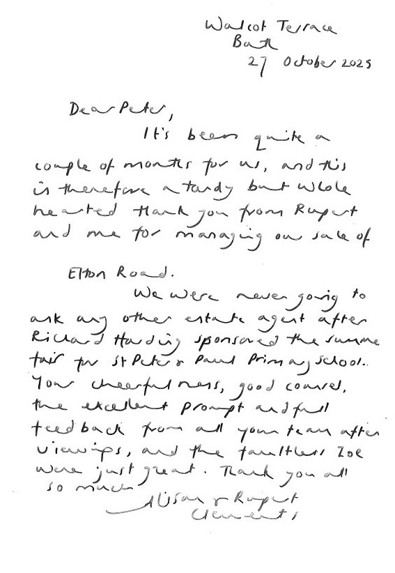 You are welcome to inspect any of the original letters, cards and emails which are held on file in our office or speak to any one of our clients – with their permission – regarding their personal experience of moving with Richard Harding. These testimonials date from the present back to our early years so that you can see we have consistently maintained high standards.