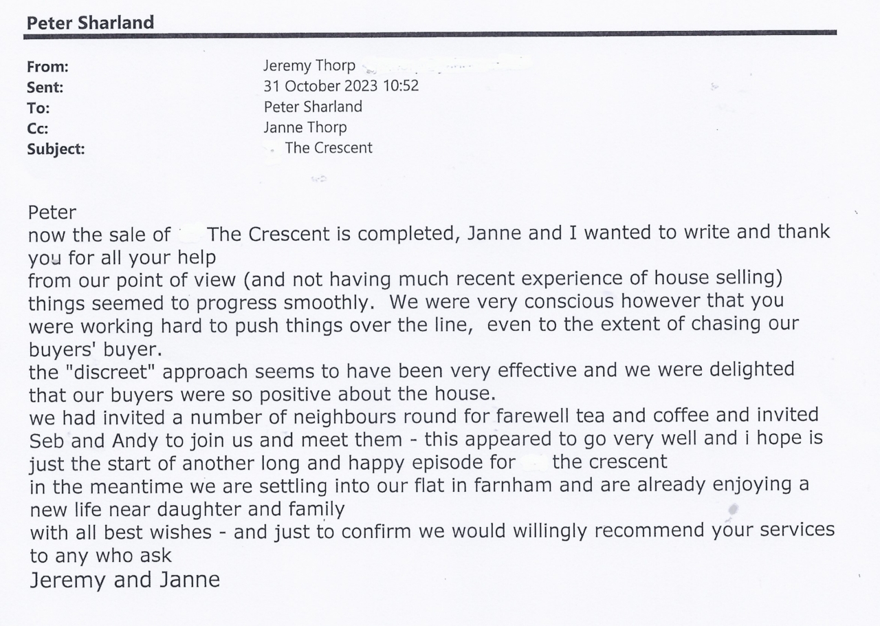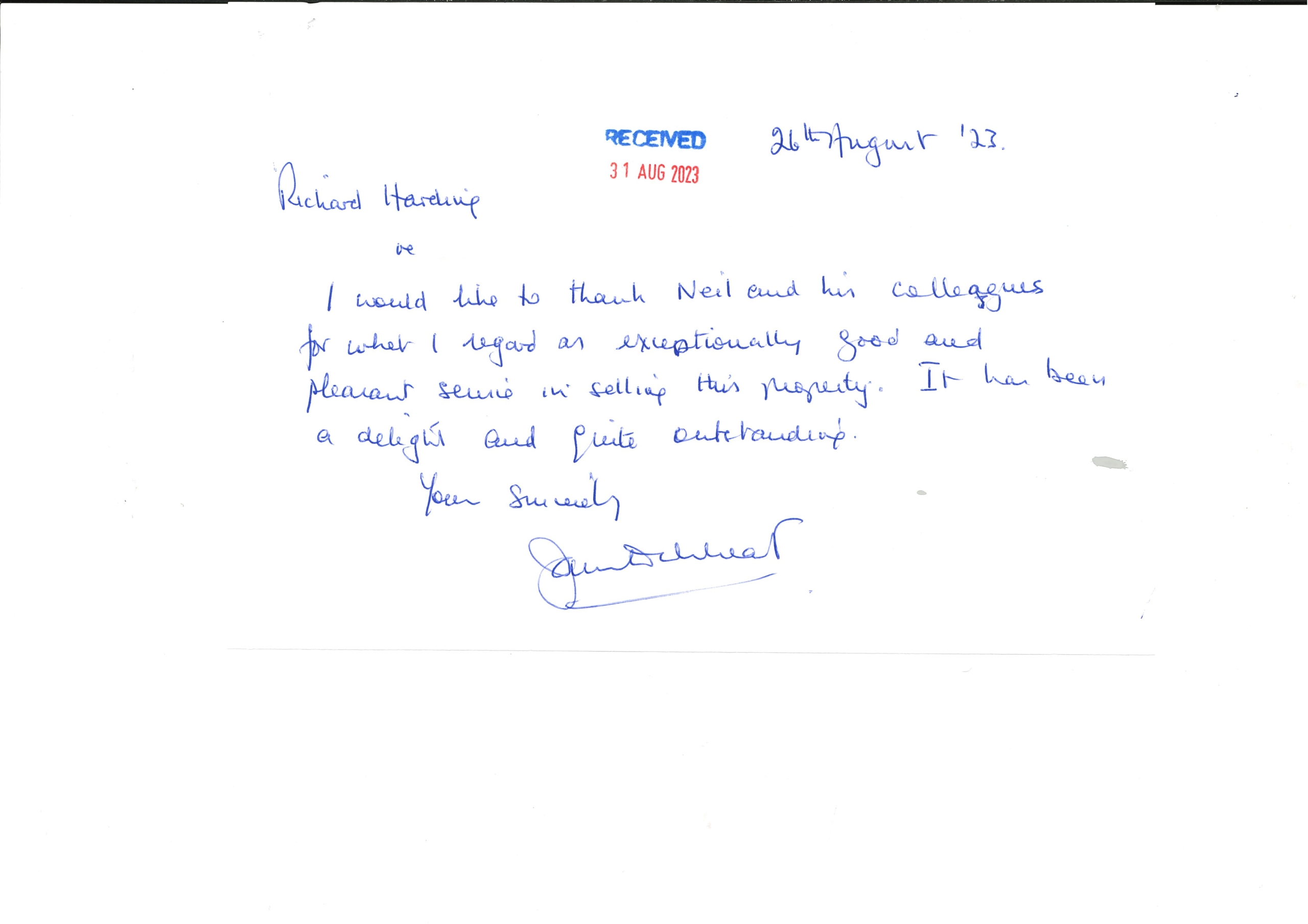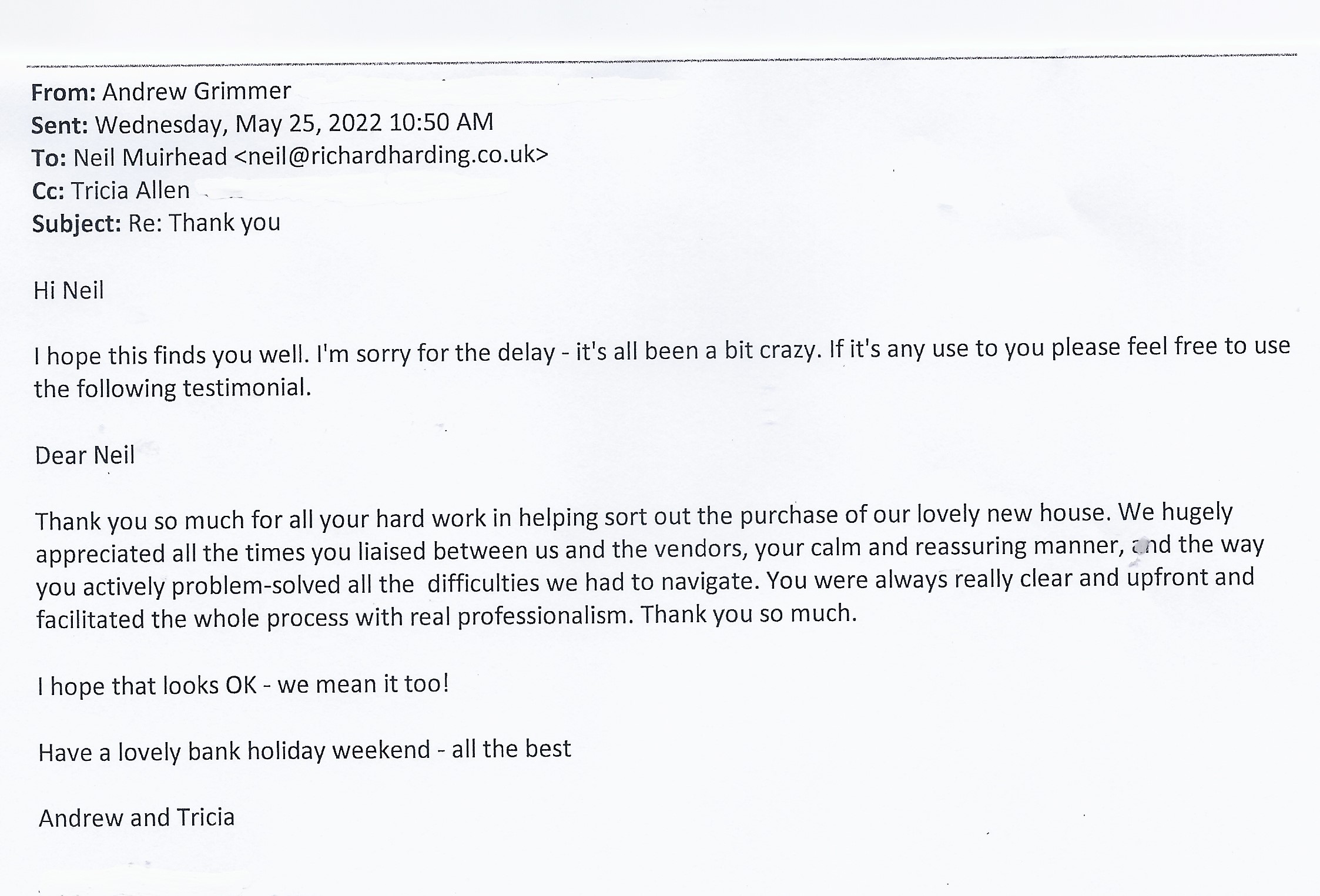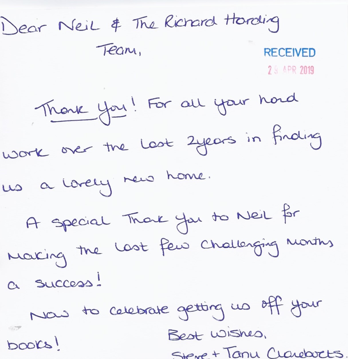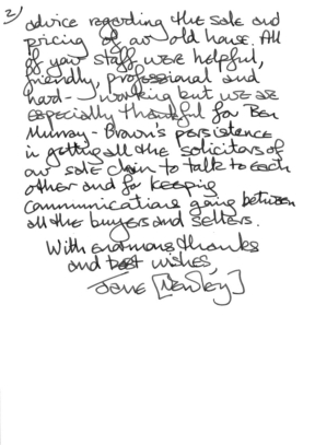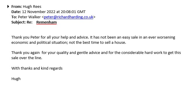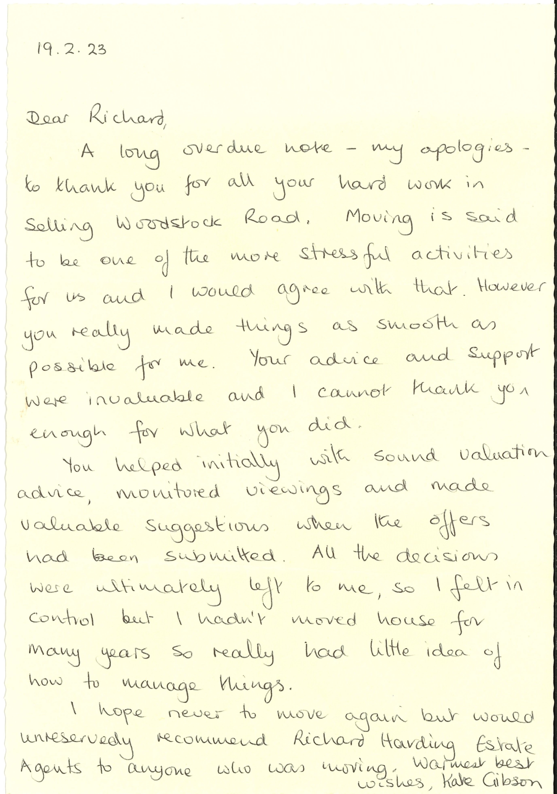 You are welcome to inspect any of the original letters, cards and emails which are held on file in our office or speak to any one of our clients – with their permission – regarding their personal experience of moving with Richard Harding. These testimonials date from the present back to our early years so that you can see we have consistently maintained high standards.