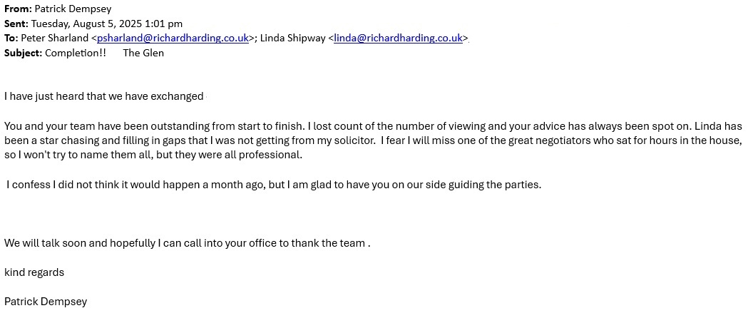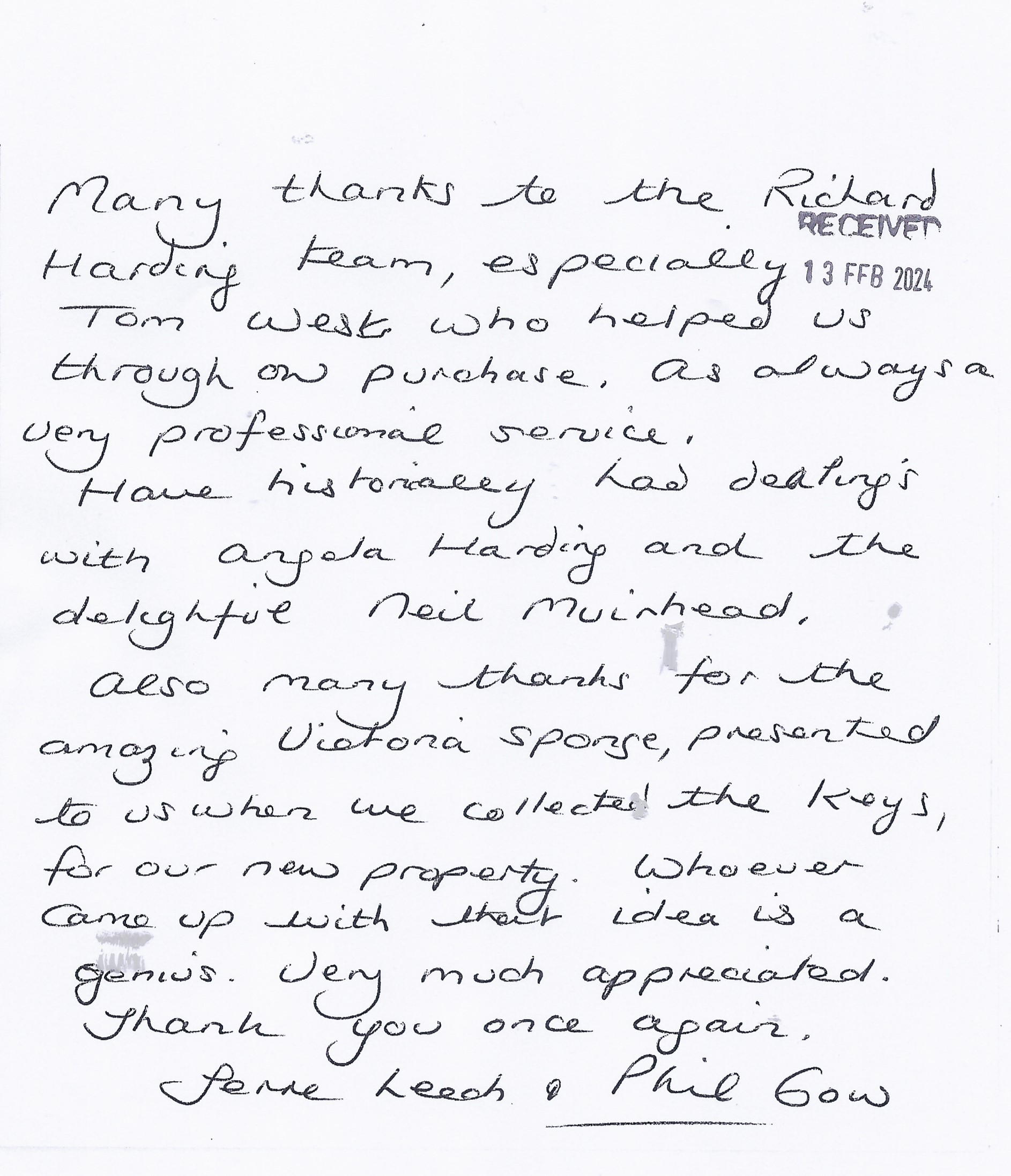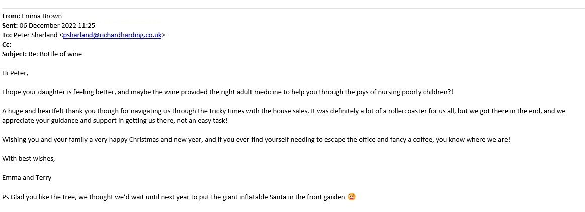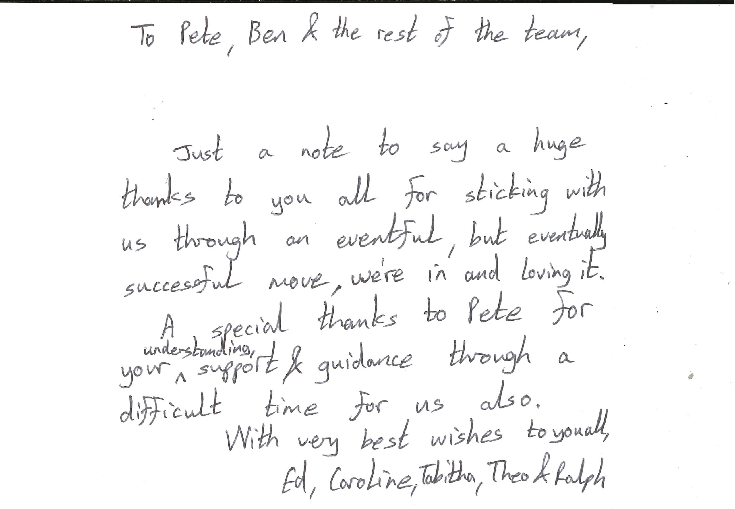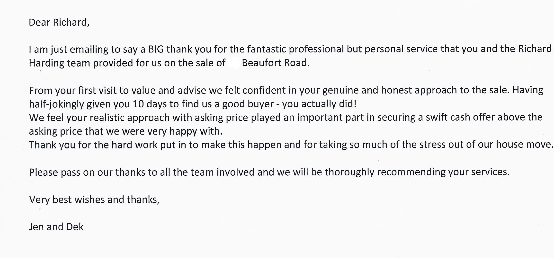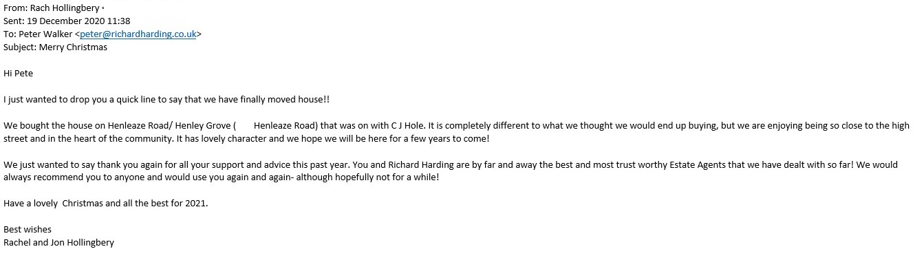 You are welcome to inspect any of the original letters, cards and emails which are held on file in our office or speak to any one of our clients – with their permission – regarding their personal experience of moving with Richard Harding. These testimonials date from the present back to our early years so that you can see we have consistently maintained high standards.