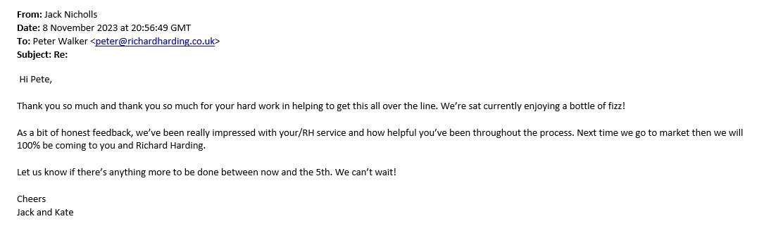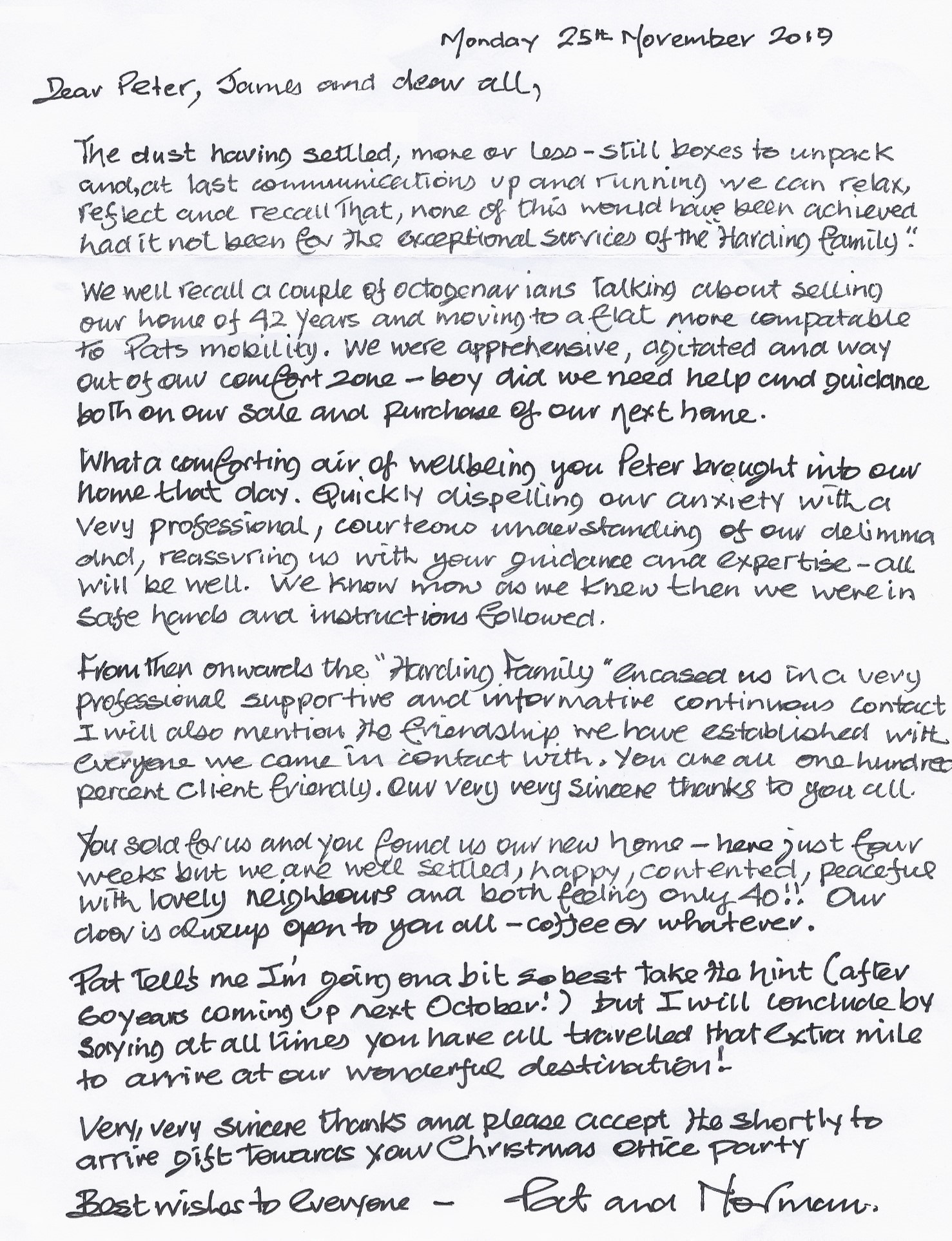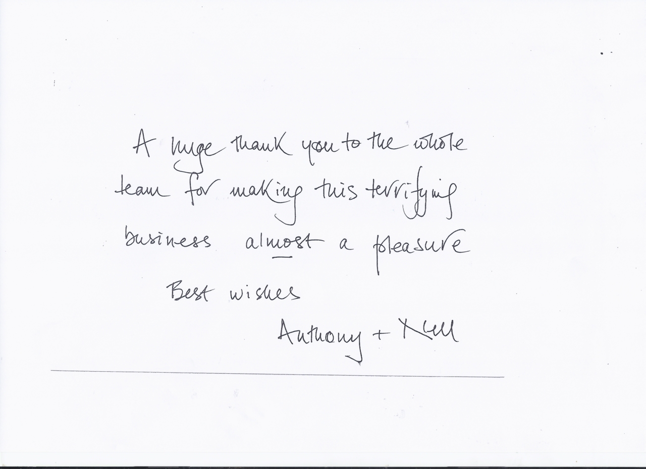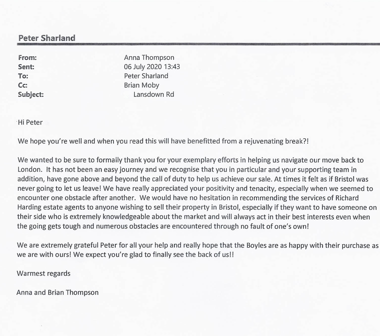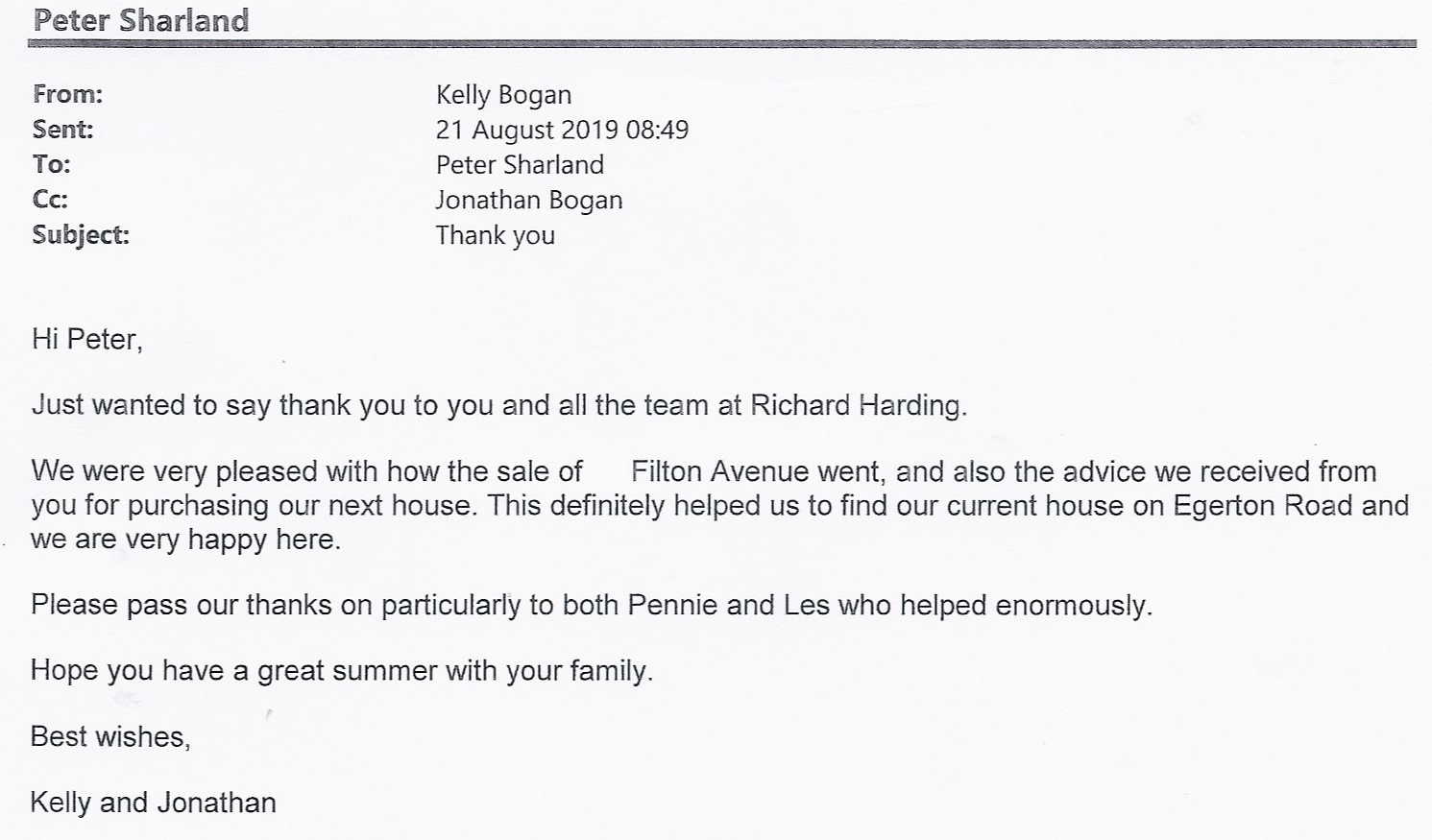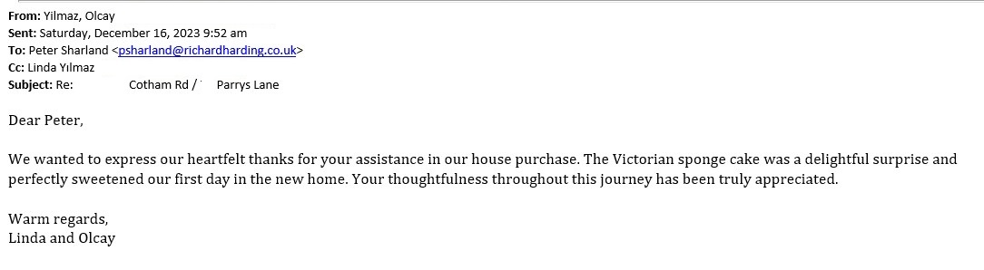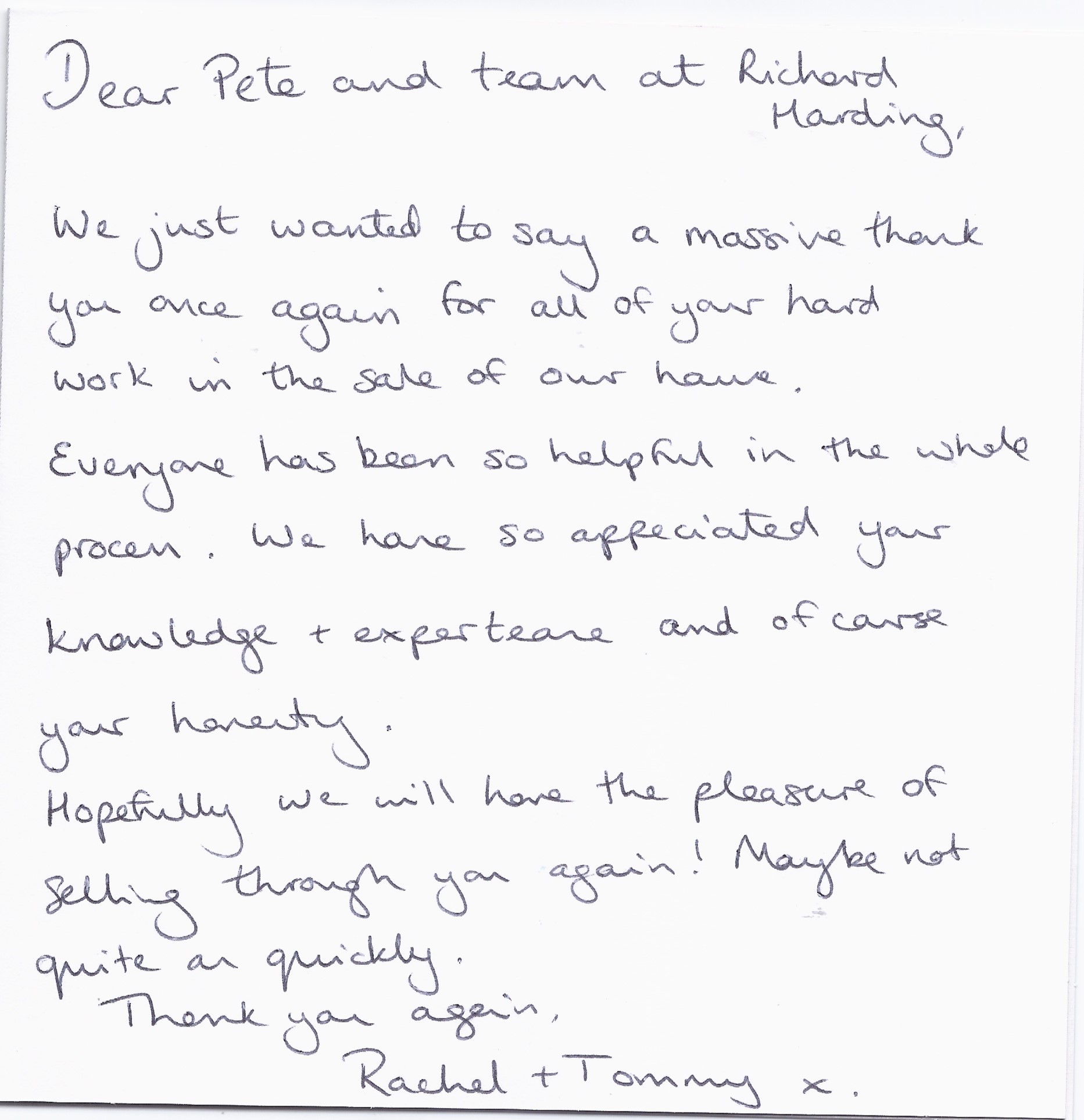 You are welcome to inspect any of the original letters, cards and emails which are held on file in our office or speak to any one of our clients – with their permission – regarding their personal experience of moving with Richard Harding. These testimonials date from the present back to our early years so that you can see we have consistently maintained high standards.