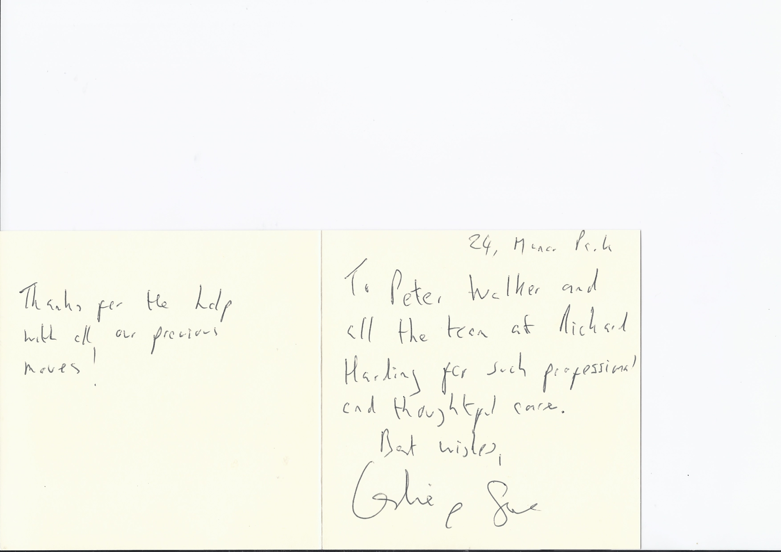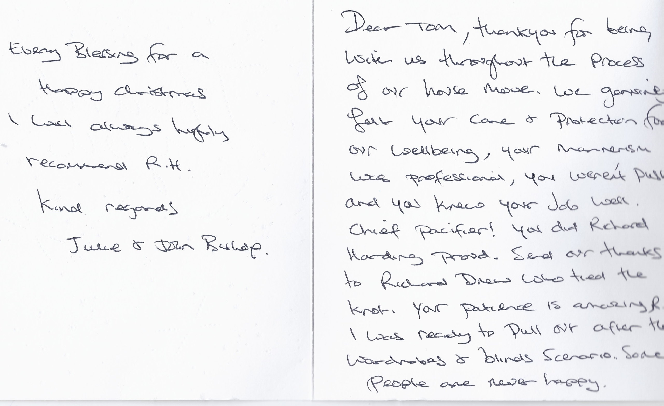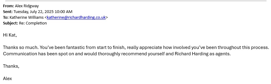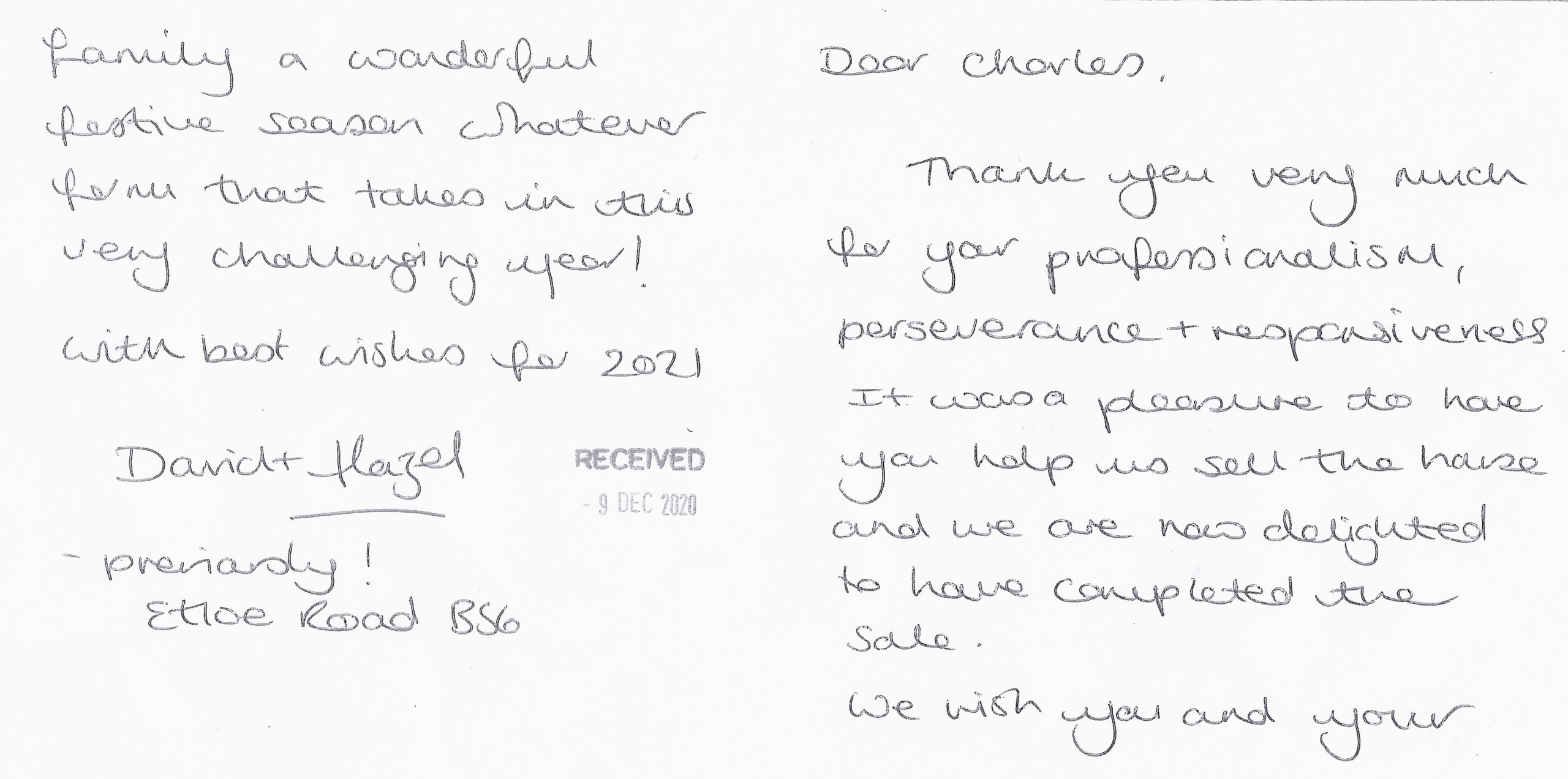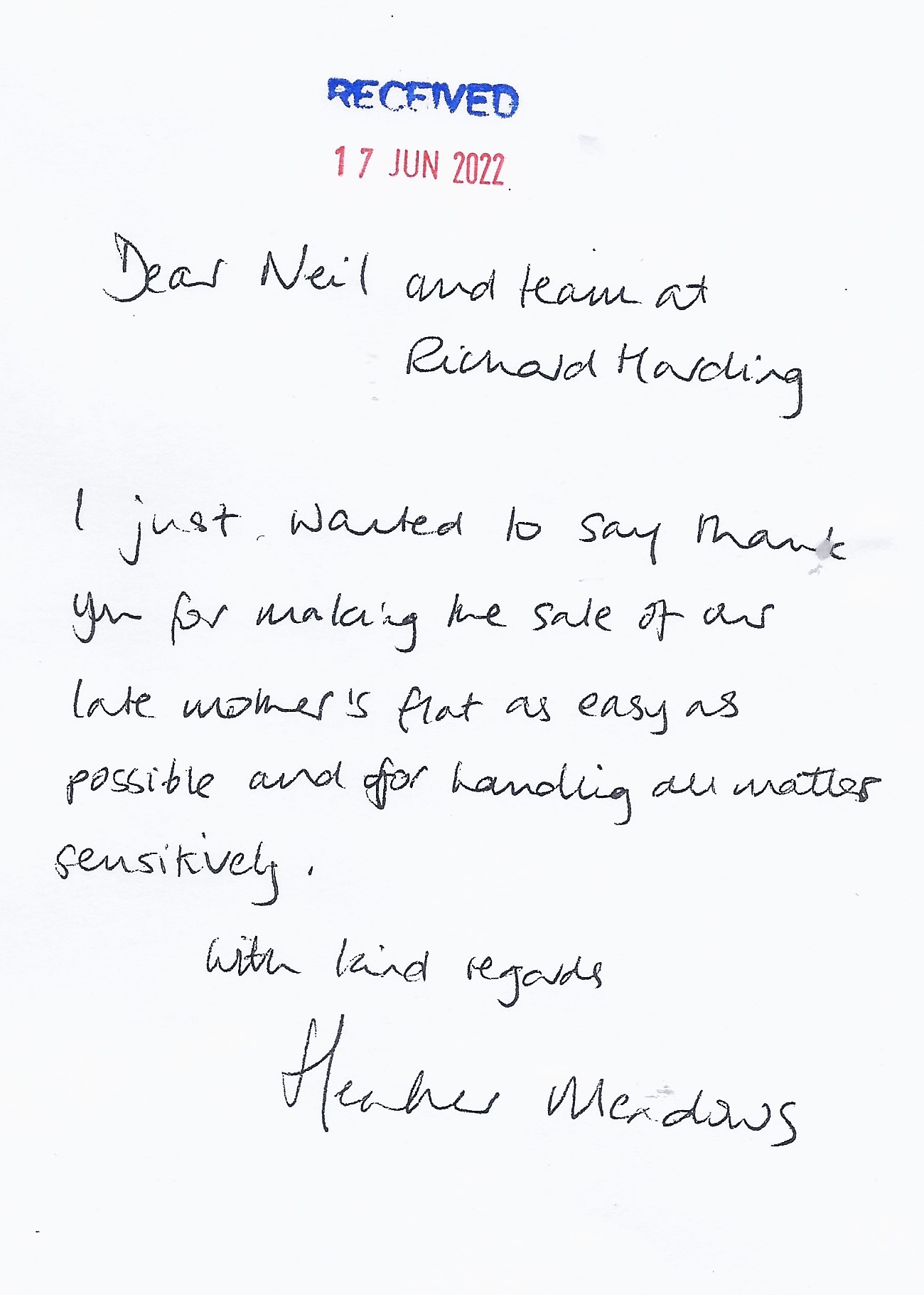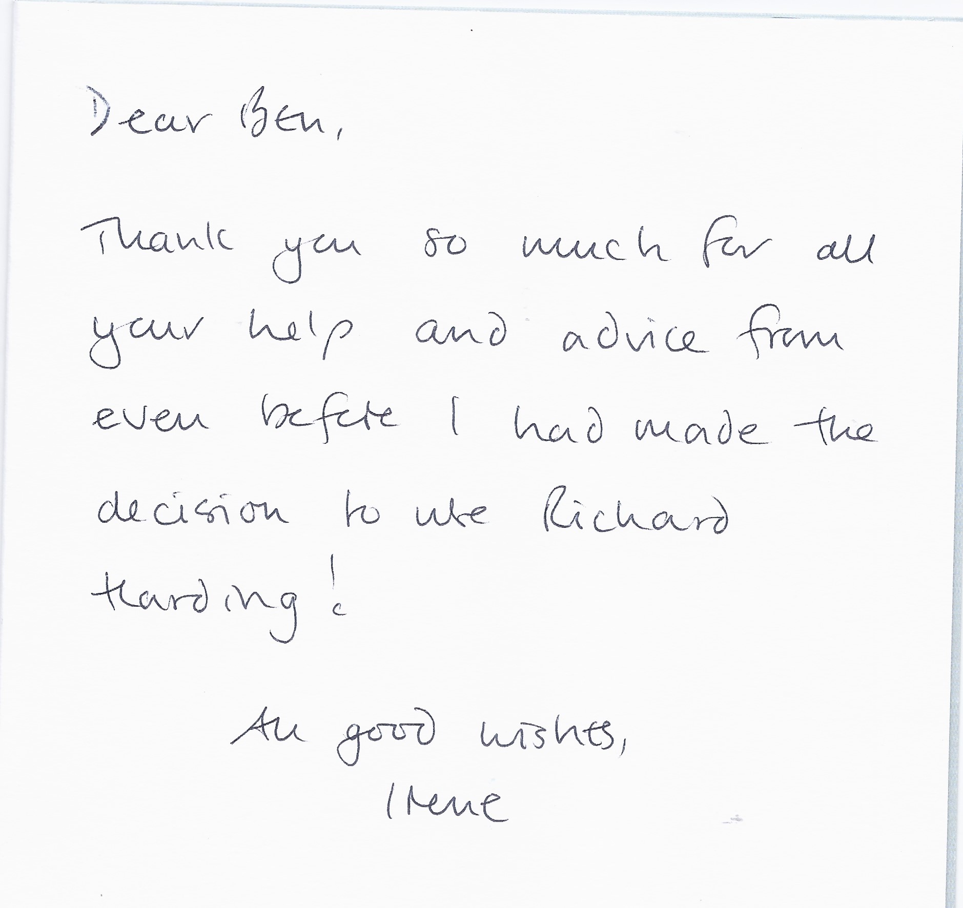 You are welcome to inspect any of the original letters, cards and emails which are held on file in our office or speak to any one of our clients – with their permission – regarding their personal experience of moving with Richard Harding. These testimonials date from the present back to our early years so that you can see we have consistently maintained high standards.