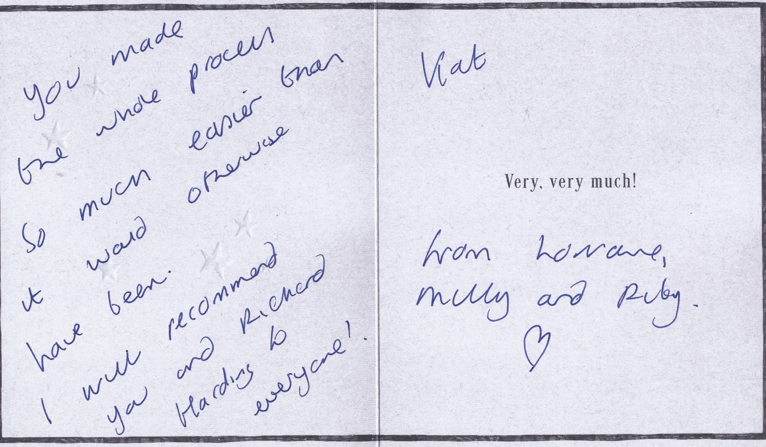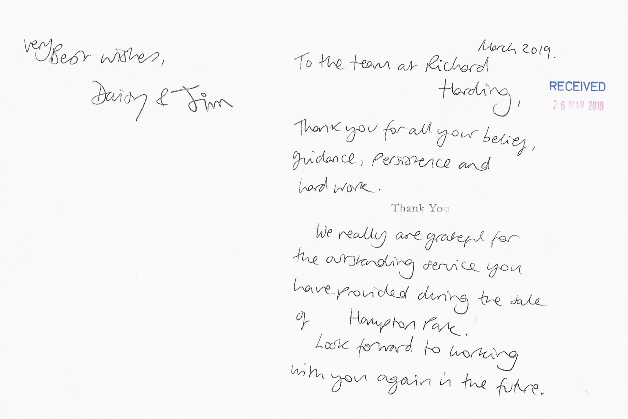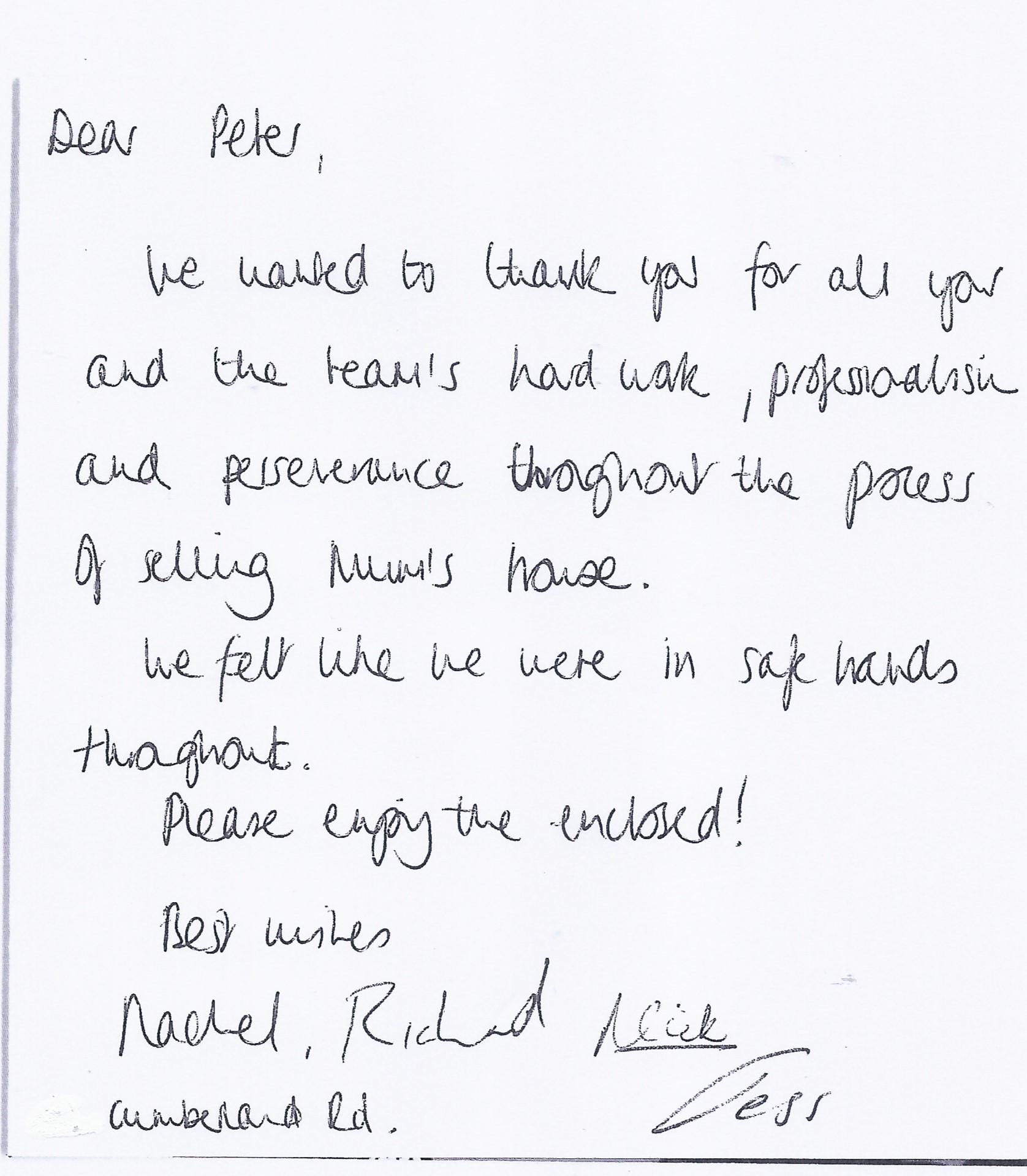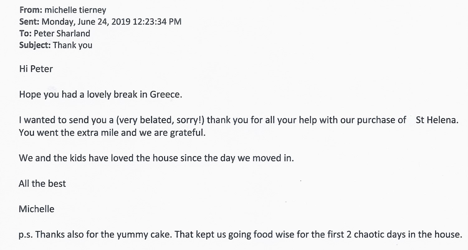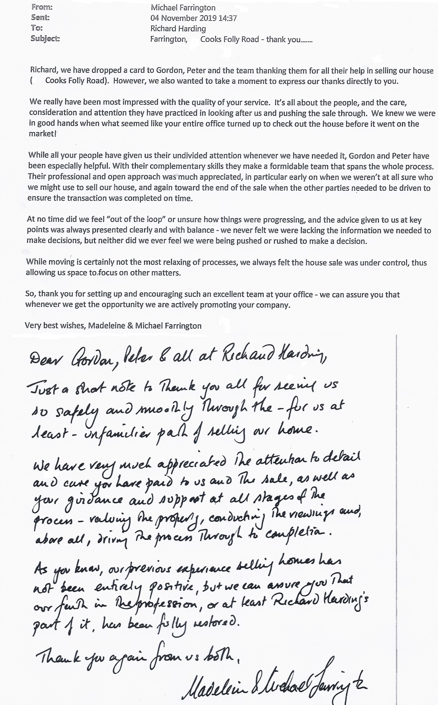 You are welcome to inspect any of the original letters, cards and emails which are held on file in our office or speak to any one of our clients – with their permission – regarding their personal experience of moving with Richard Harding. These testimonials date from the present back to our early years so that you can see we have consistently maintained high standards.