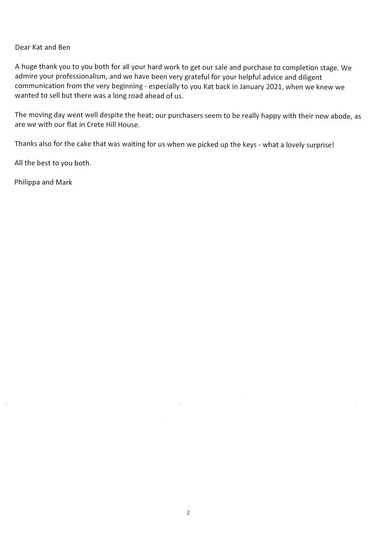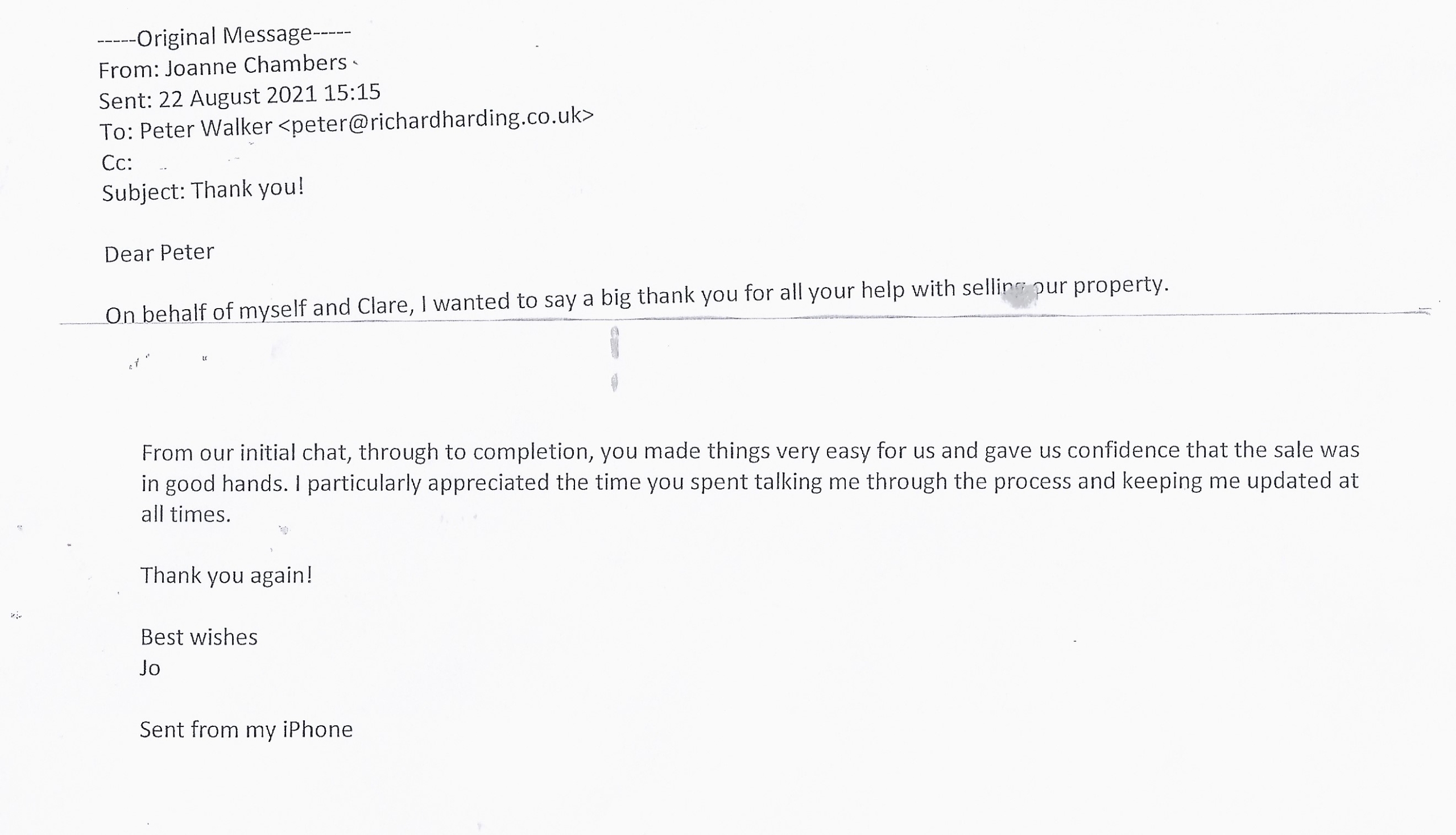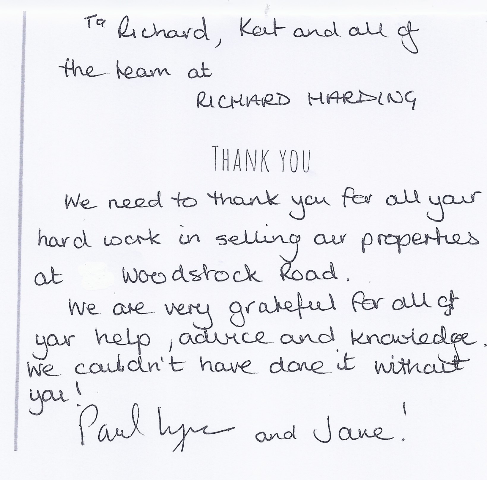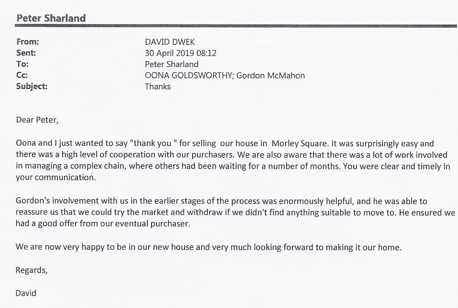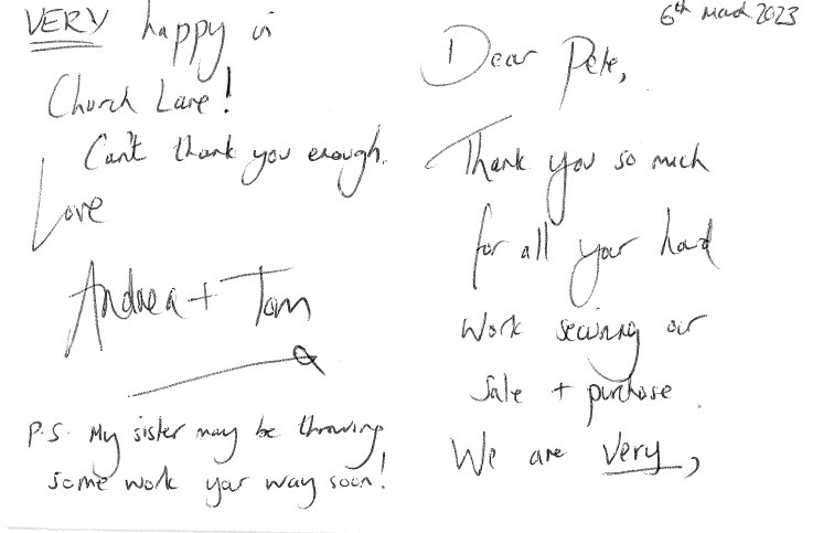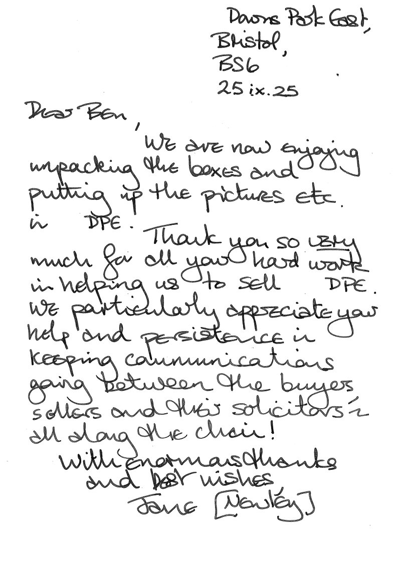 You are welcome to inspect any of the original letters, cards and emails which are held on file in our office or speak to any one of our clients – with their permission – regarding their personal experience of moving with Richard Harding. These testimonials date from the present back to our early years so that you can see we have consistently maintained high standards.