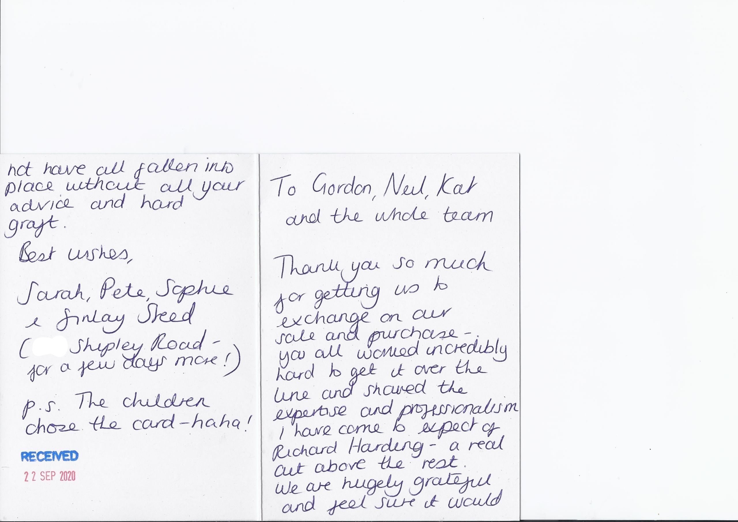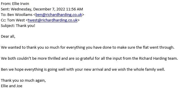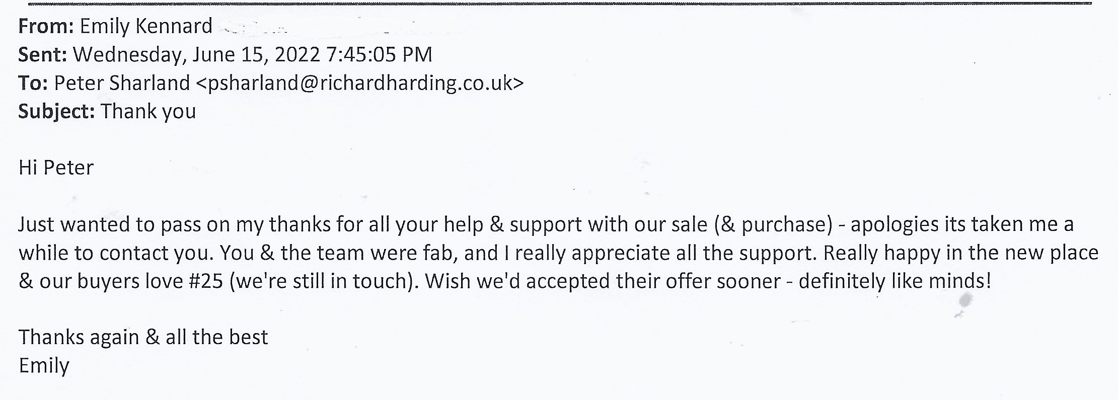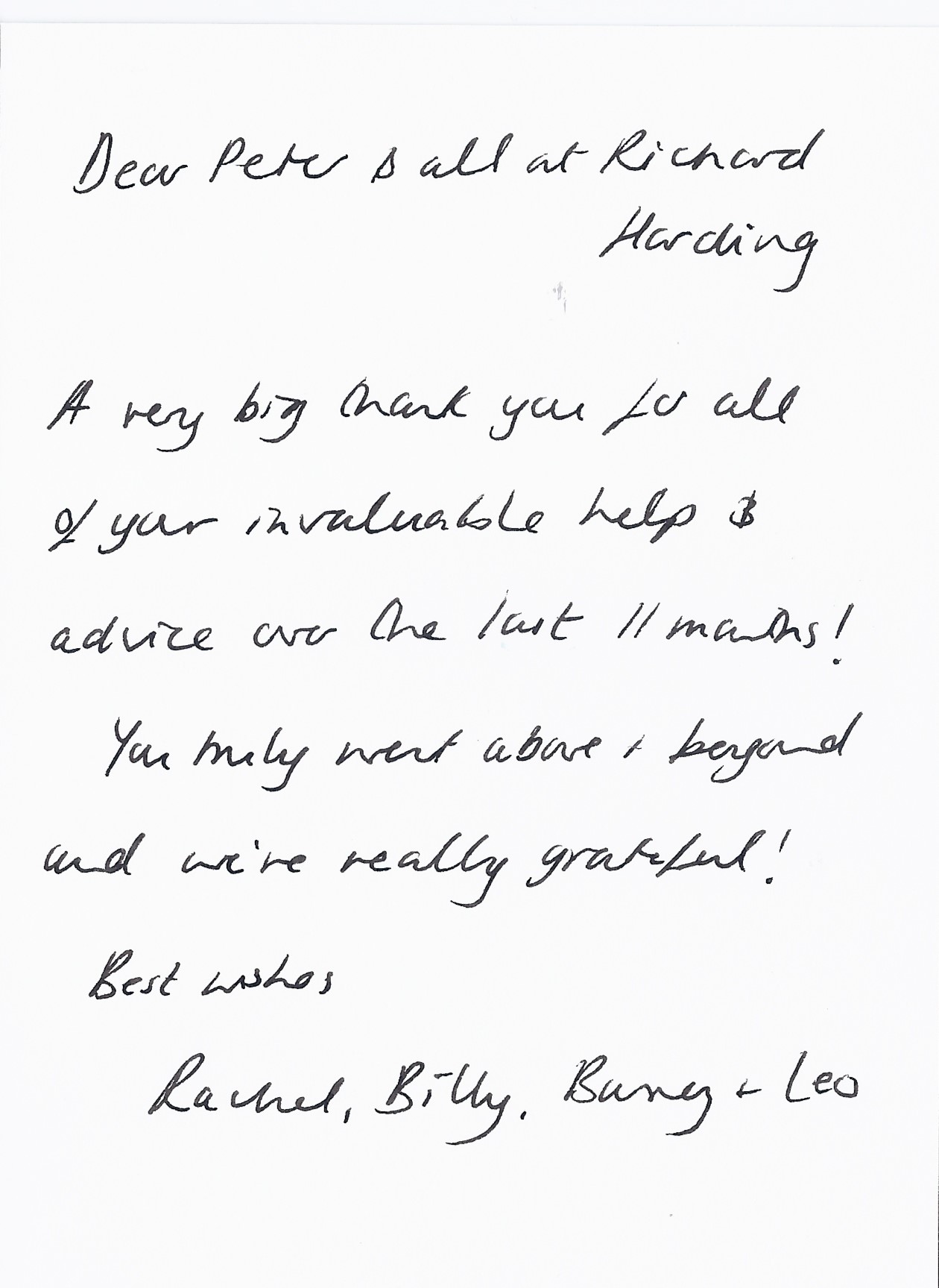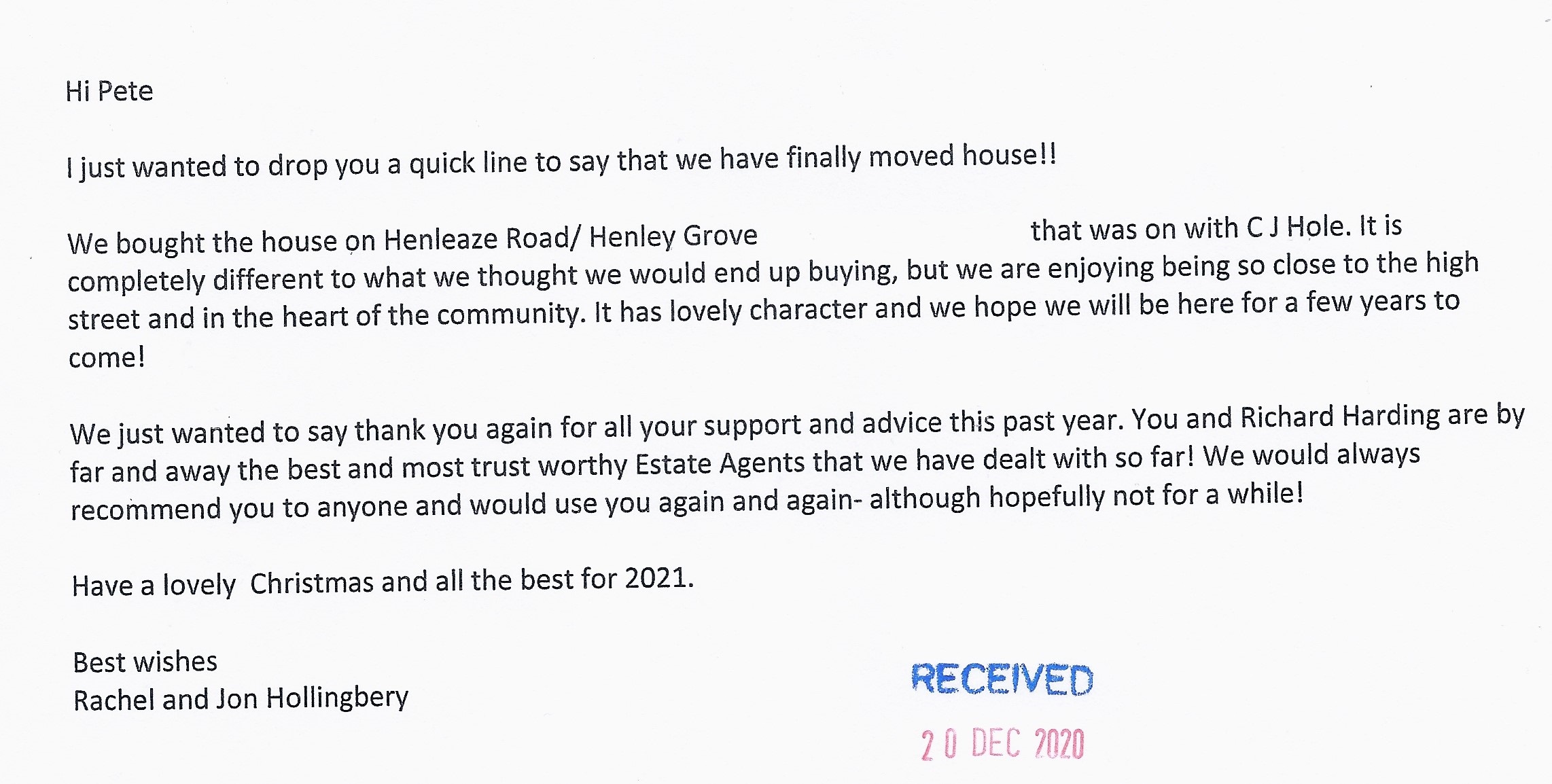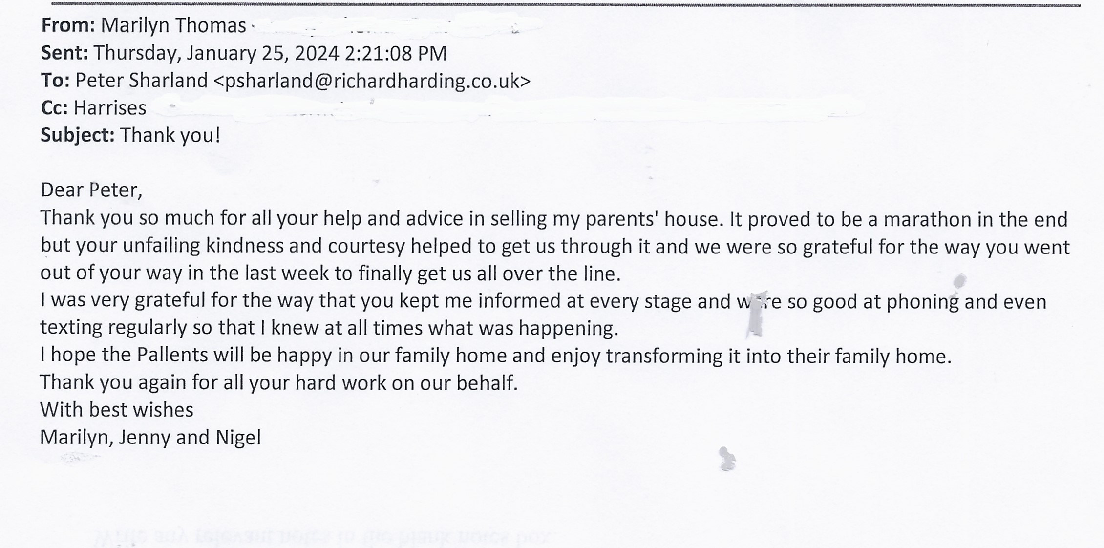 You are welcome to inspect any of the original letters, cards and emails which are held on file in our office or speak to any one of our clients – with their permission – regarding their personal experience of moving with Richard Harding. These testimonials date from the present back to our early years so that you can see we have consistently maintained high standards.