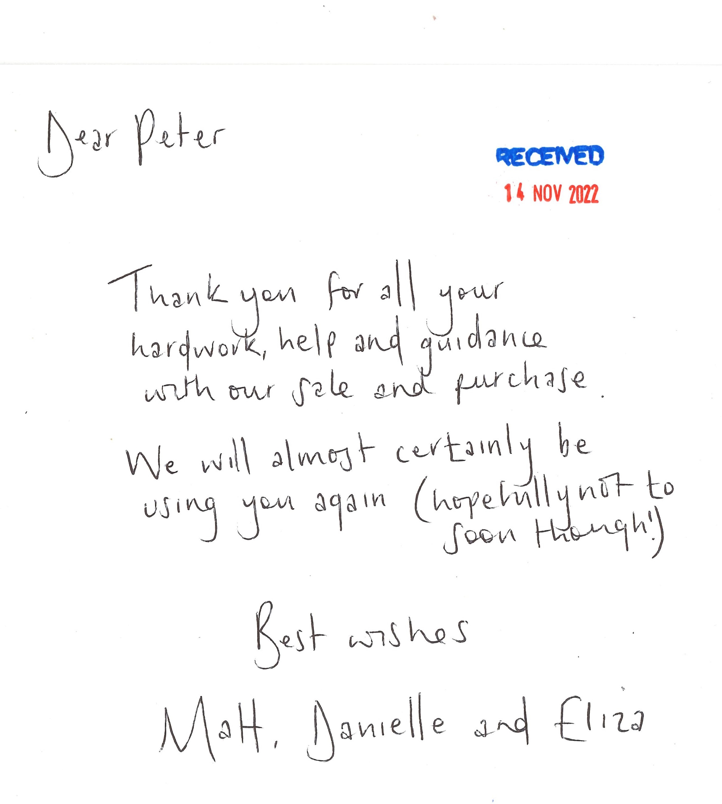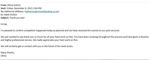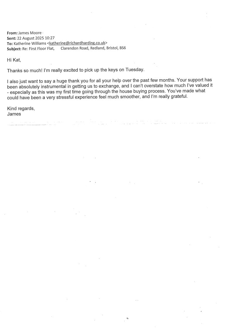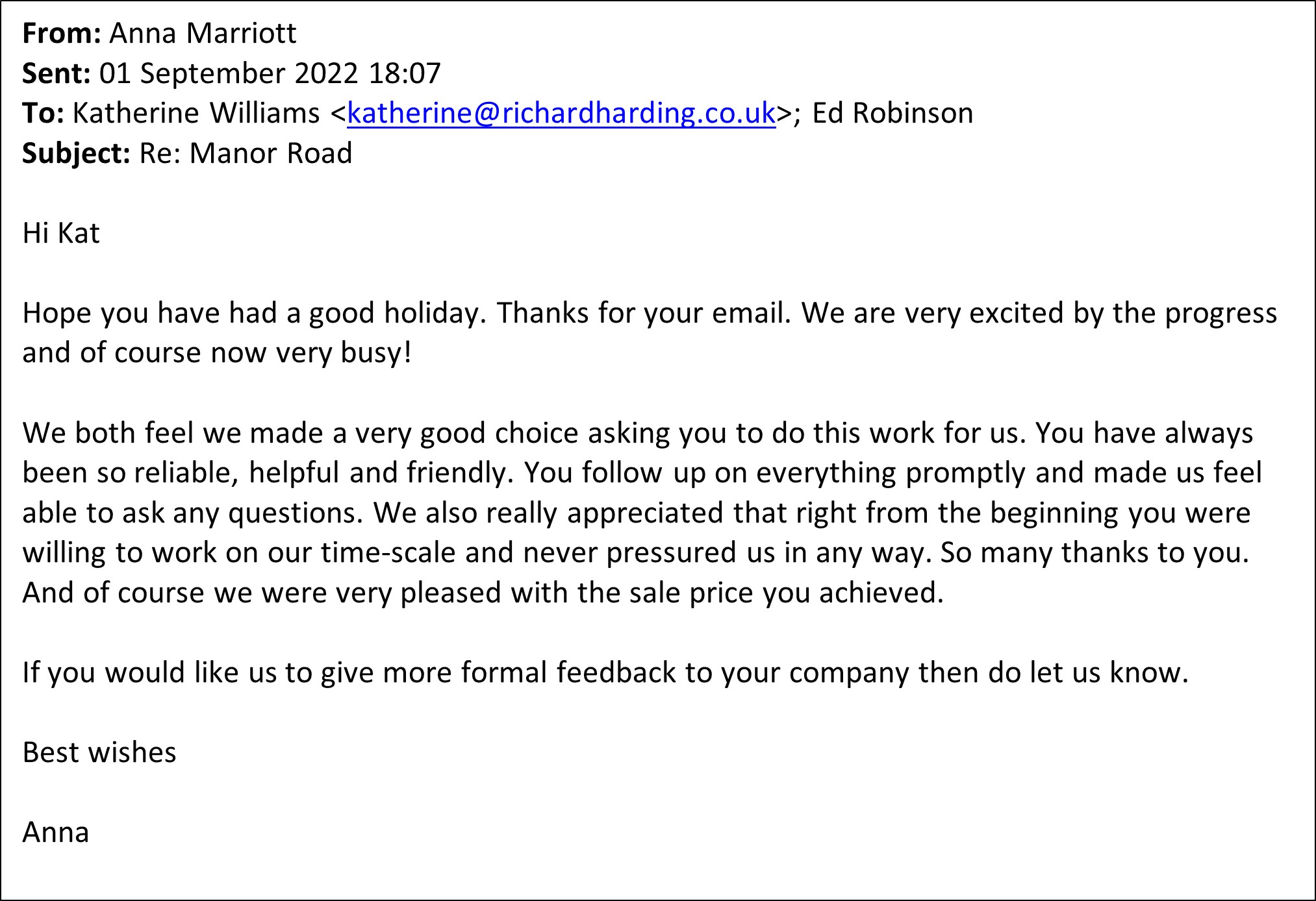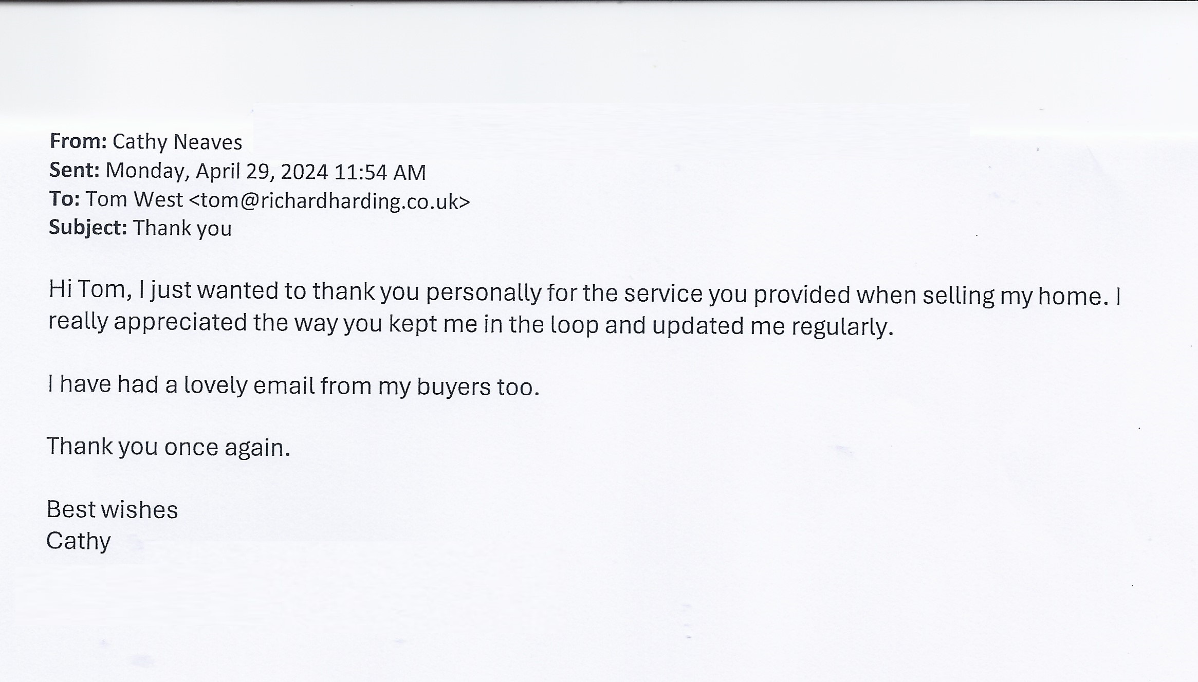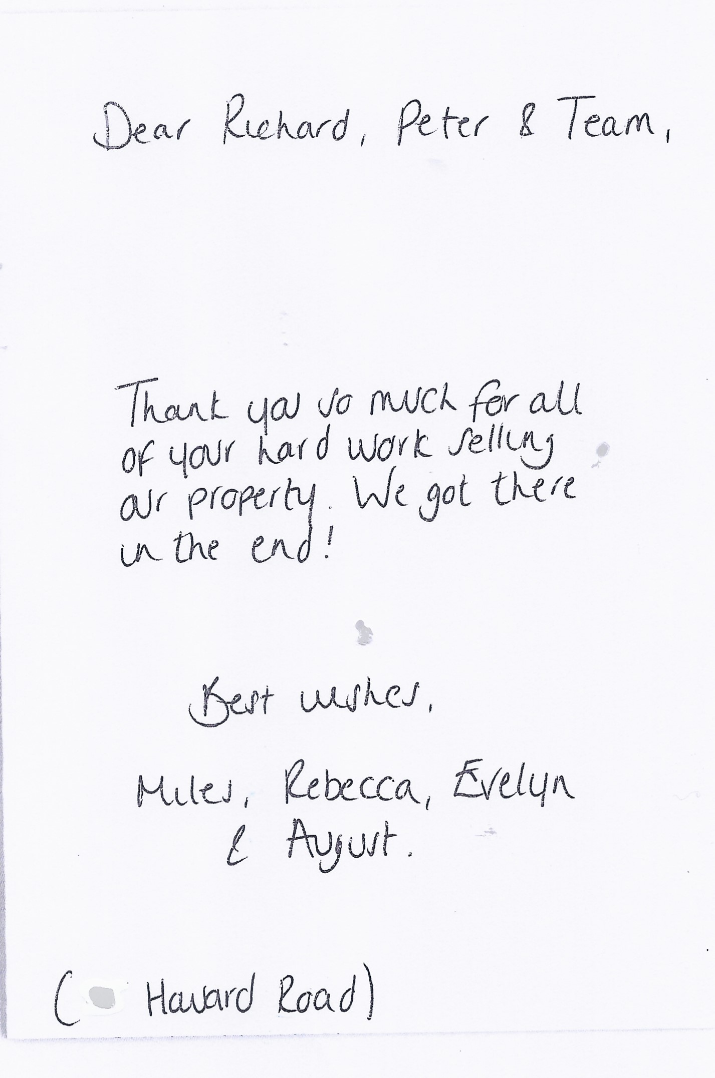 You are welcome to inspect any of the original letters, cards and emails which are held on file in our office or speak to any one of our clients – with their permission – regarding their personal experience of moving with Richard Harding. These testimonials date from the present back to our early years so that you can see we have consistently maintained high standards.