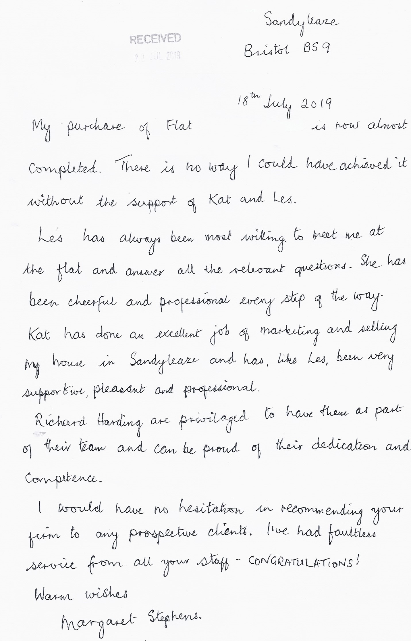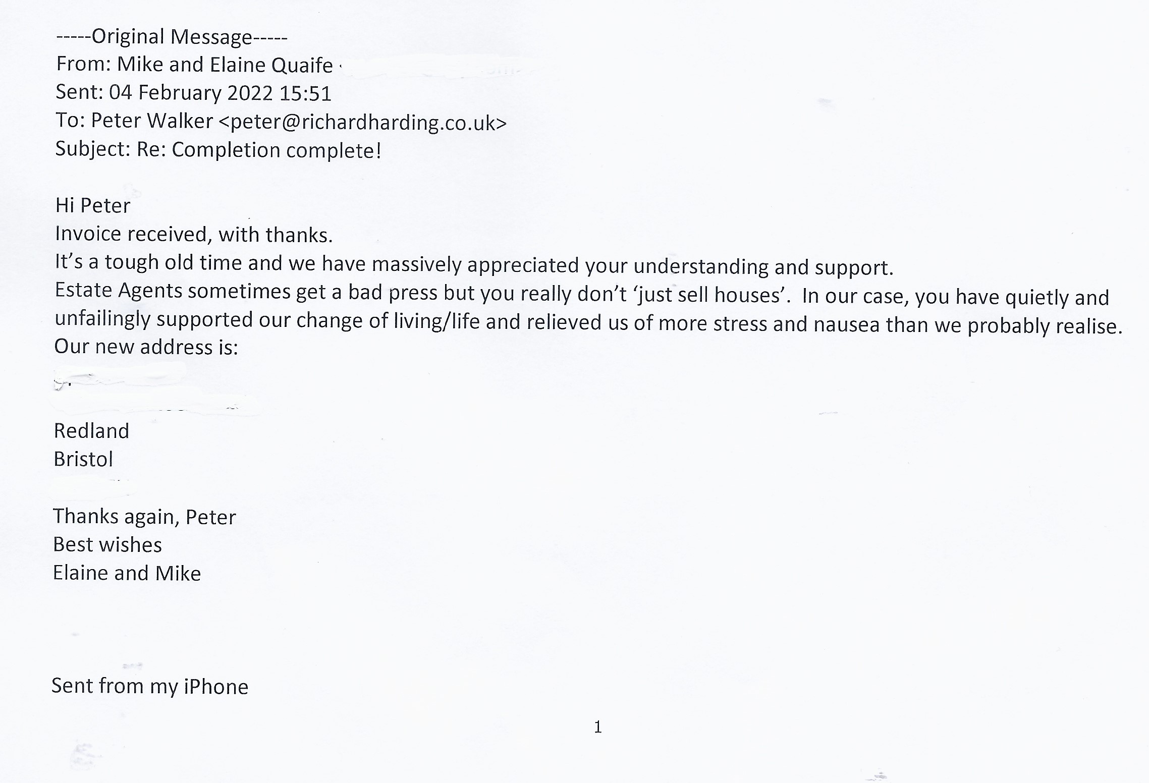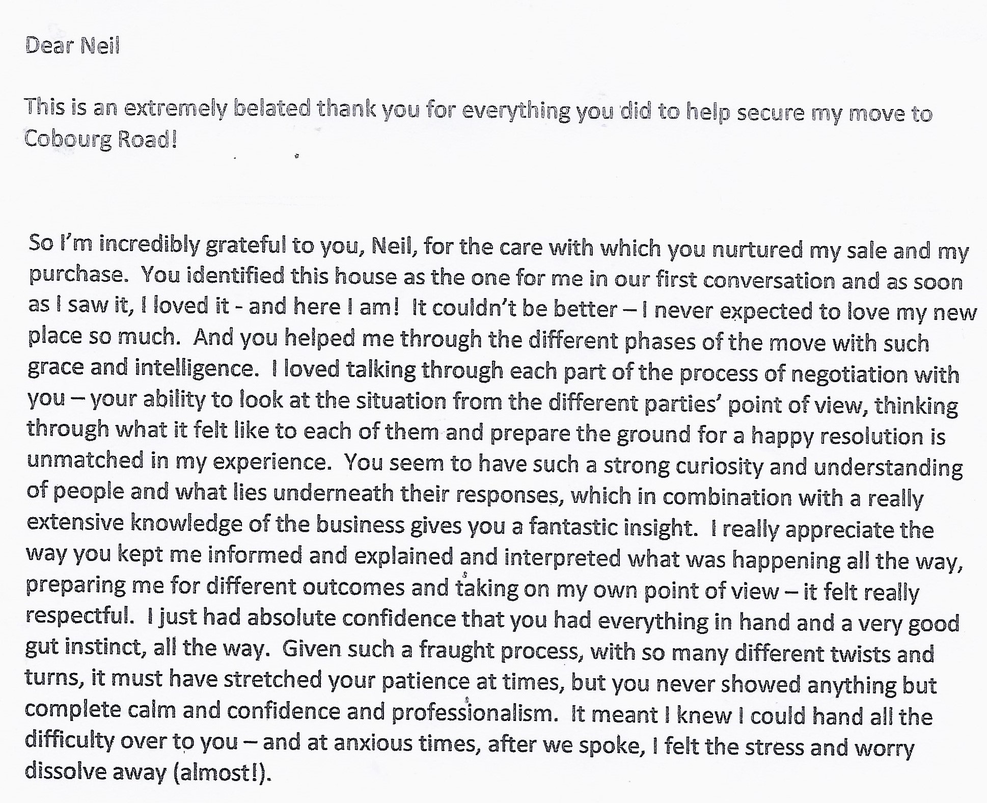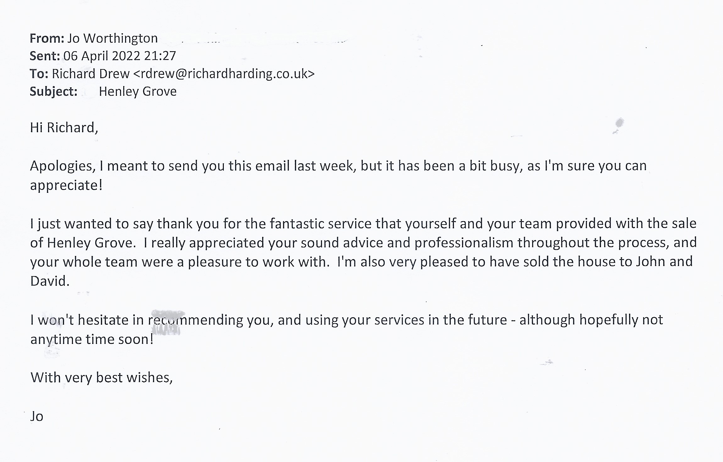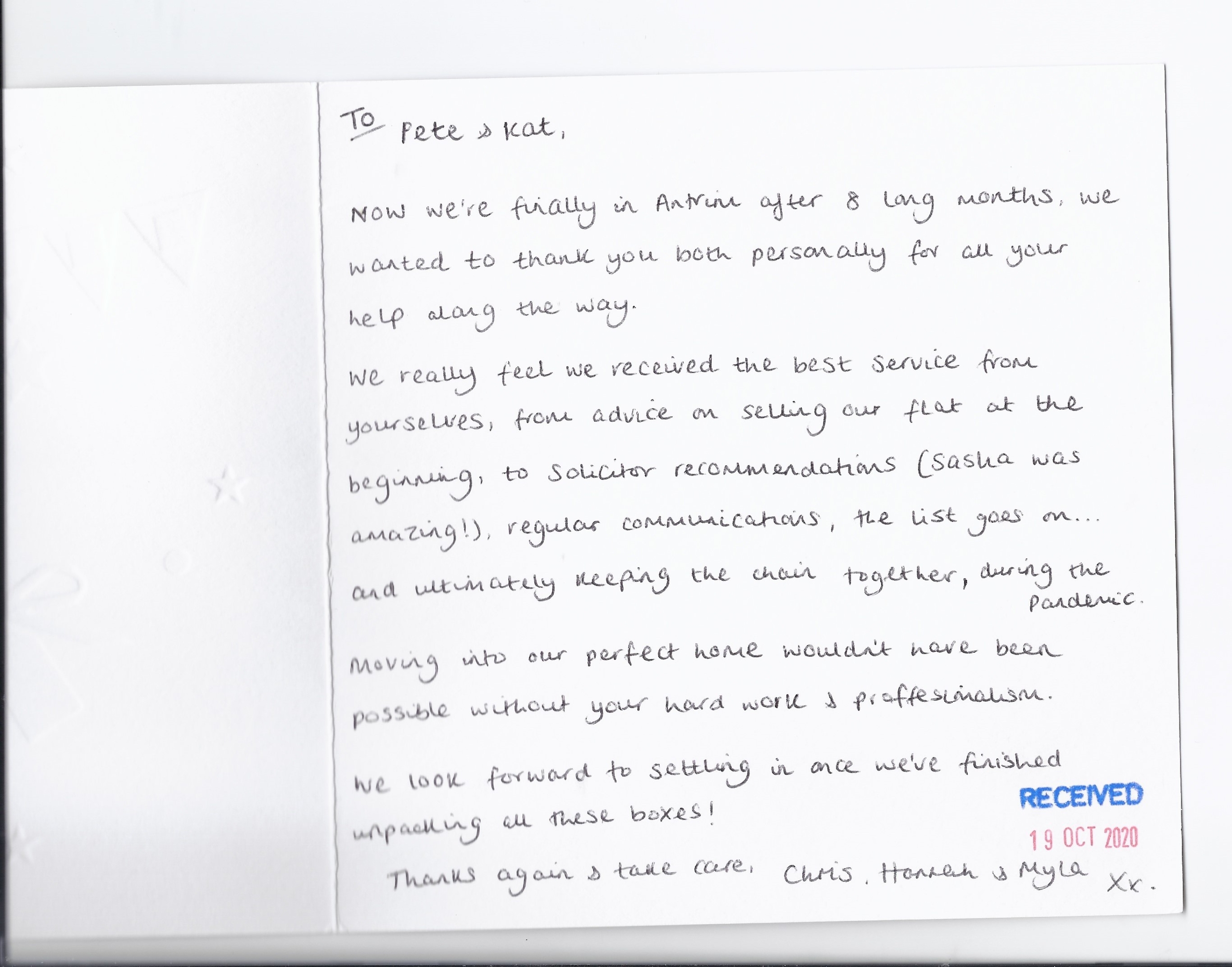 You are welcome to inspect any of the original letters, cards and emails which are held on file in our office or speak to any one of our clients – with their permission – regarding their personal experience of moving with Richard Harding. These testimonials date from the present back to our early years so that you can see we have consistently maintained high standards.