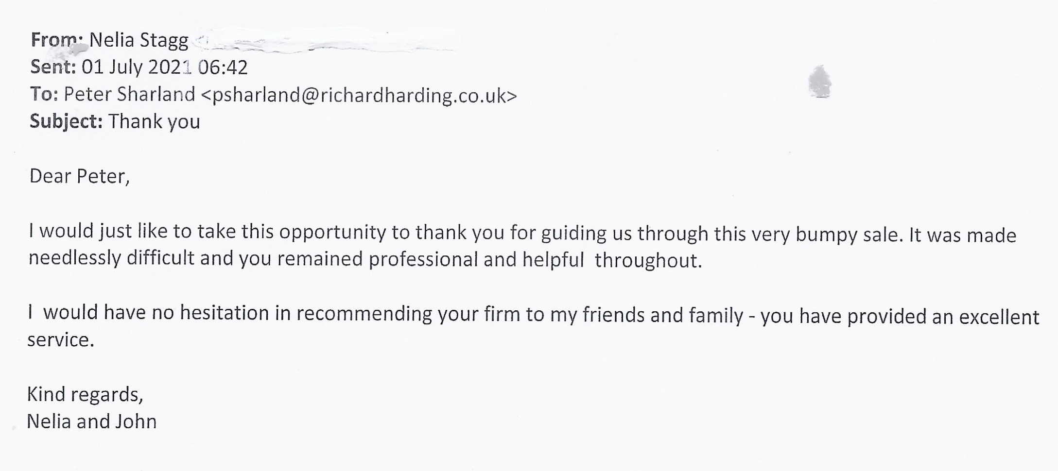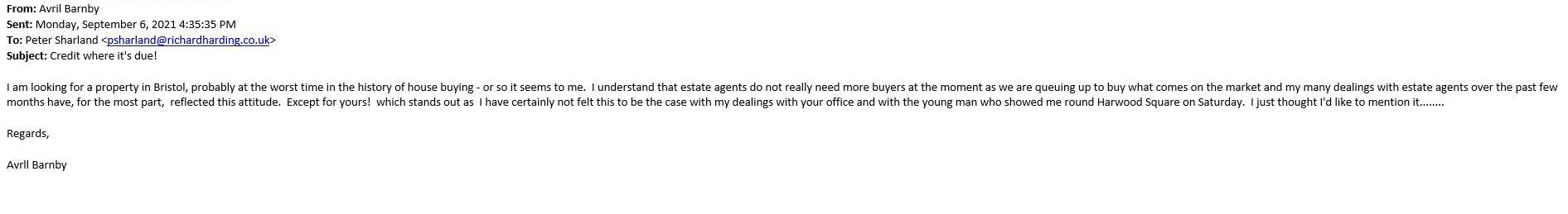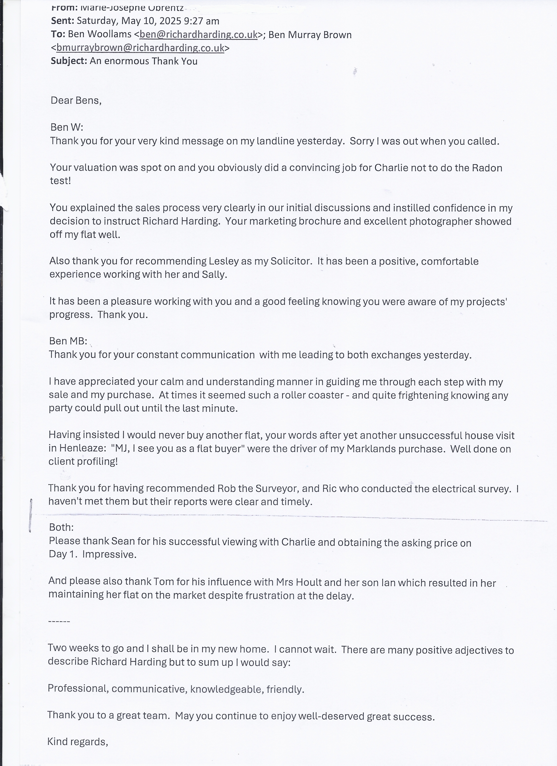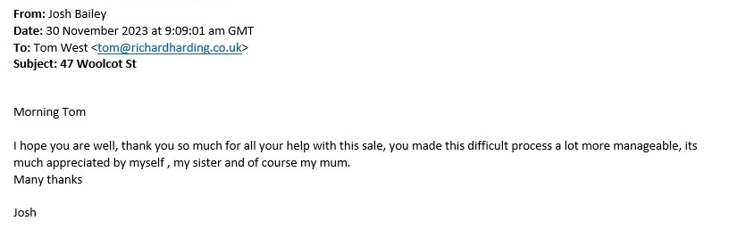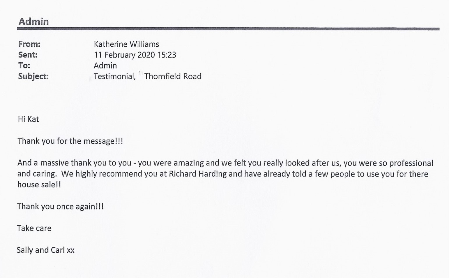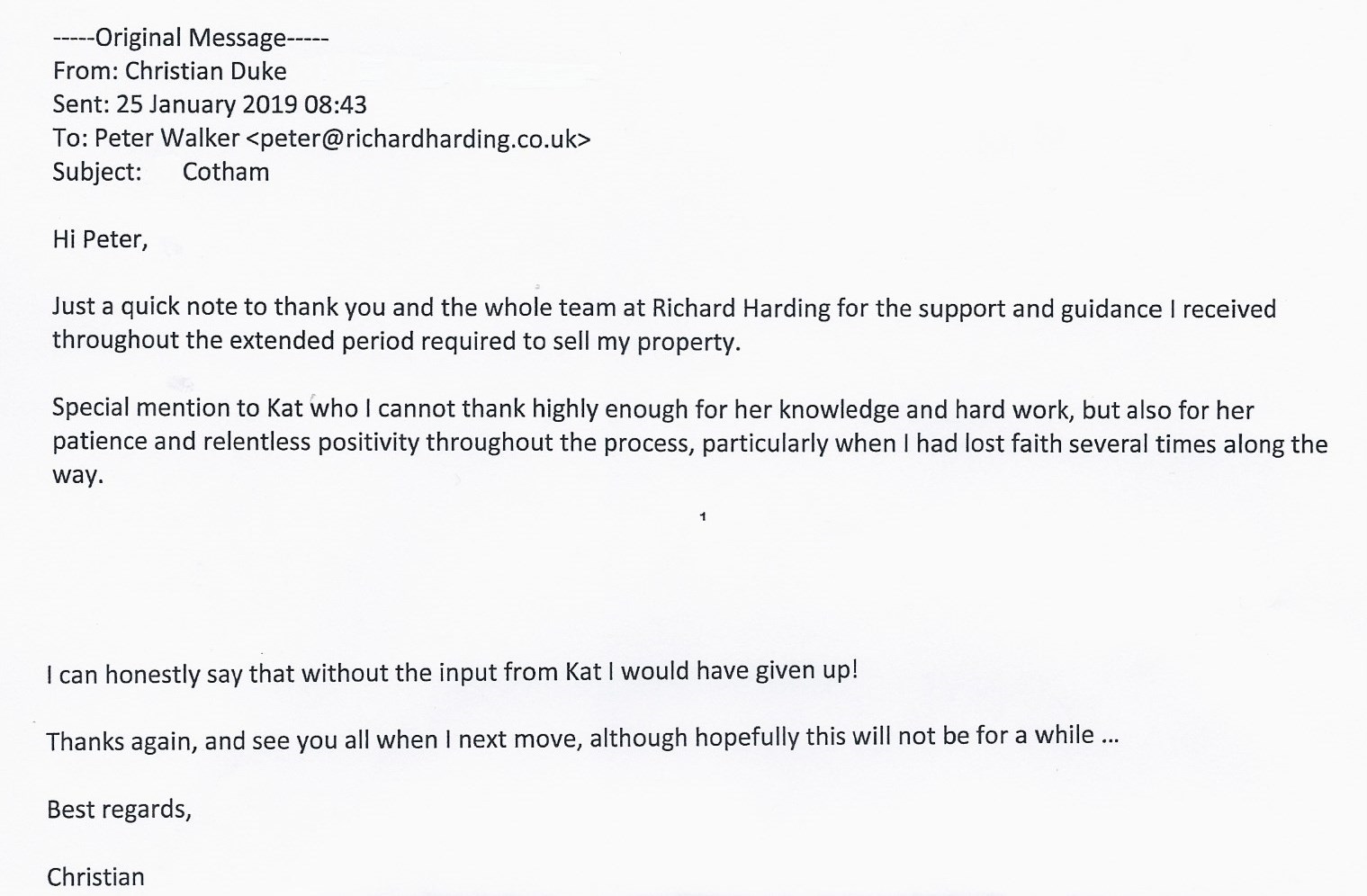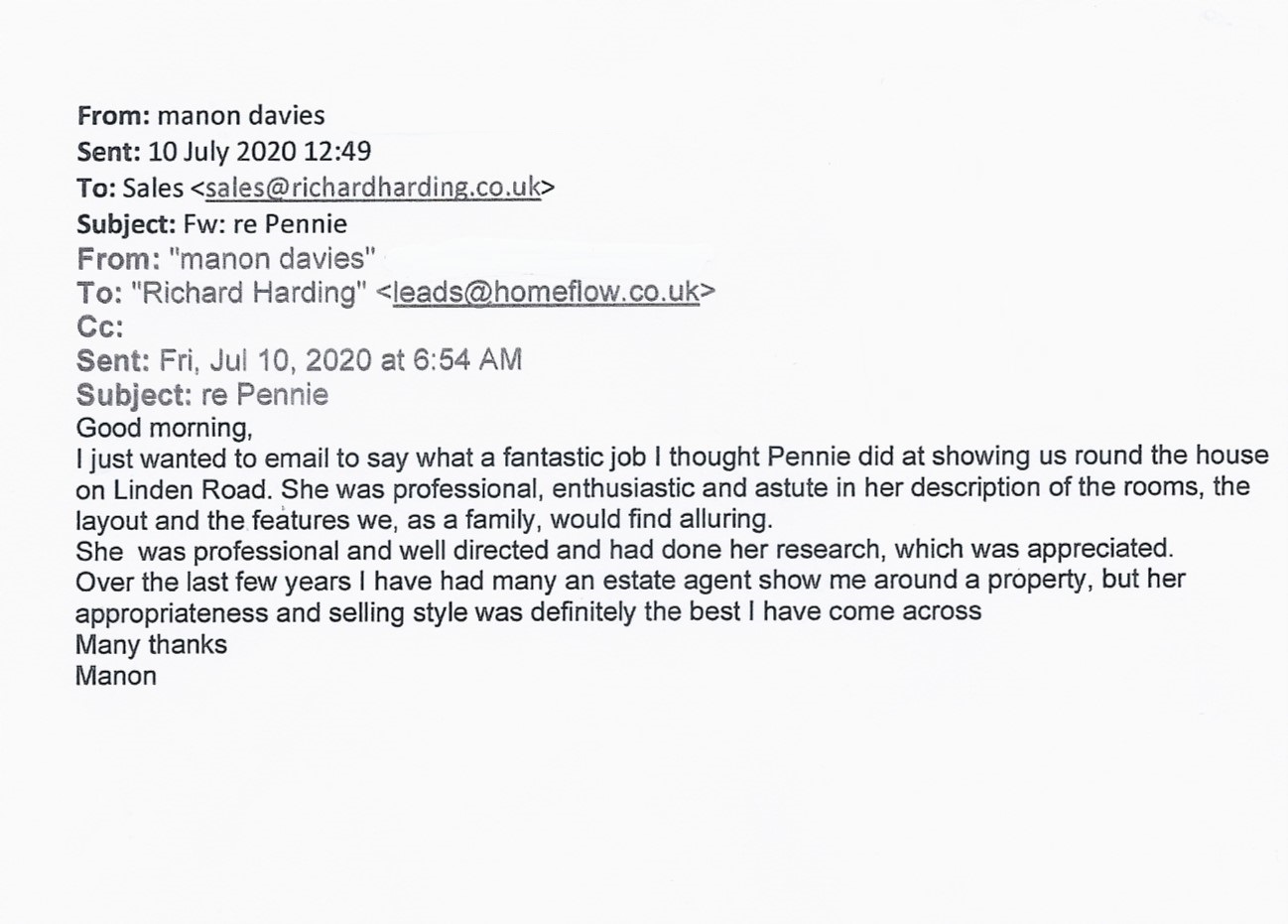 You are welcome to inspect any of the original letters, cards and emails which are held on file in our office or speak to any one of our clients – with their permission – regarding their personal experience of moving with Richard Harding. These testimonials date from the present back to our early years so that you can see we have consistently maintained high standards.