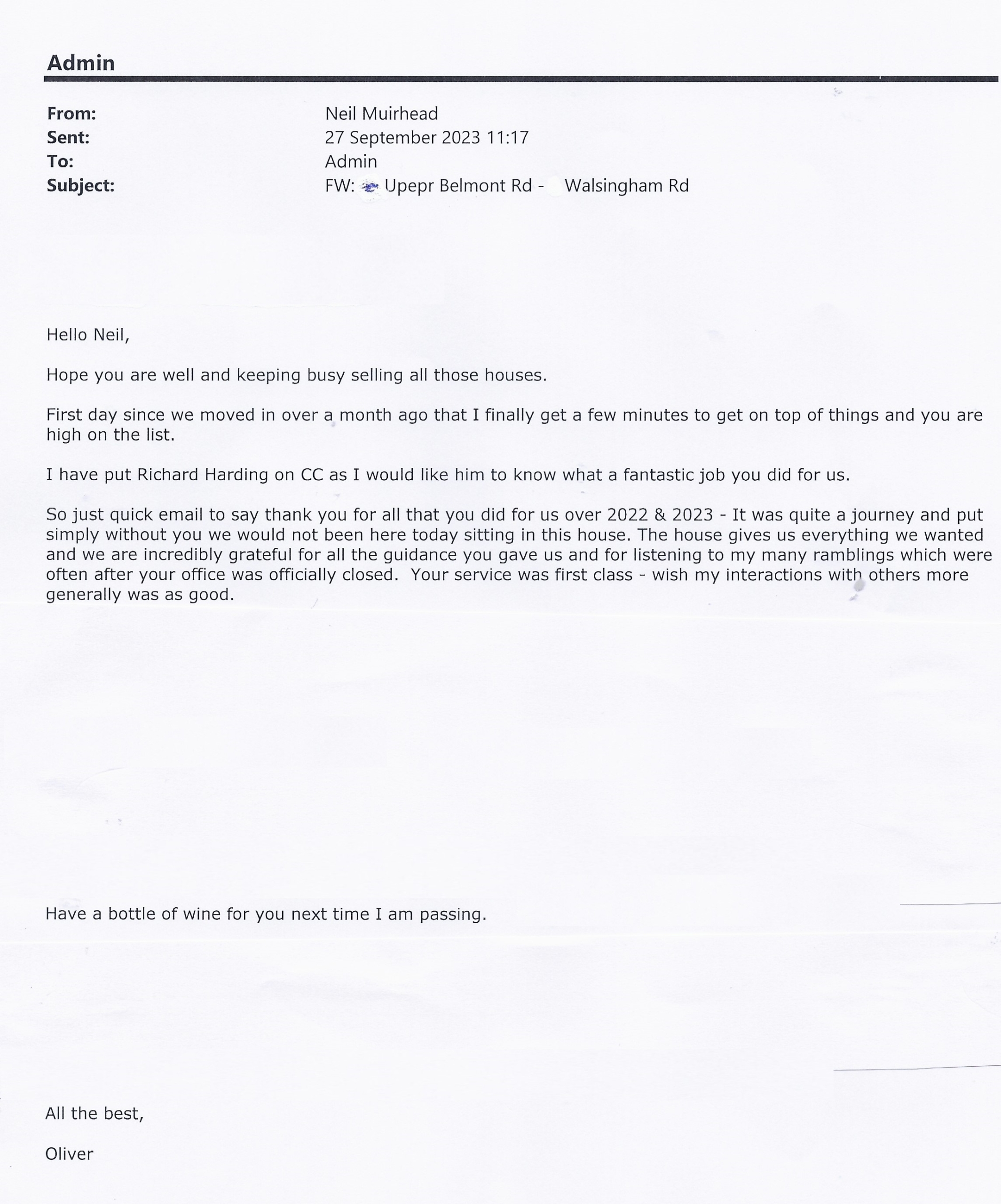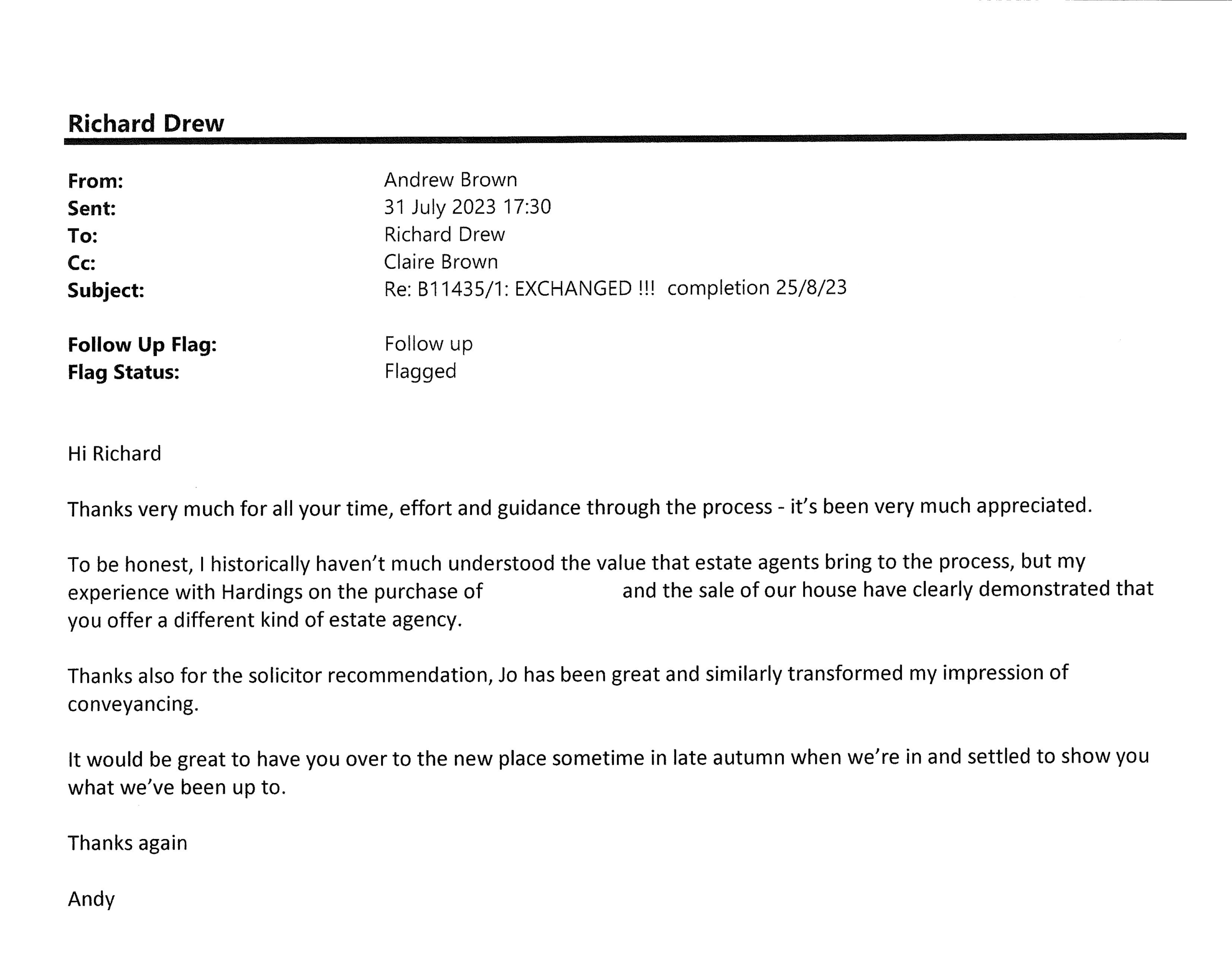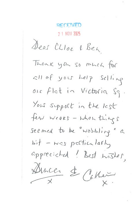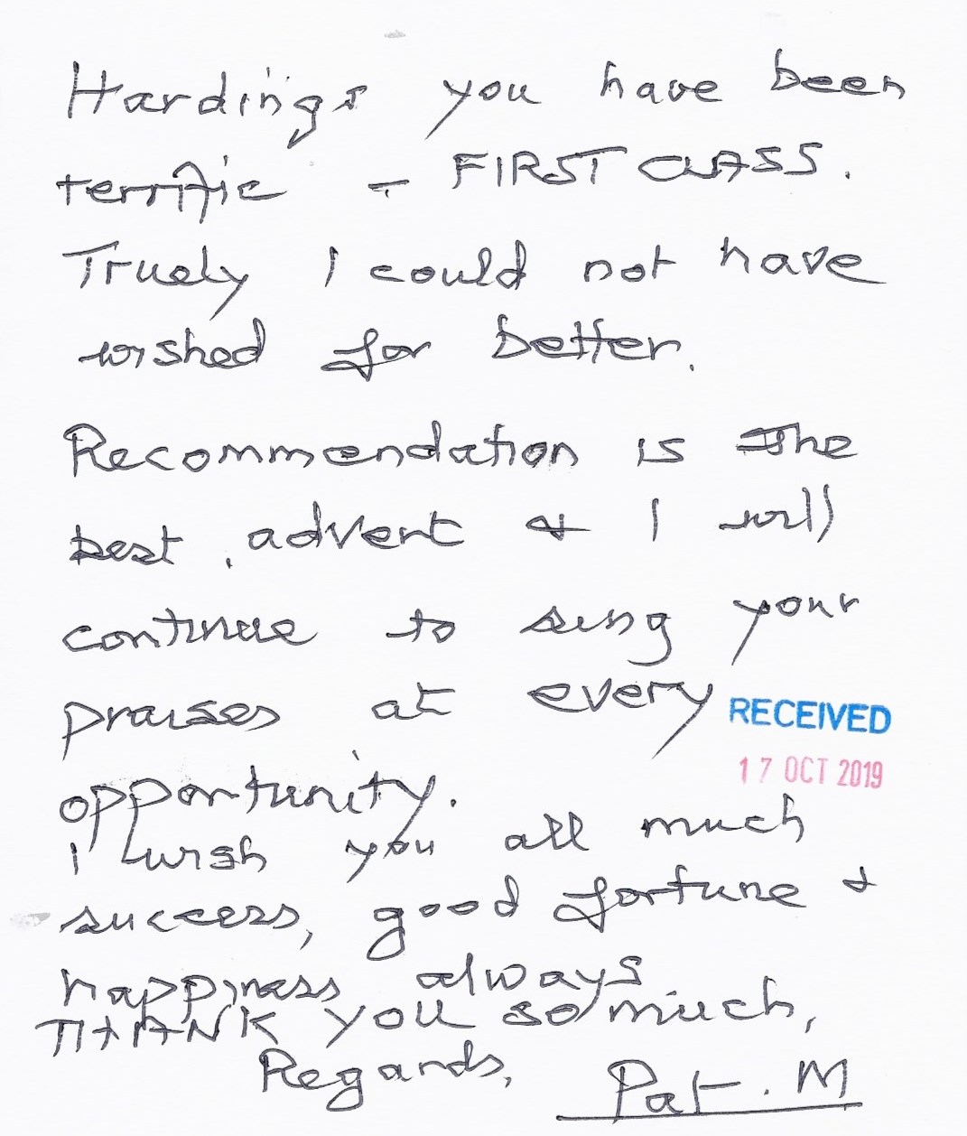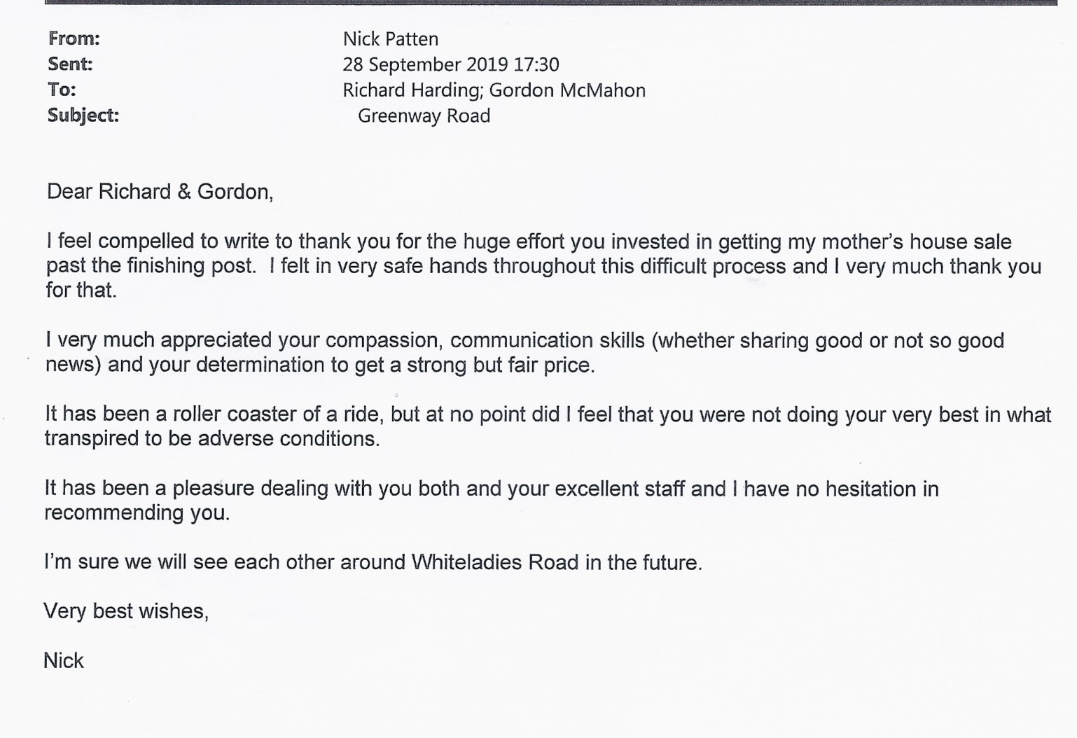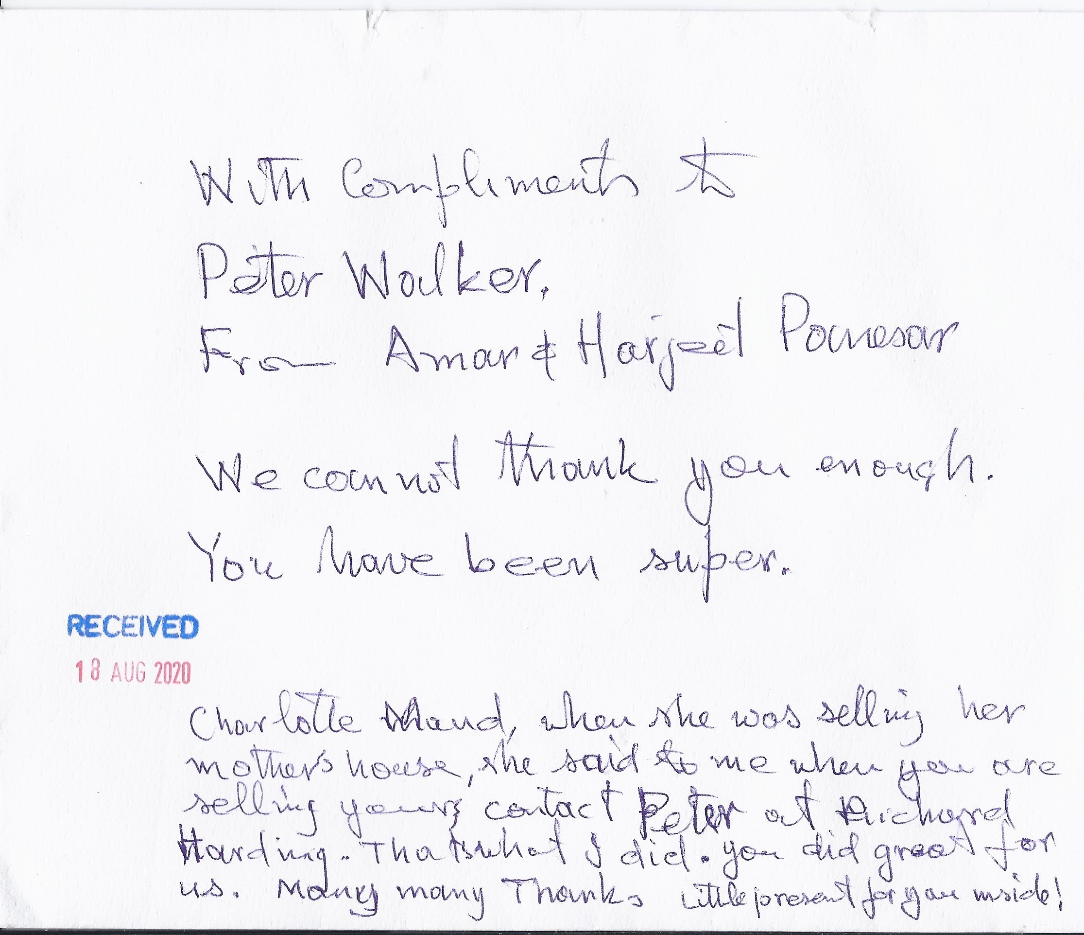You are welcome to inspect any of the original letters, cards and emails which are held on file in our office or speak to any one of our clients – with their permission – regarding their personal experience of moving with Richard Harding. These testimonials date from the present back to our early years so that you can see we have consistently maintained high standards.