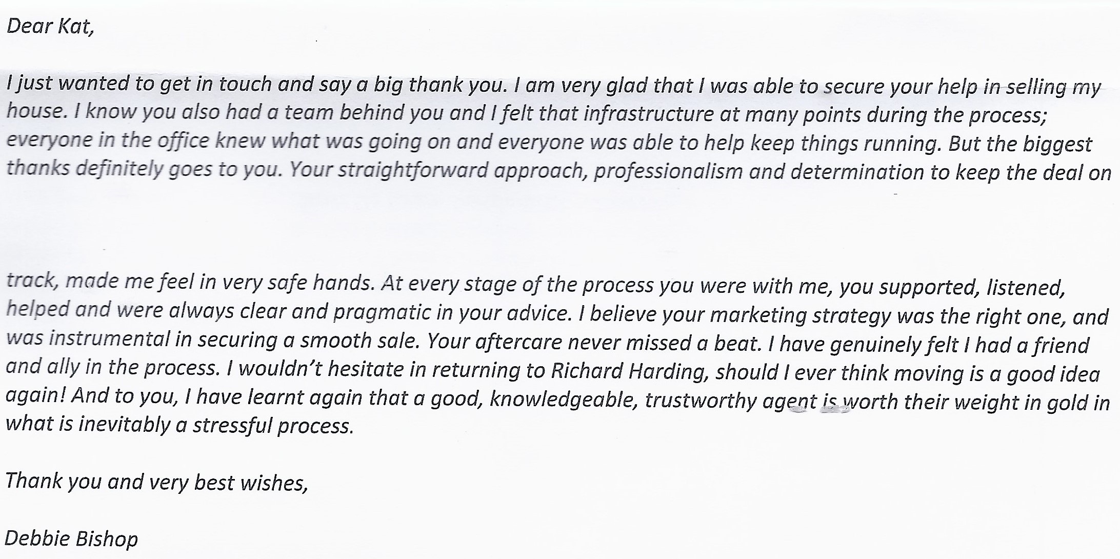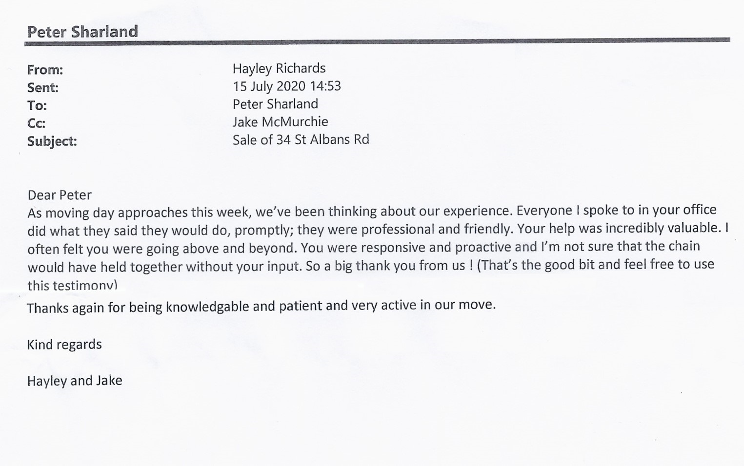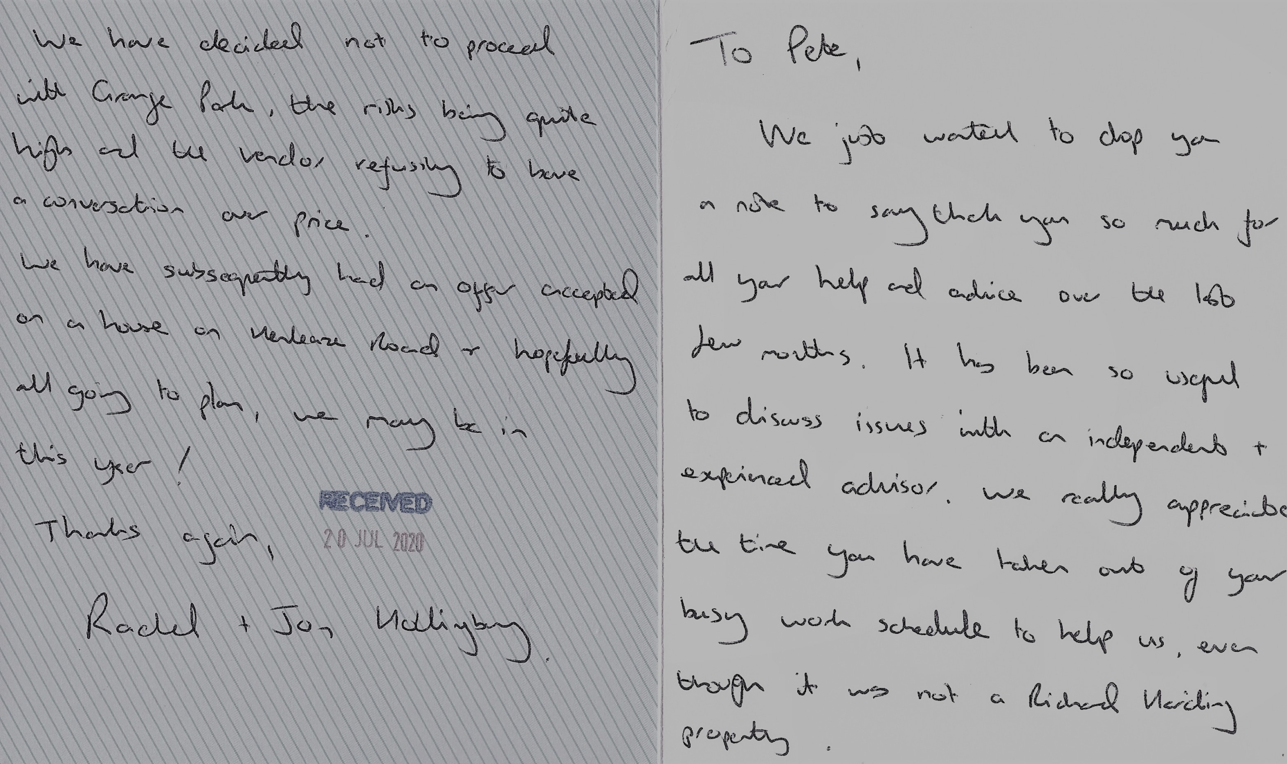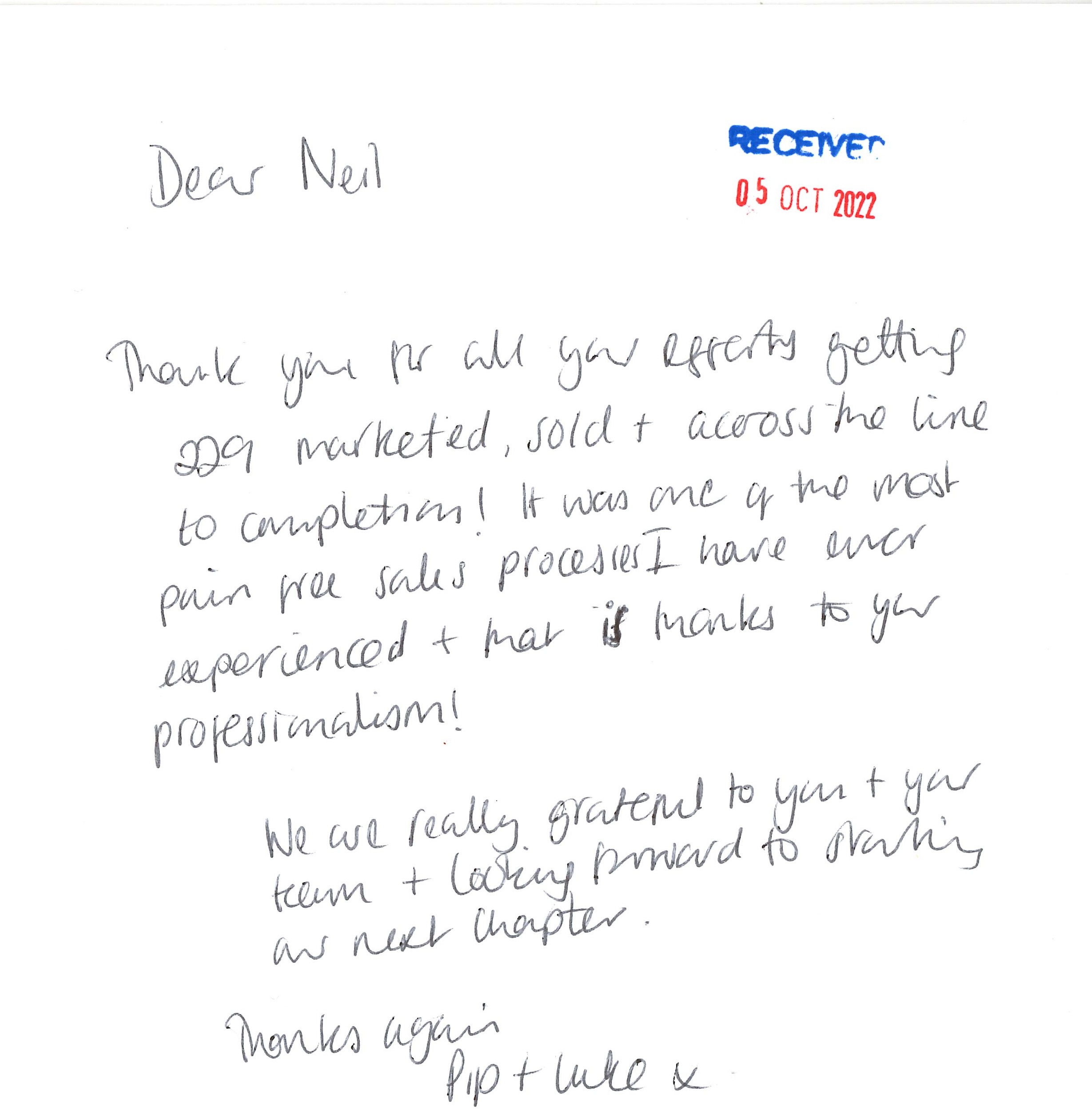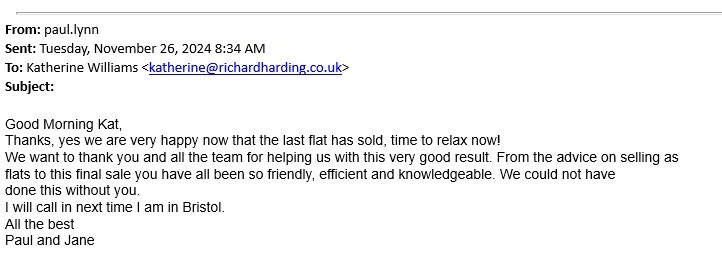 You are welcome to inspect any of the original letters, cards and emails which are held on file in our office or speak to any one of our clients – with their permission – regarding their personal experience of moving with Richard Harding. These testimonials date from the present back to our early years so that you can see we have consistently maintained high standards.