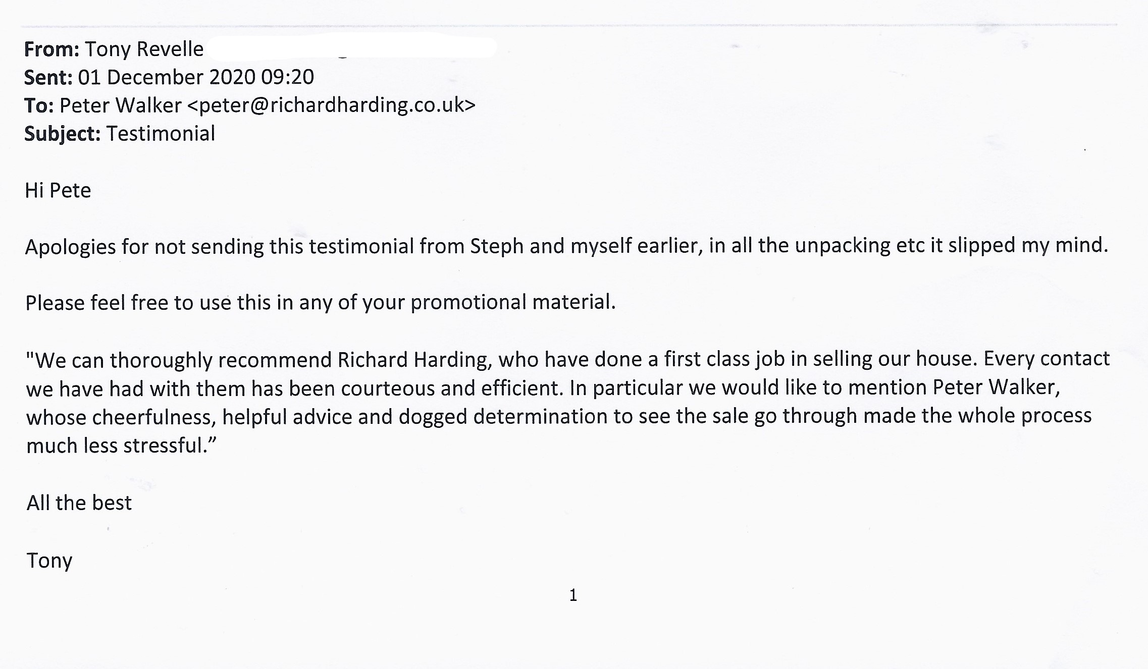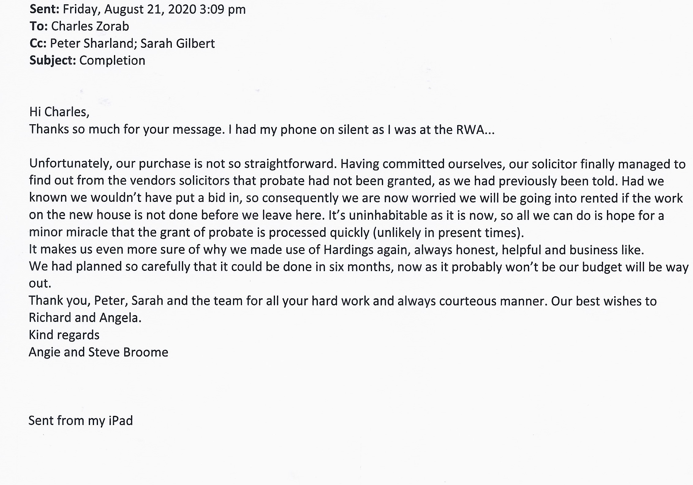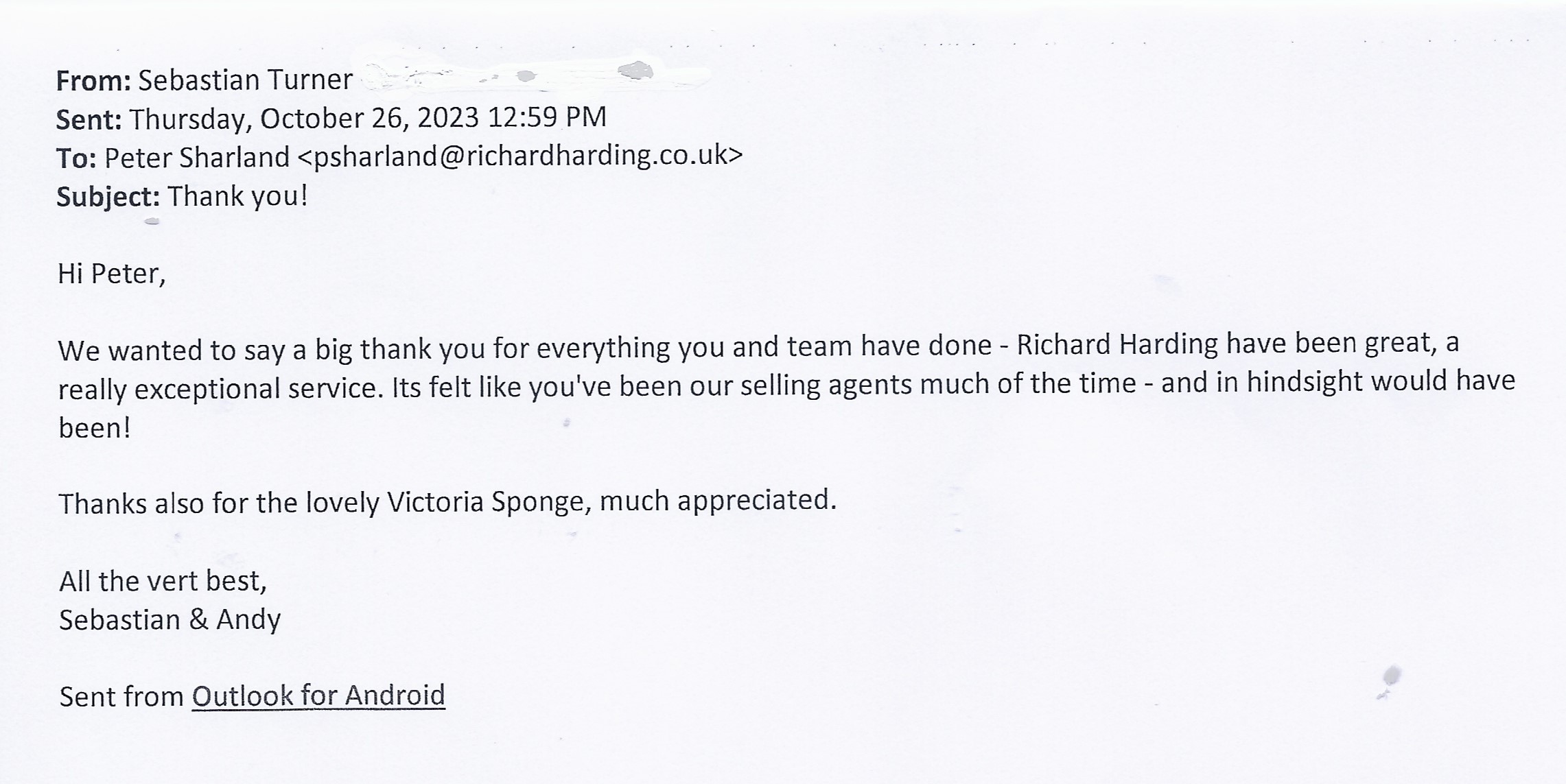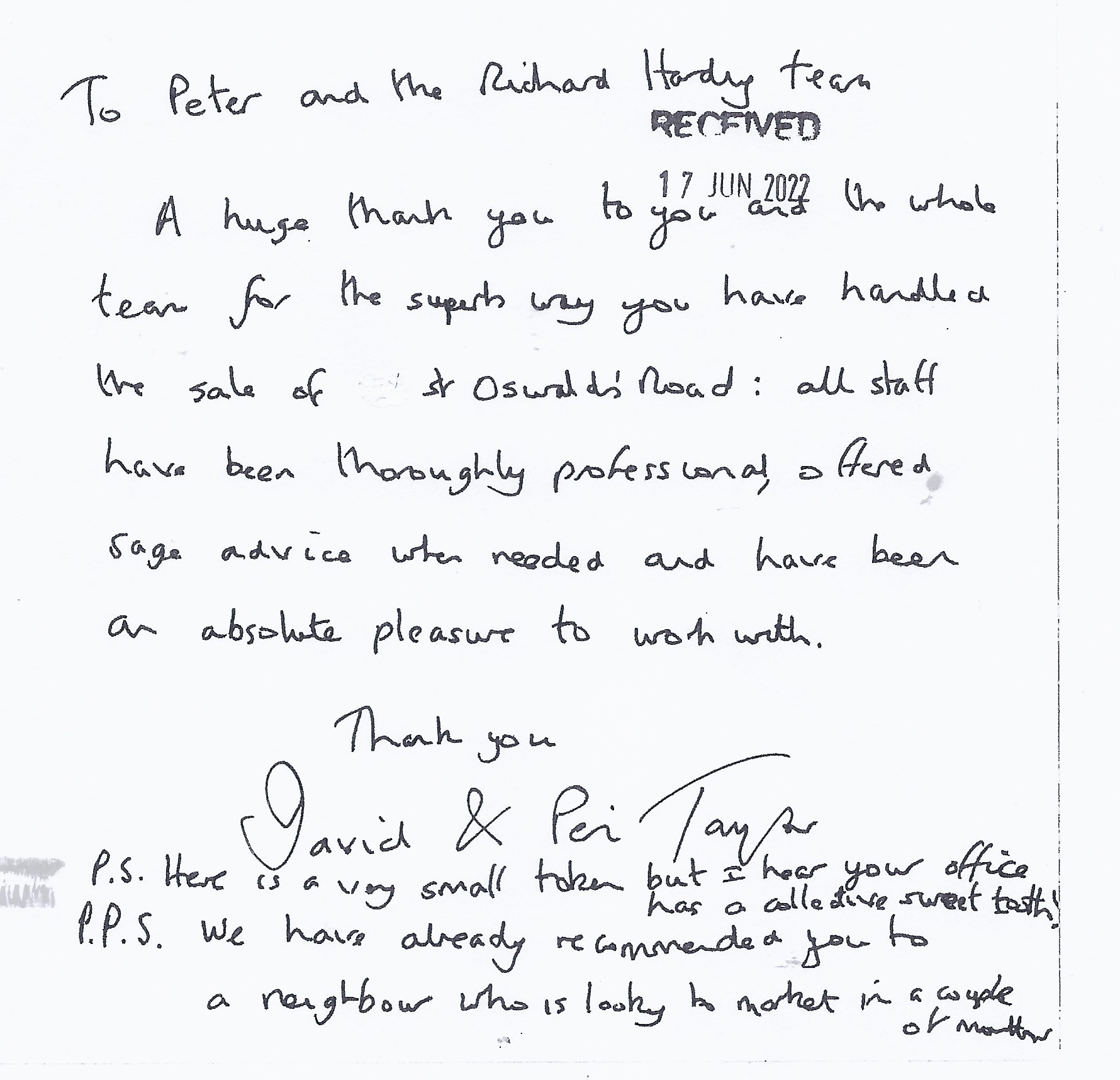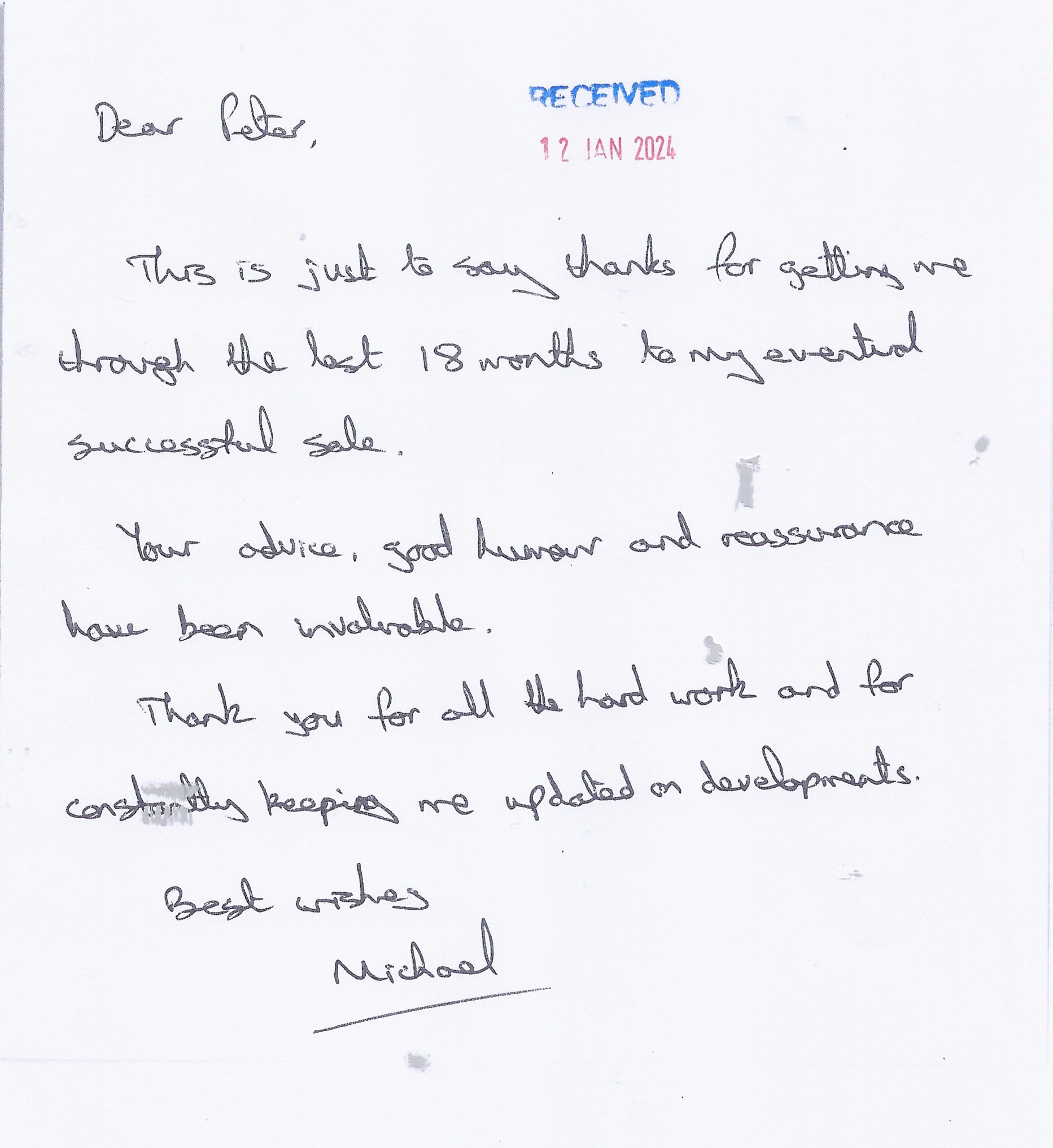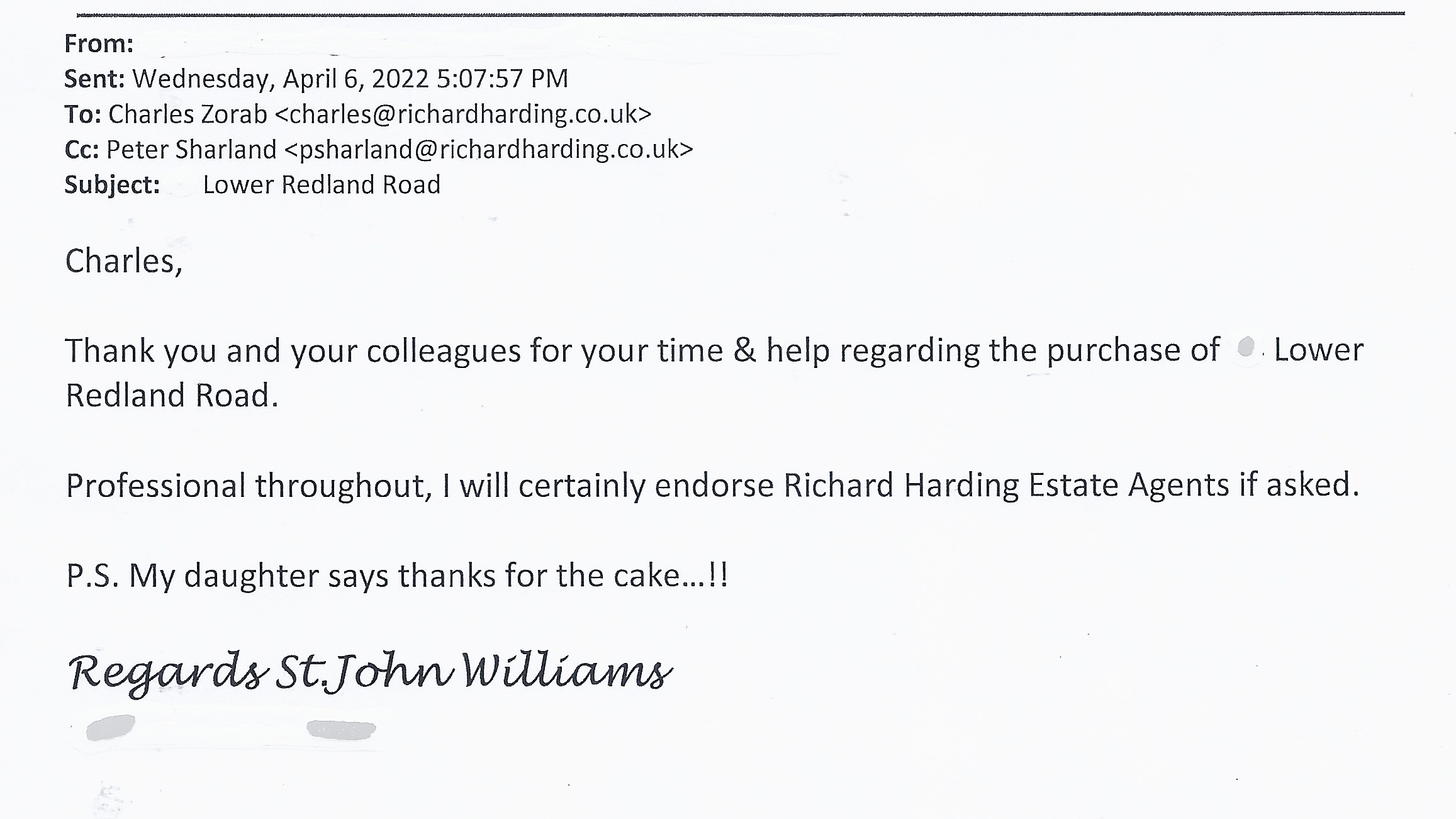 You are welcome to inspect any of the original letters, cards and emails which are held on file in our office or speak to any one of our clients – with their permission – regarding their personal experience of moving with Richard Harding. These testimonials date from the present back to our early years so that you can see we have consistently maintained high standards.