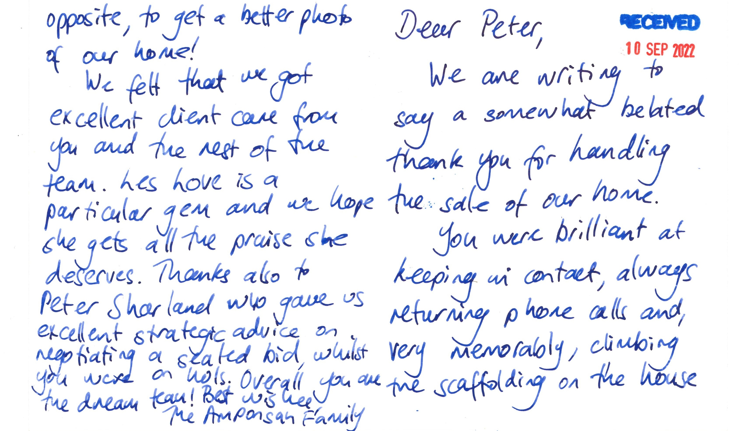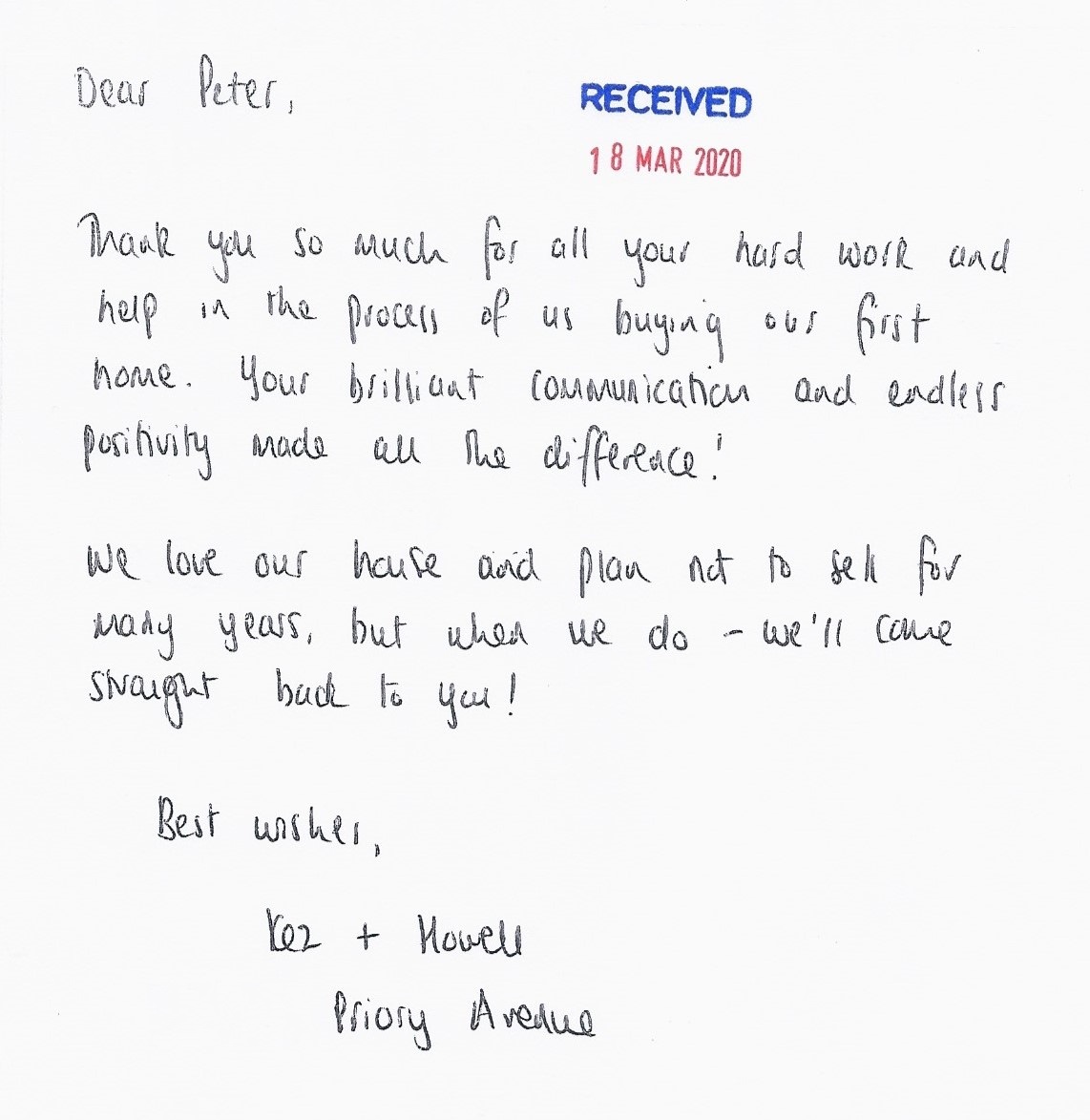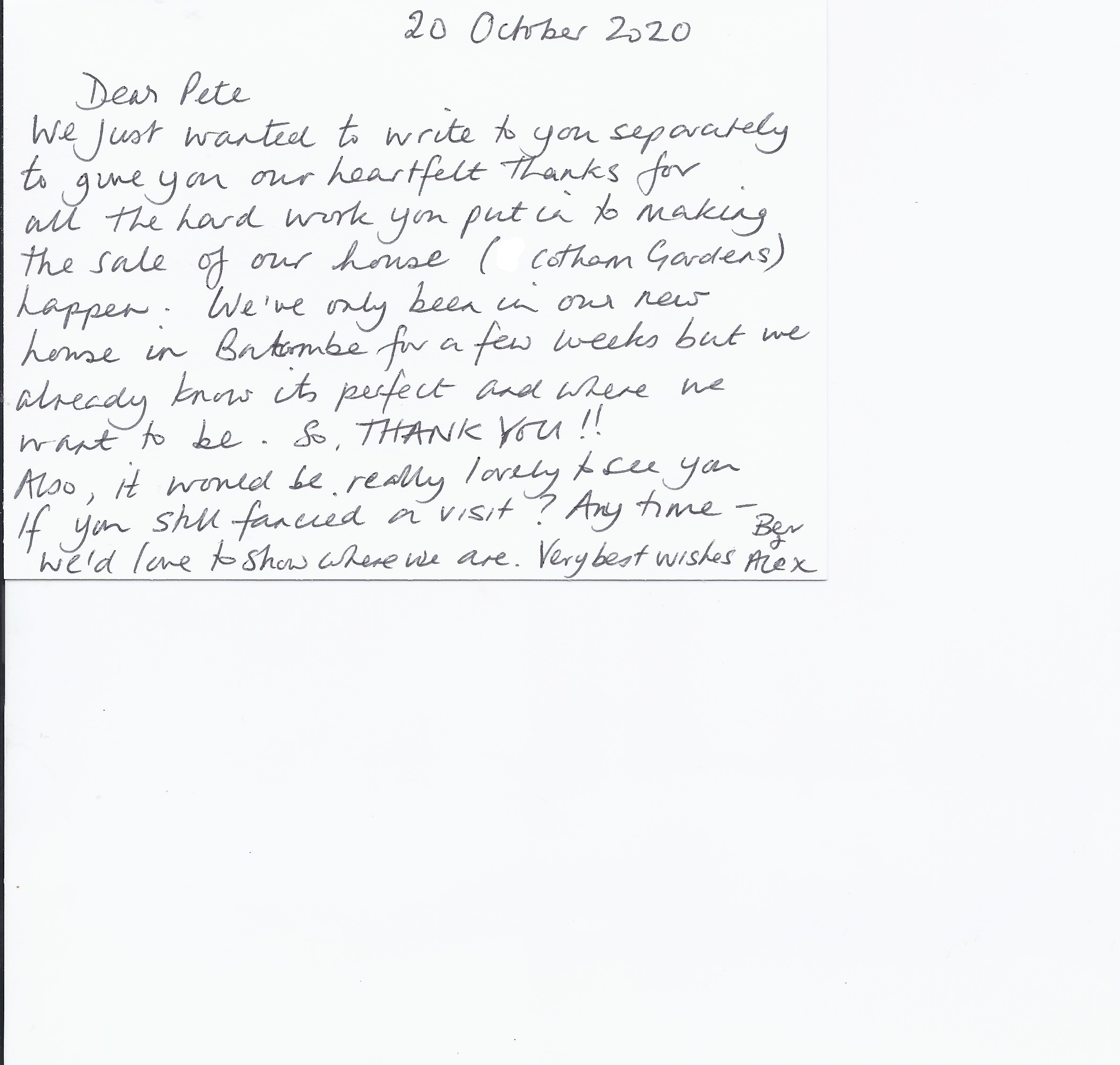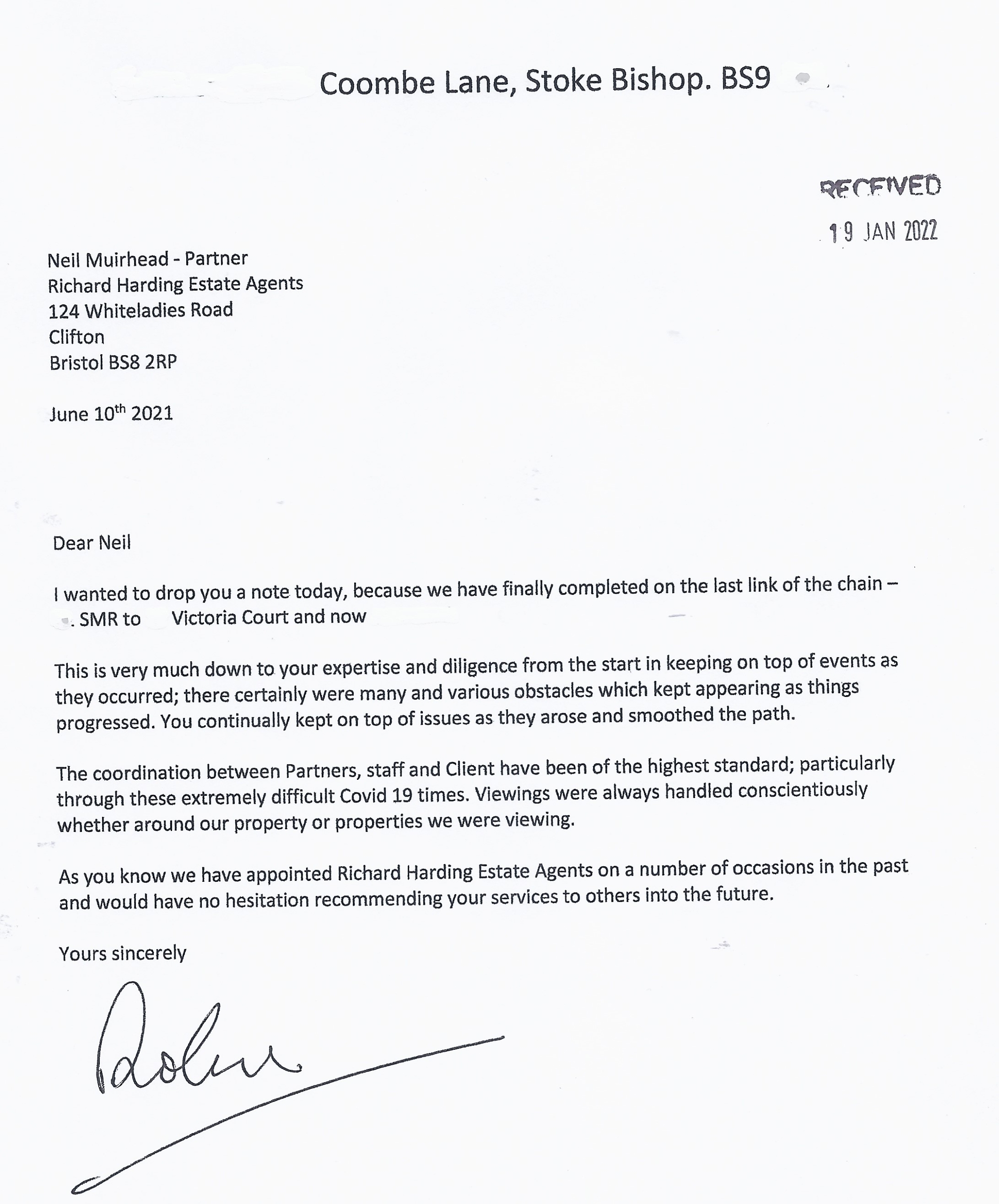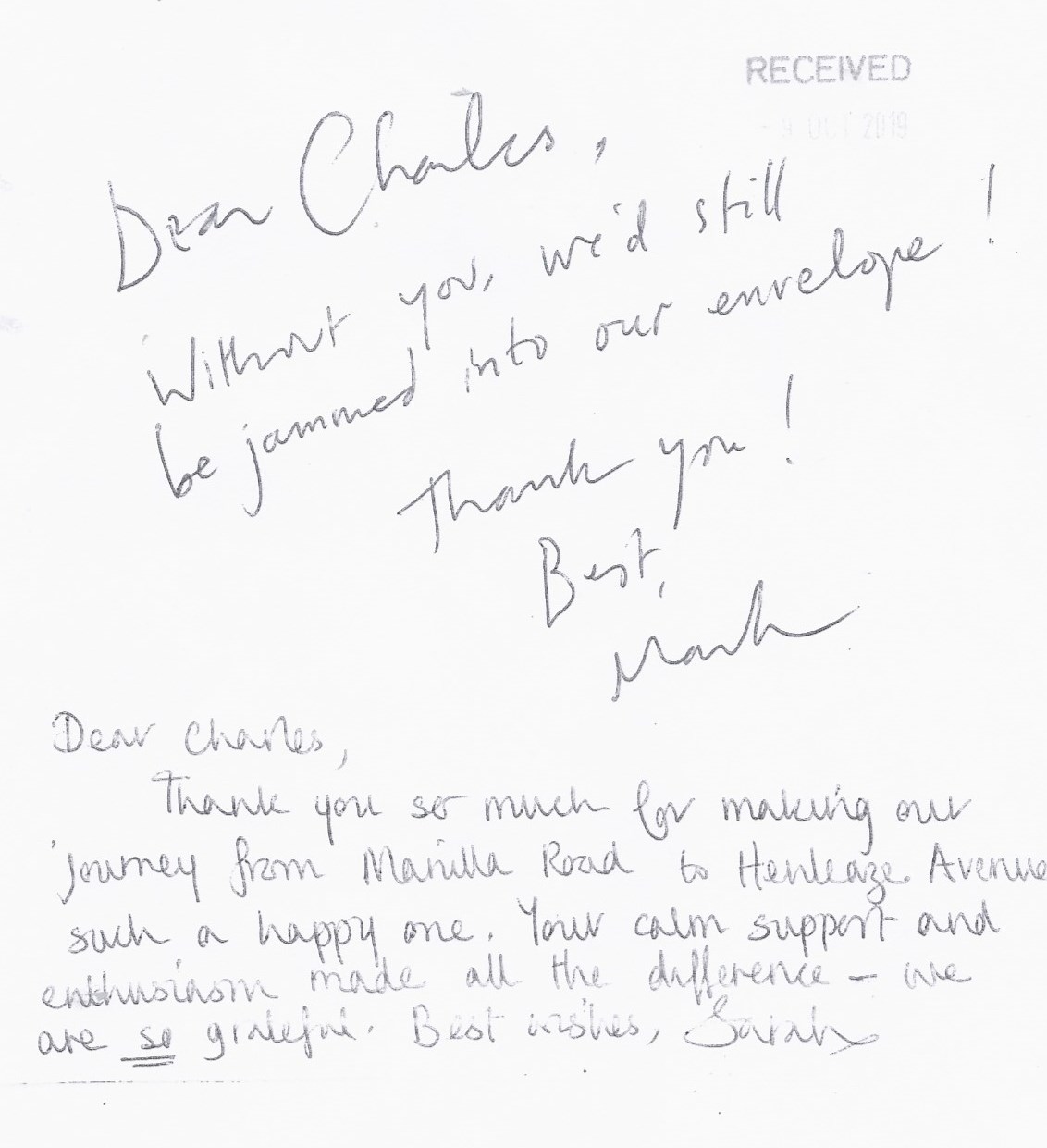 You are welcome to inspect any of the original letters, cards and emails which are held on file in our office or speak to any one of our clients – with their permission – regarding their personal experience of moving with Richard Harding. These testimonials date from the present back to our early years so that you can see we have consistently maintained high standards.