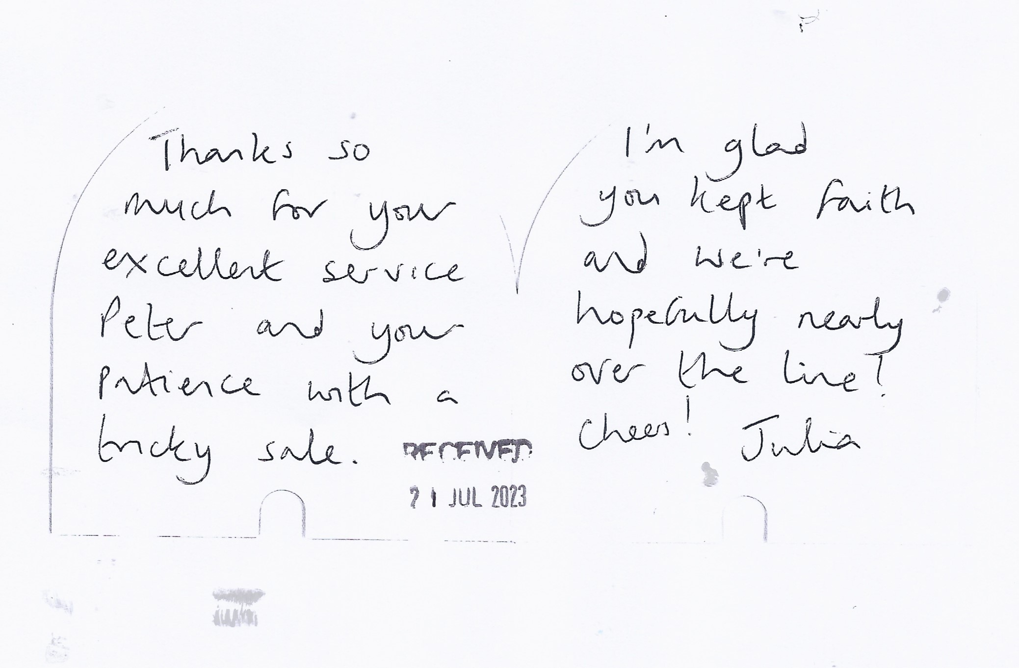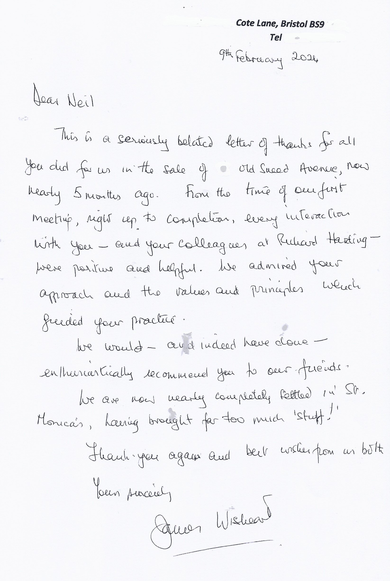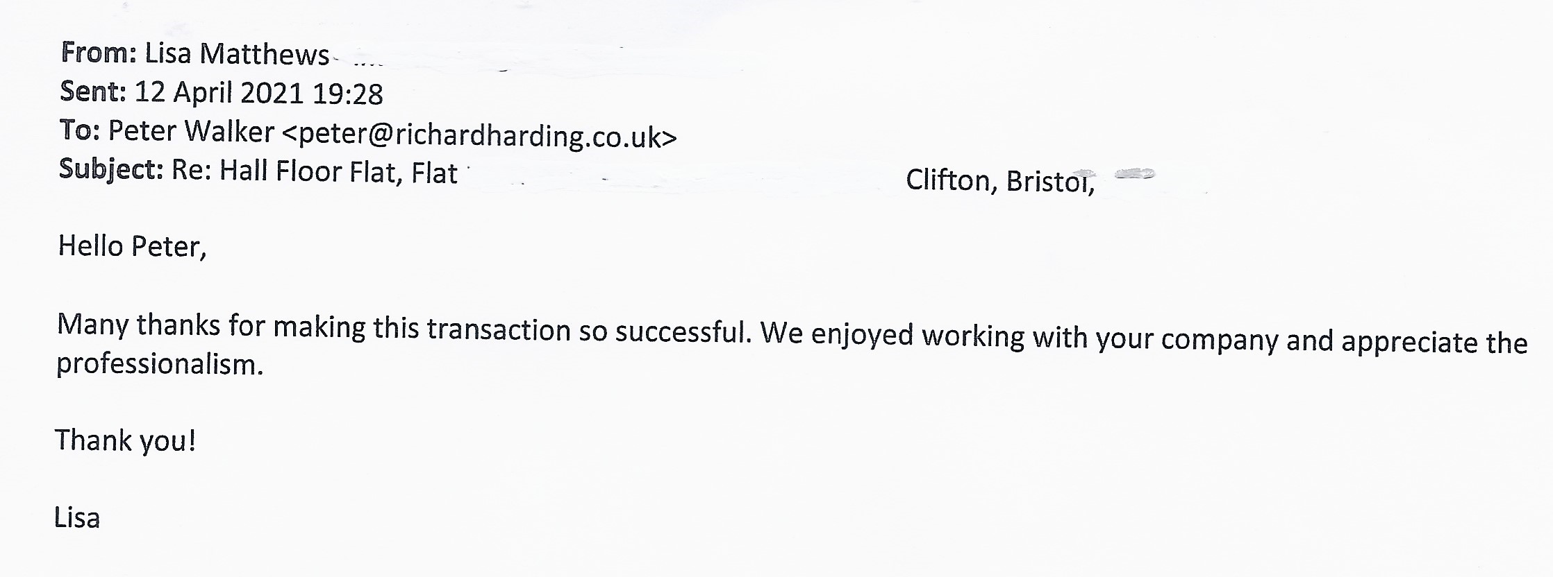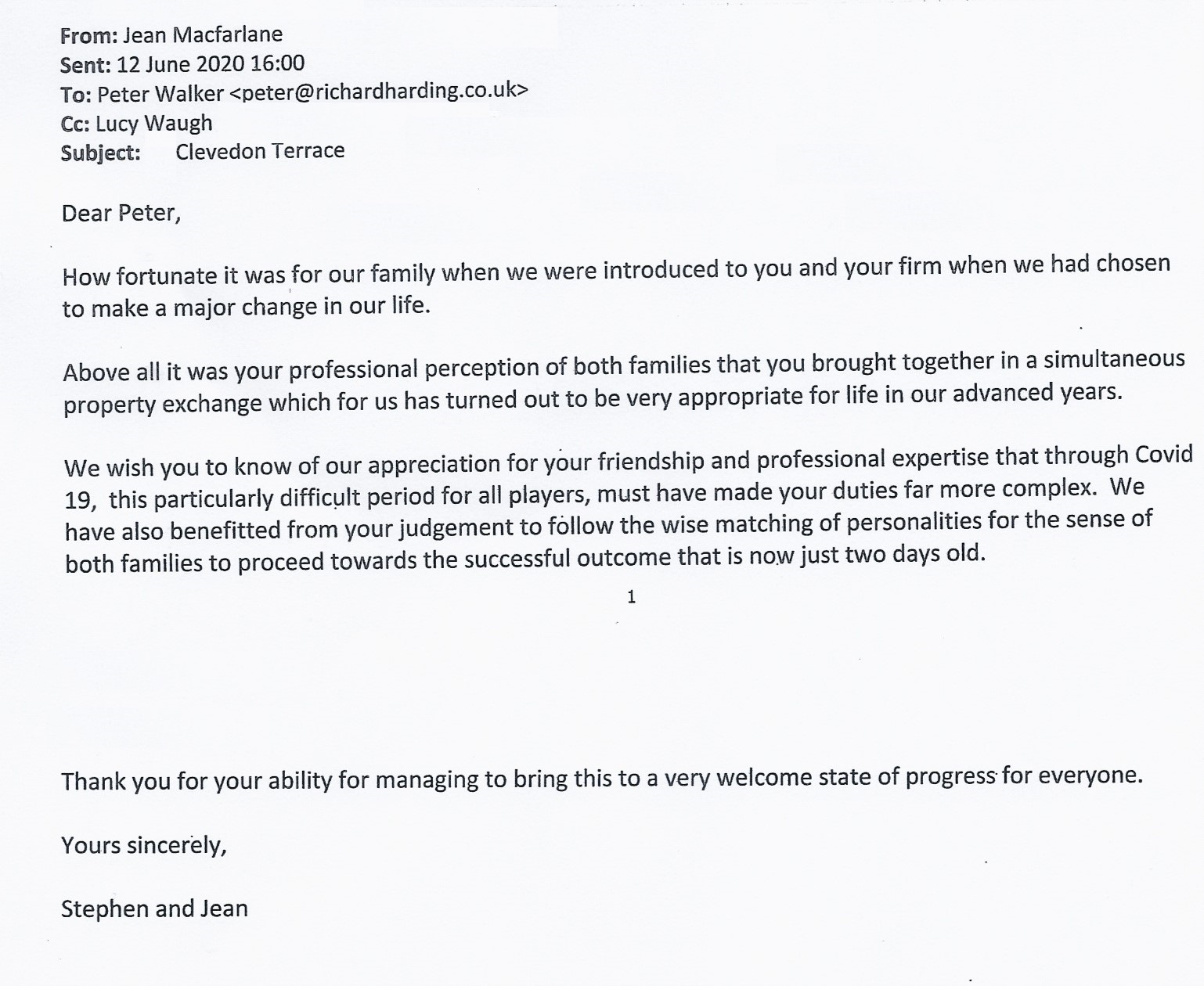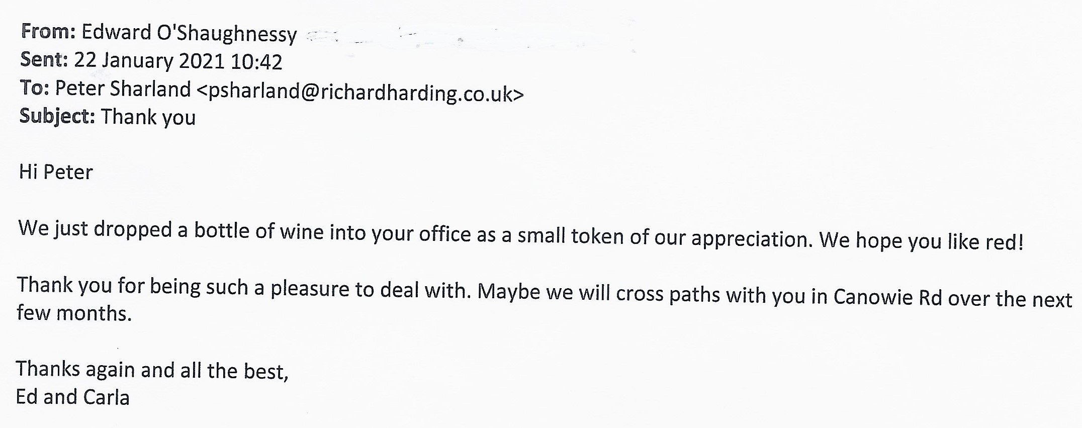 You are welcome to inspect any of the original letters, cards and emails which are held on file in our office or speak to any one of our clients – with their permission – regarding their personal experience of moving with Richard Harding. These testimonials date from the present back to our early years so that you can see we have consistently maintained high standards.