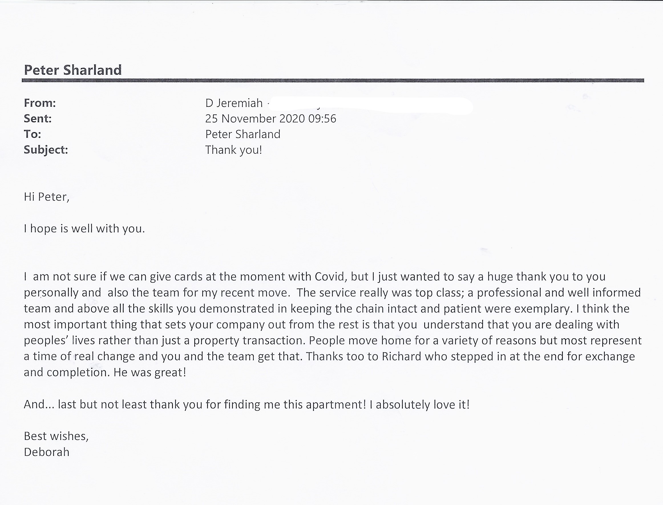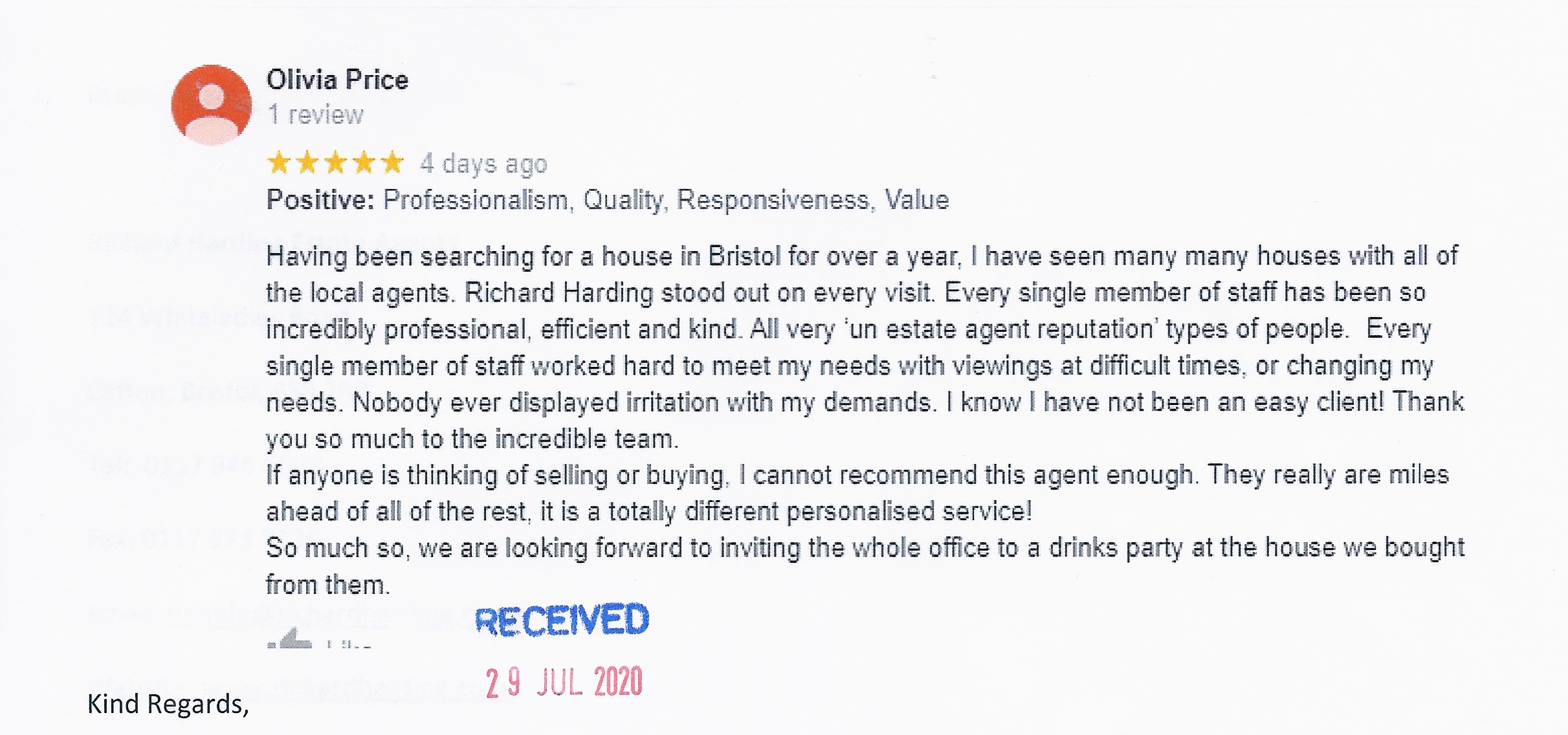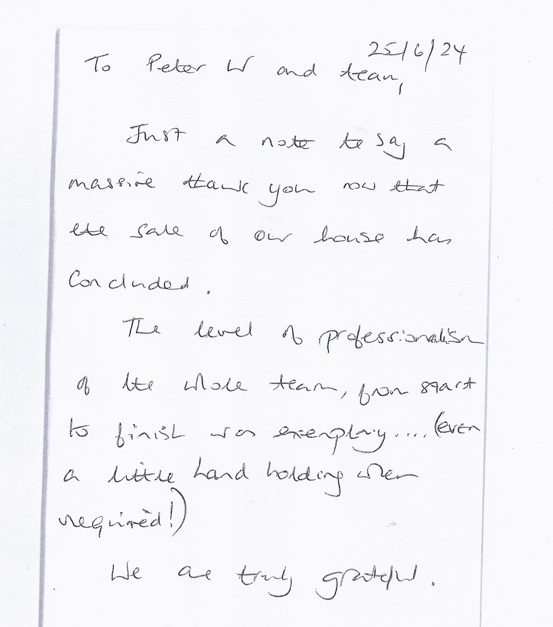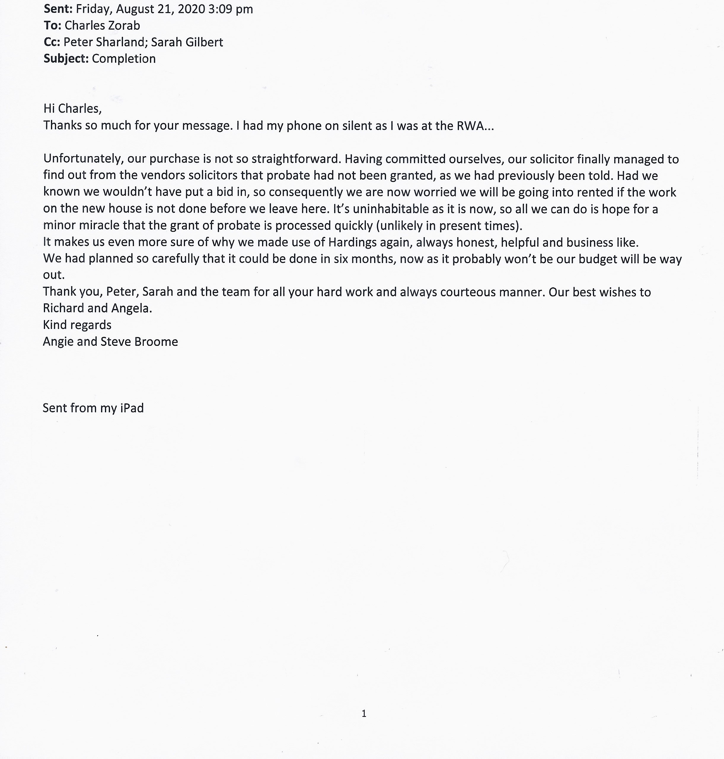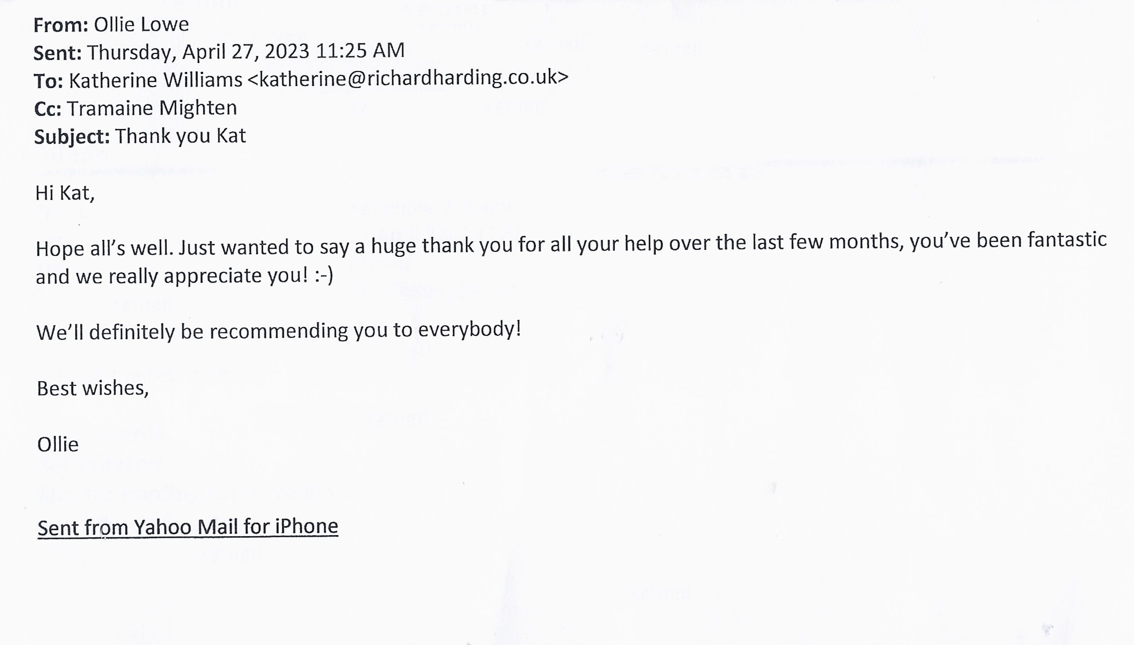 You are welcome to inspect any of the original letters, cards and emails which are held on file in our office or speak to any one of our clients – with their permission – regarding their personal experience of moving with Richard Harding. These testimonials date from the present back to our early years so that you can see we have consistently maintained high standards.