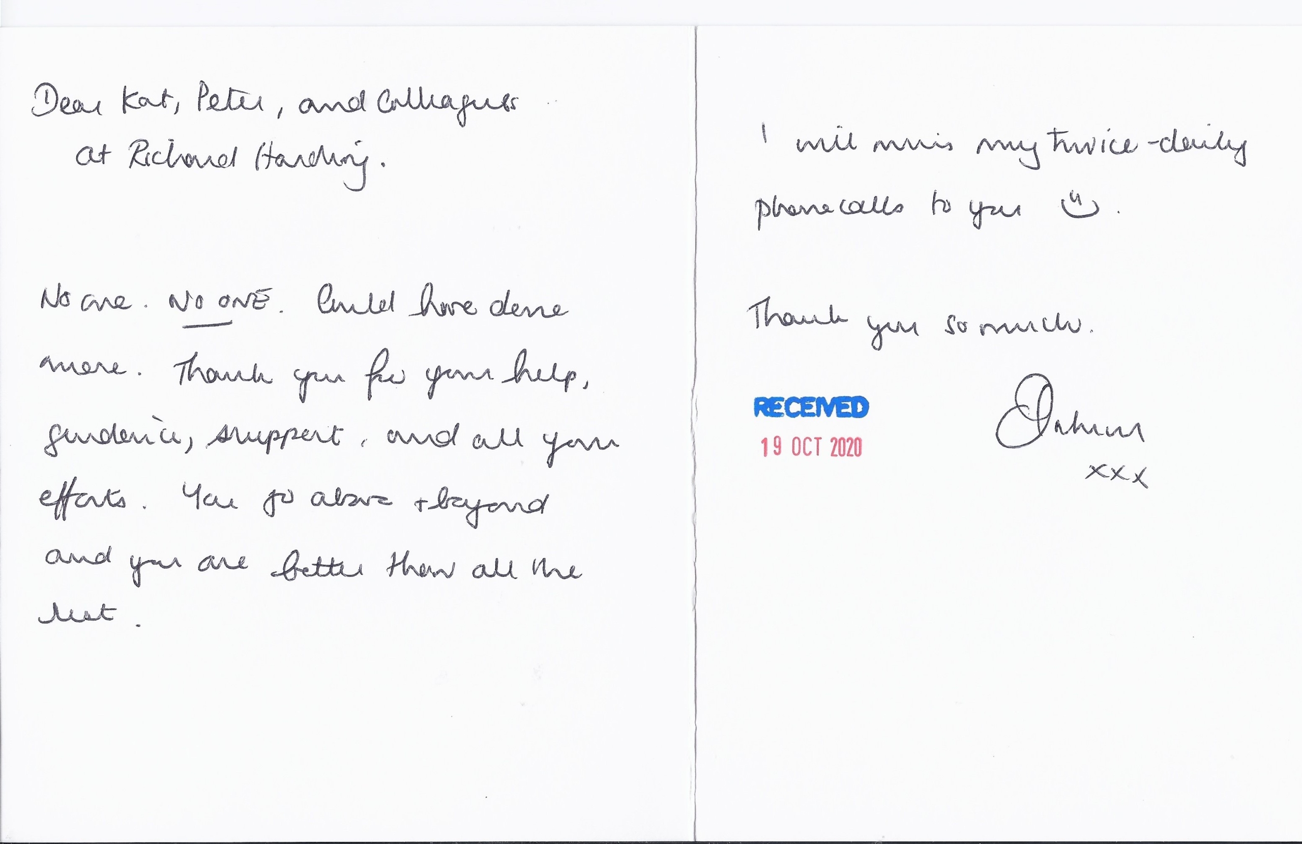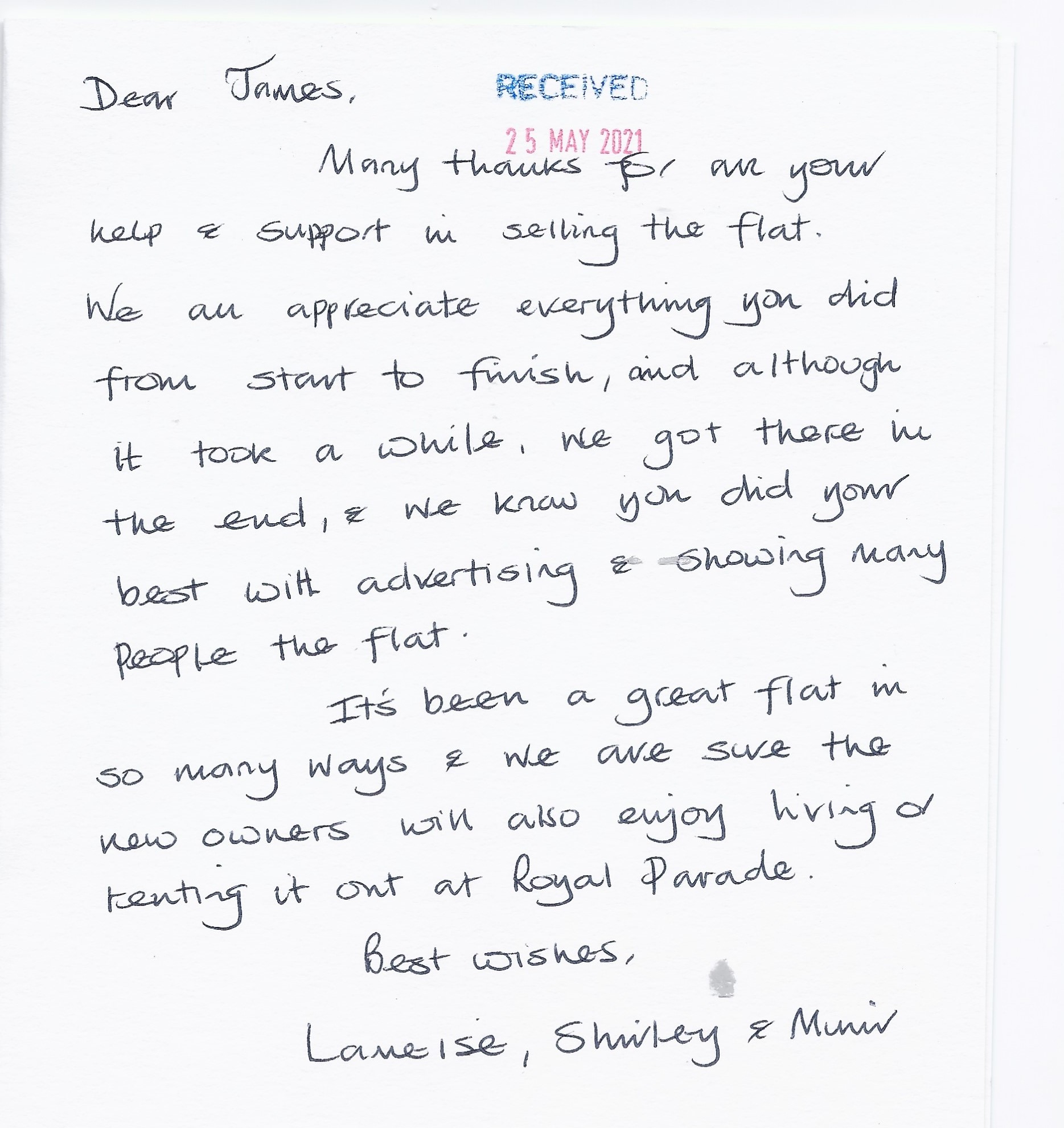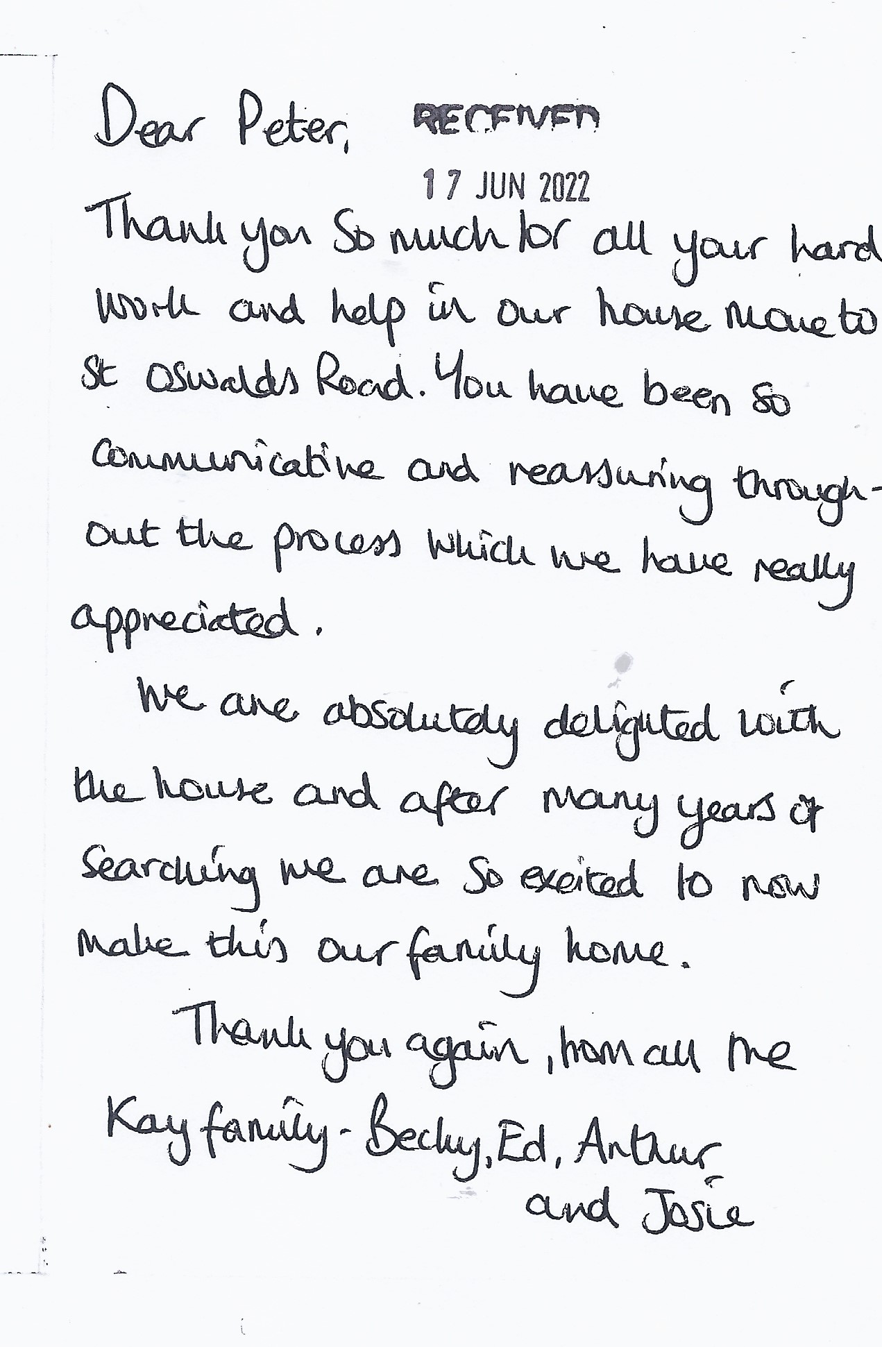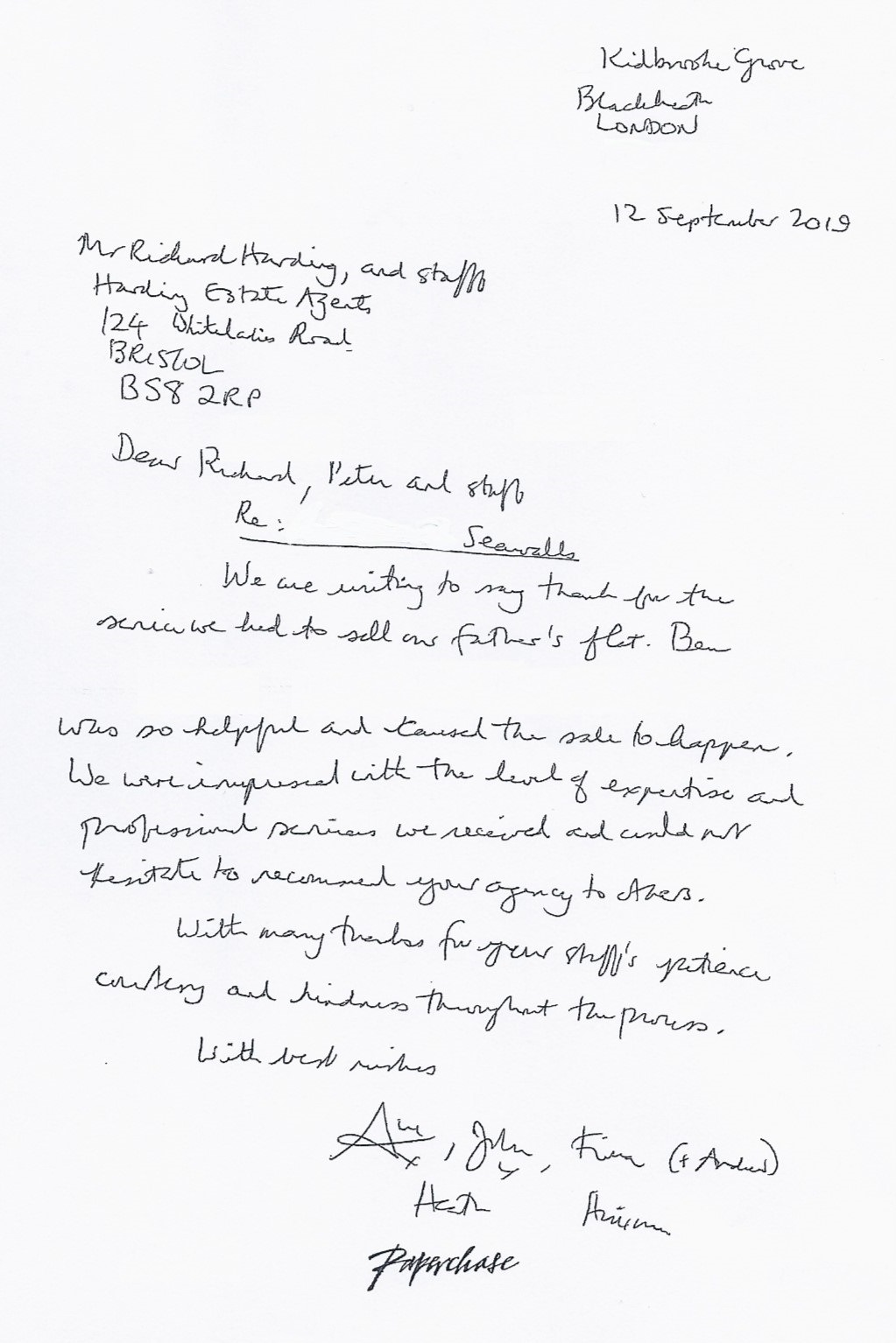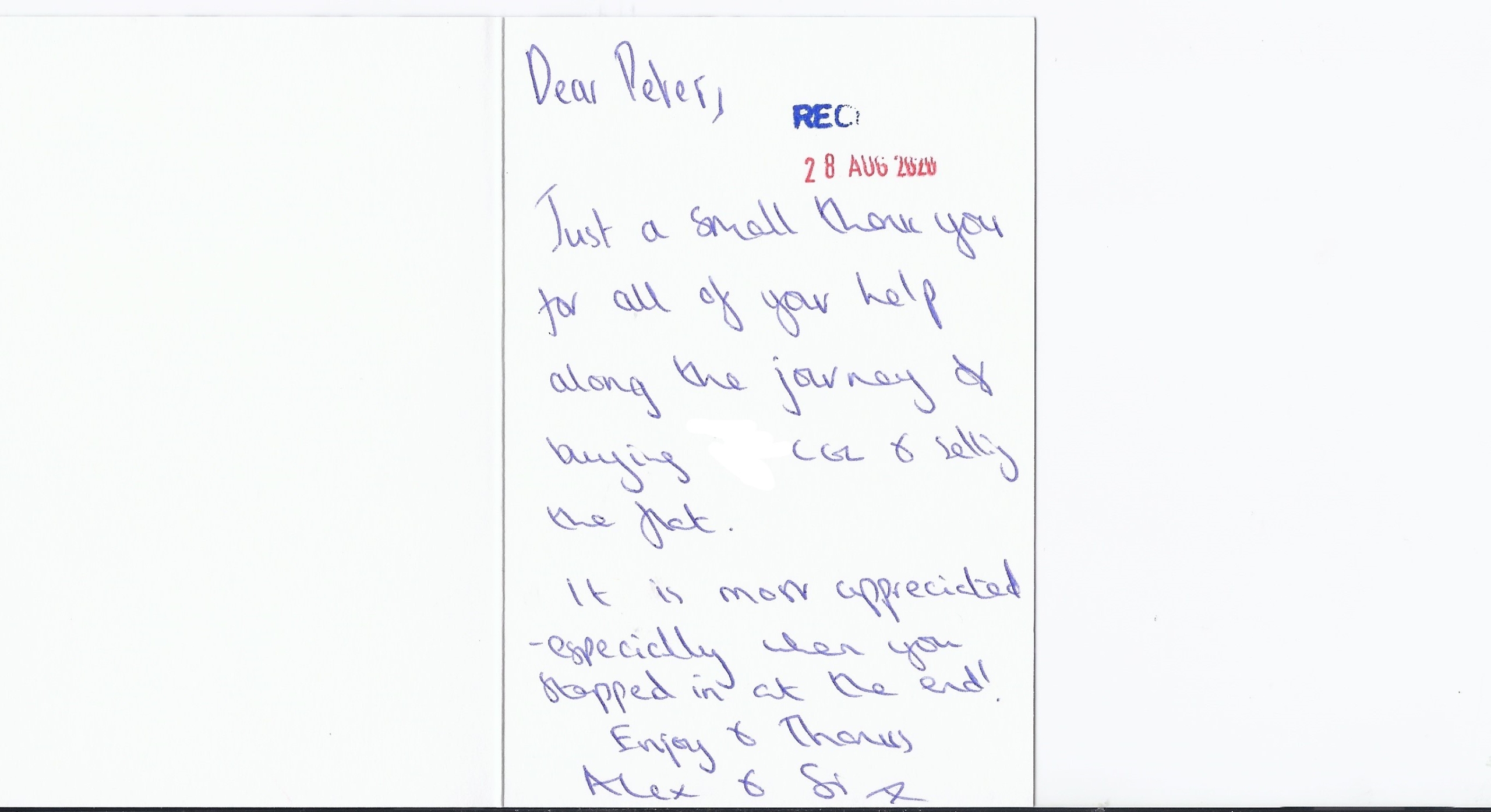 You are welcome to inspect any of the original letters, cards and emails which are held on file in our office or speak to any one of our clients – with their permission – regarding their personal experience of moving with Richard Harding. These testimonials date from the present back to our early years so that you can see we have consistently maintained high standards.
