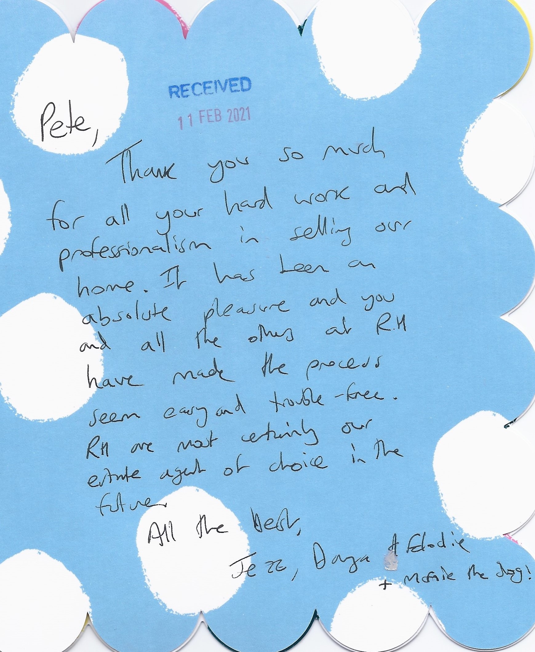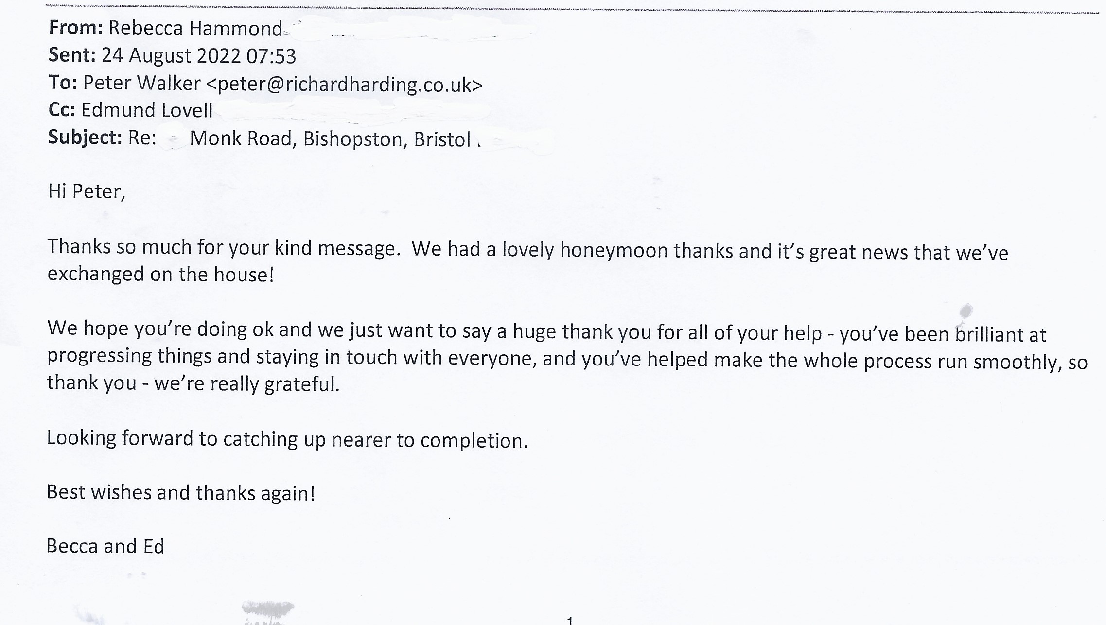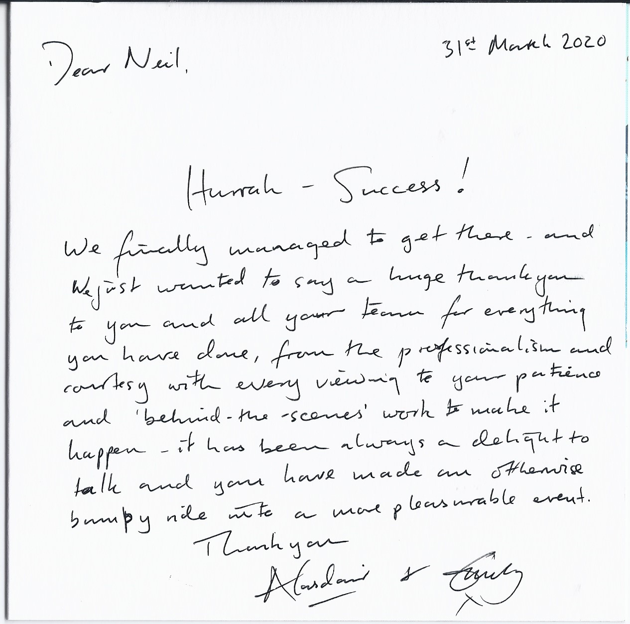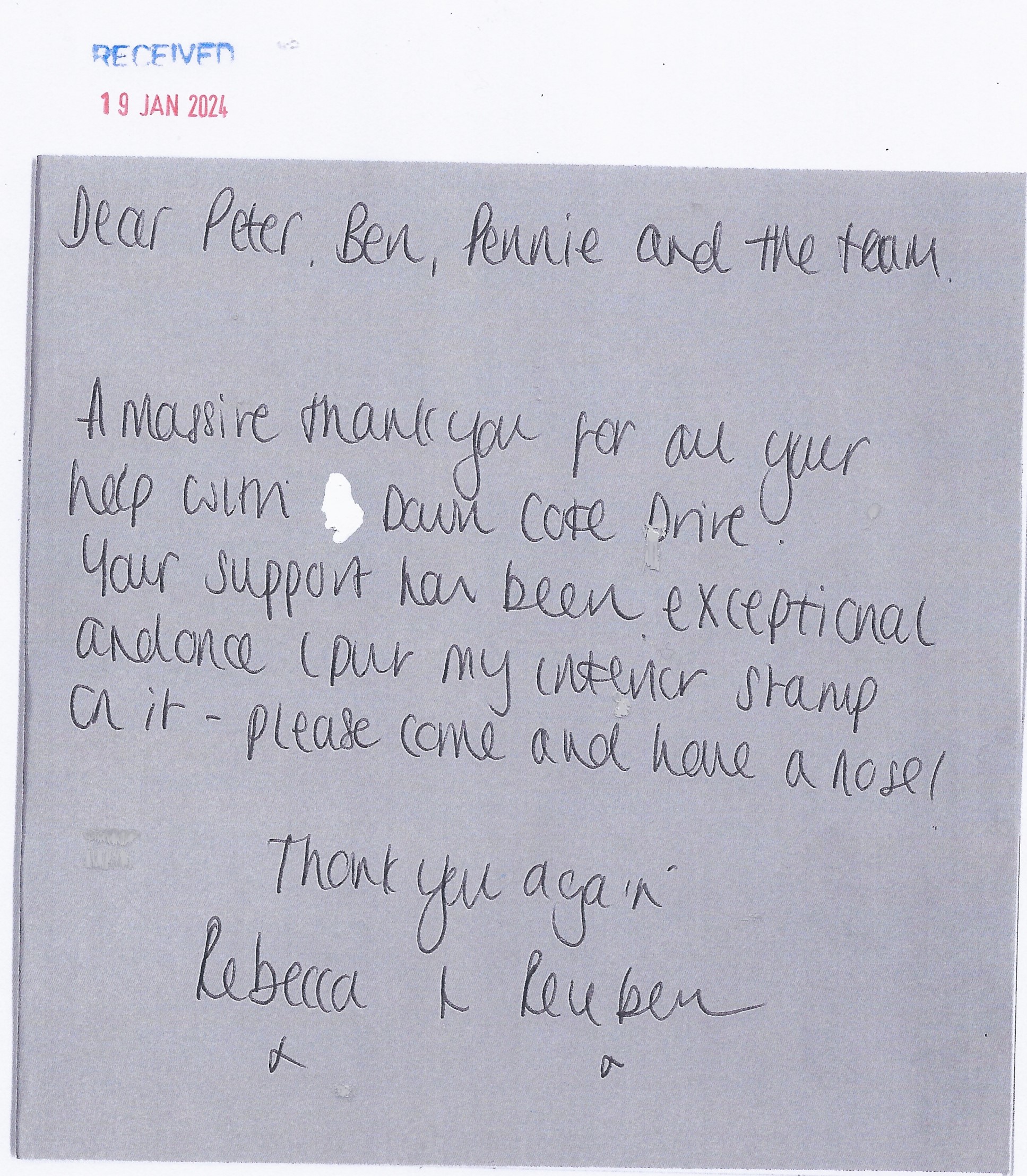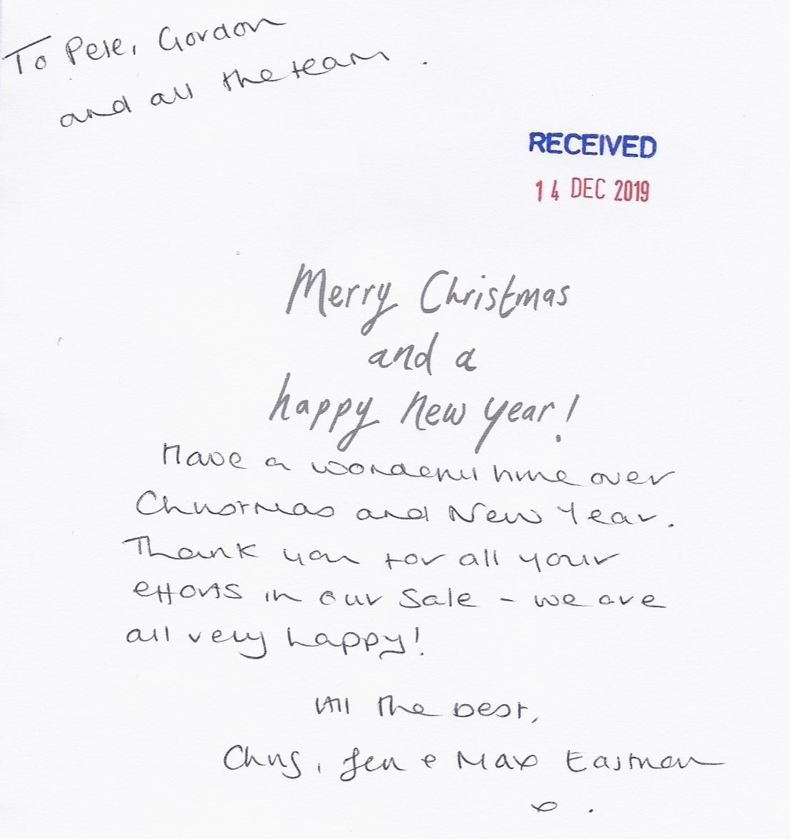 You are welcome to inspect any of the original letters, cards and emails which are held on file in our office or speak to any one of our clients – with their permission – regarding their personal experience of moving with Richard Harding. These testimonials date from the present back to our early years so that you can see we have consistently maintained high standards.