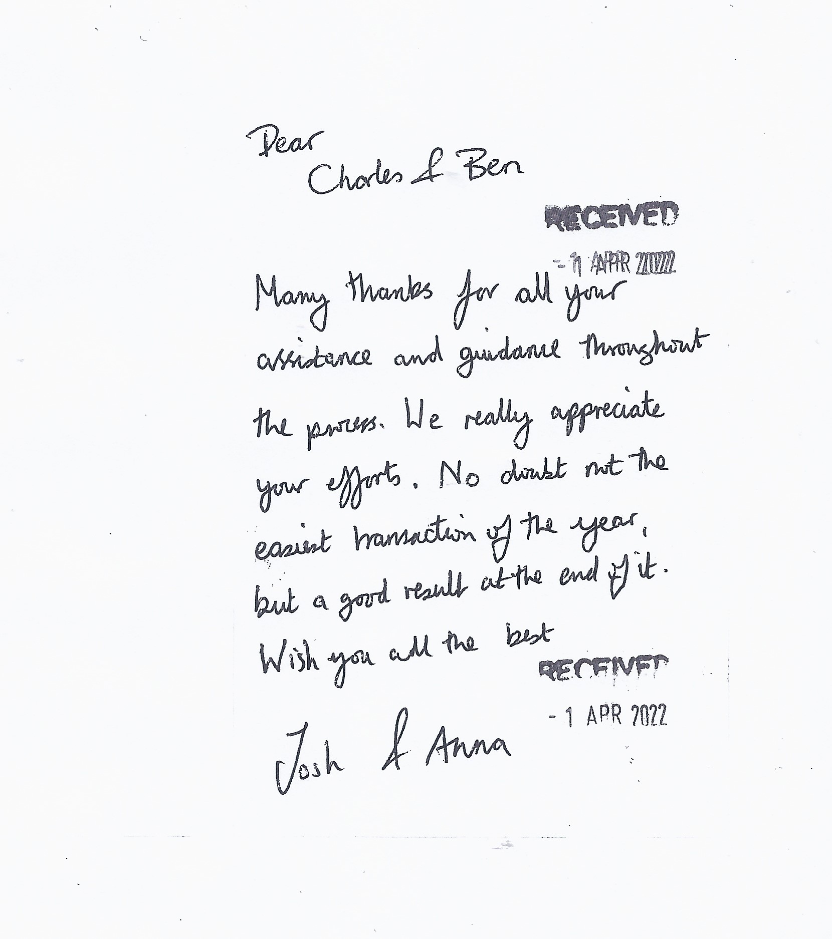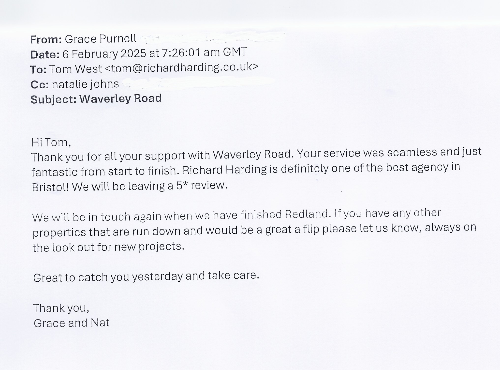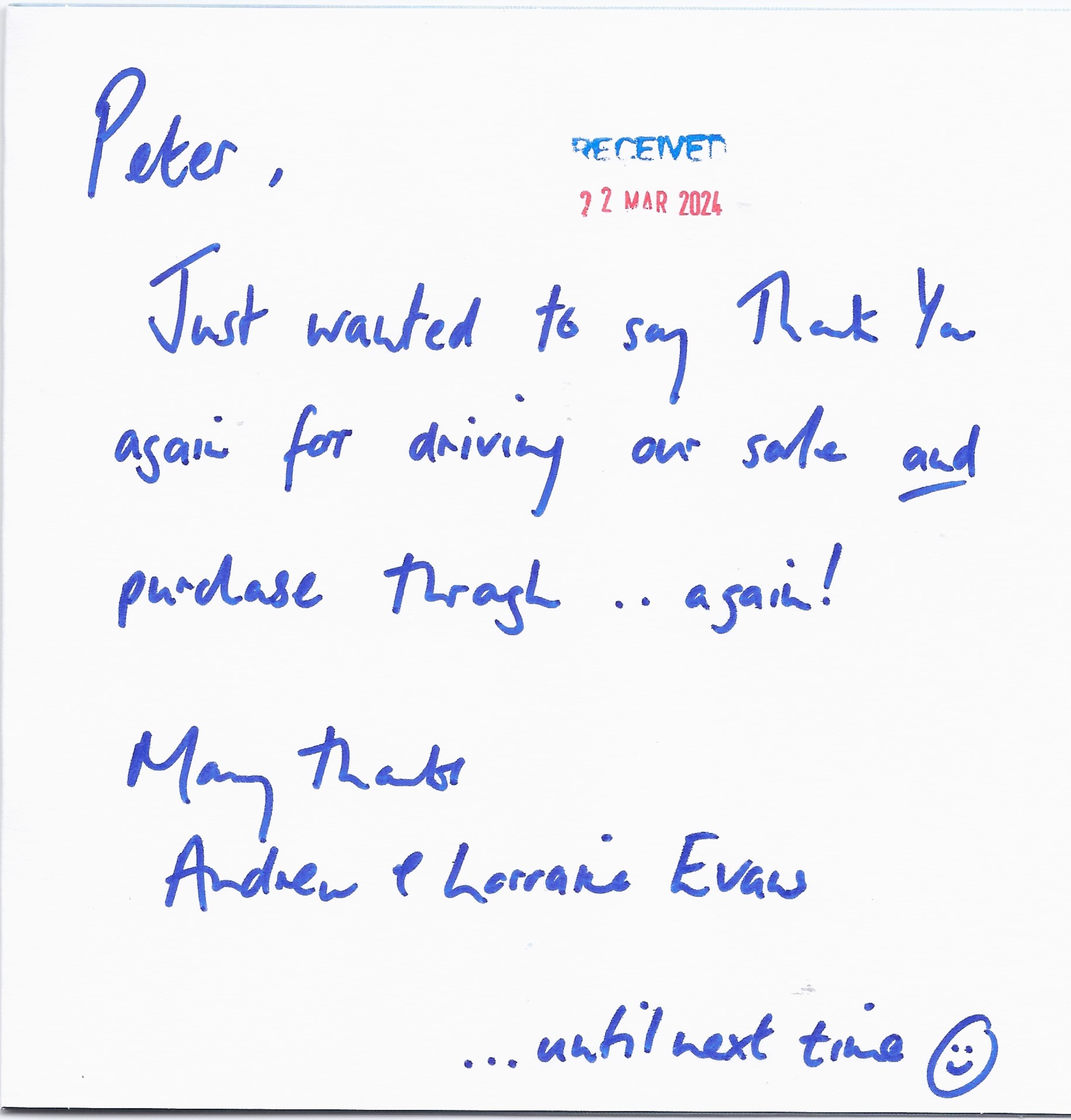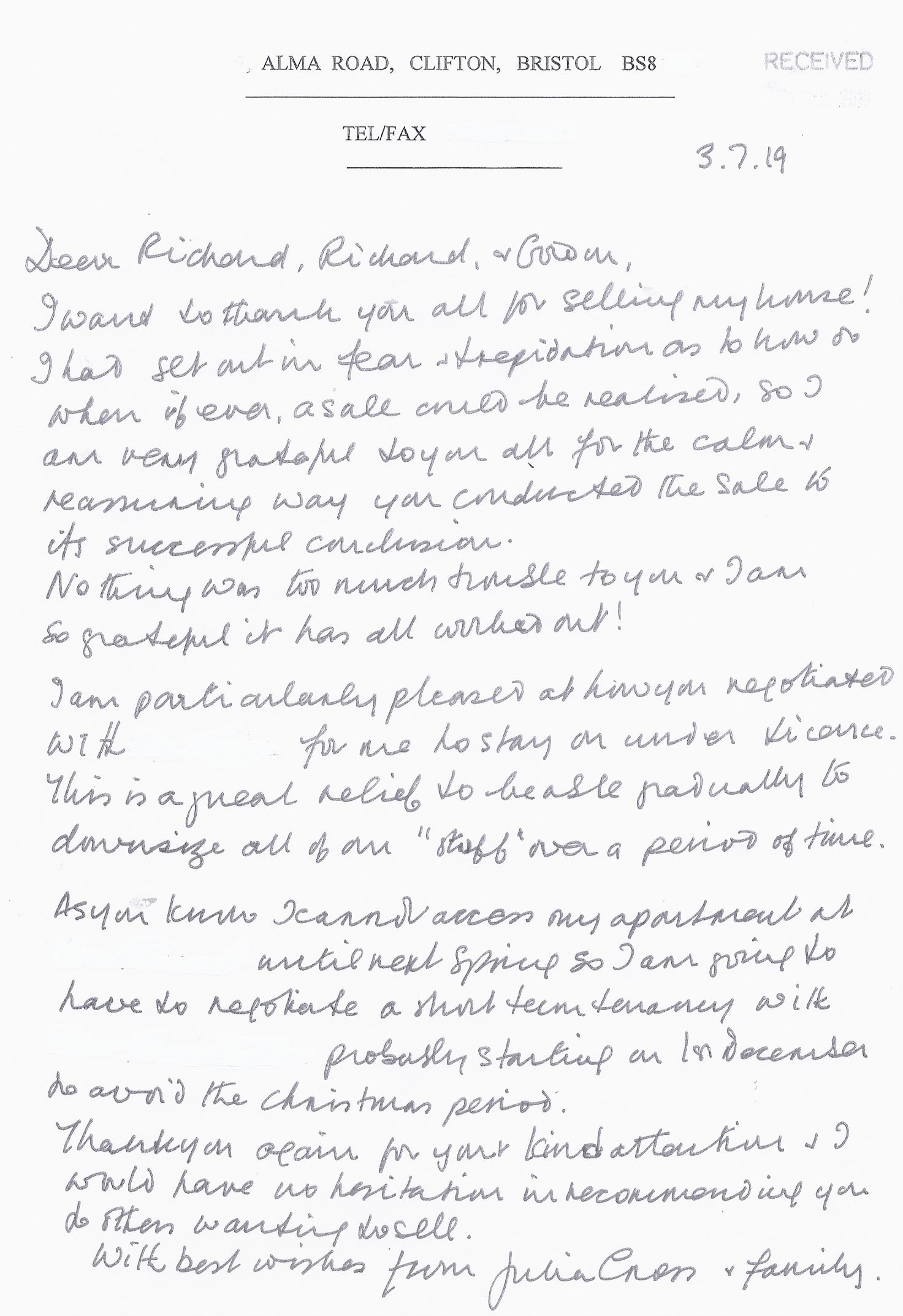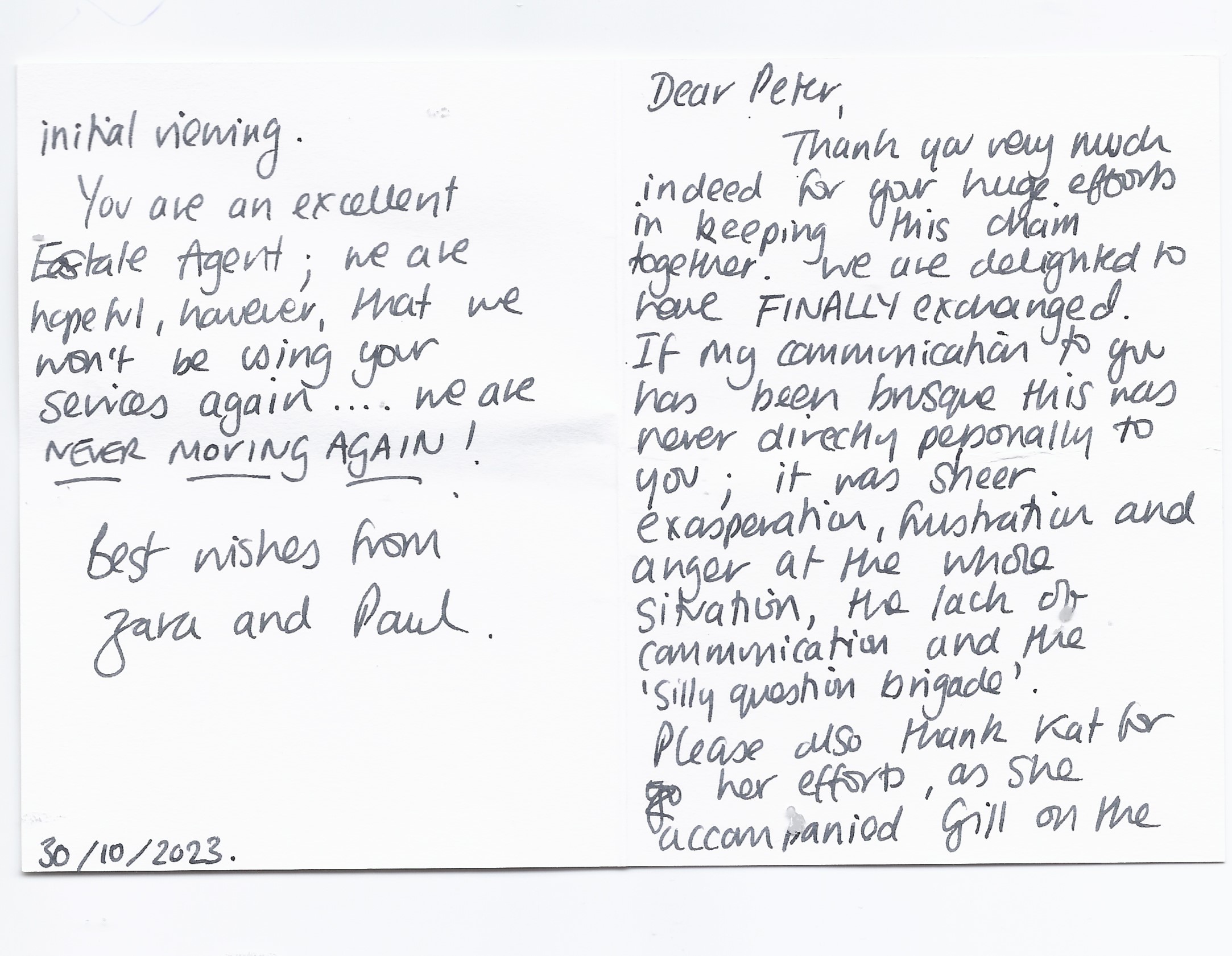 You are welcome to inspect any of the original letters, cards and emails which are held on file in our office or speak to any one of our clients – with their permission – regarding their personal experience of moving with Richard Harding. These testimonials date from the present back to our early years so that you can see we have consistently maintained high standards.